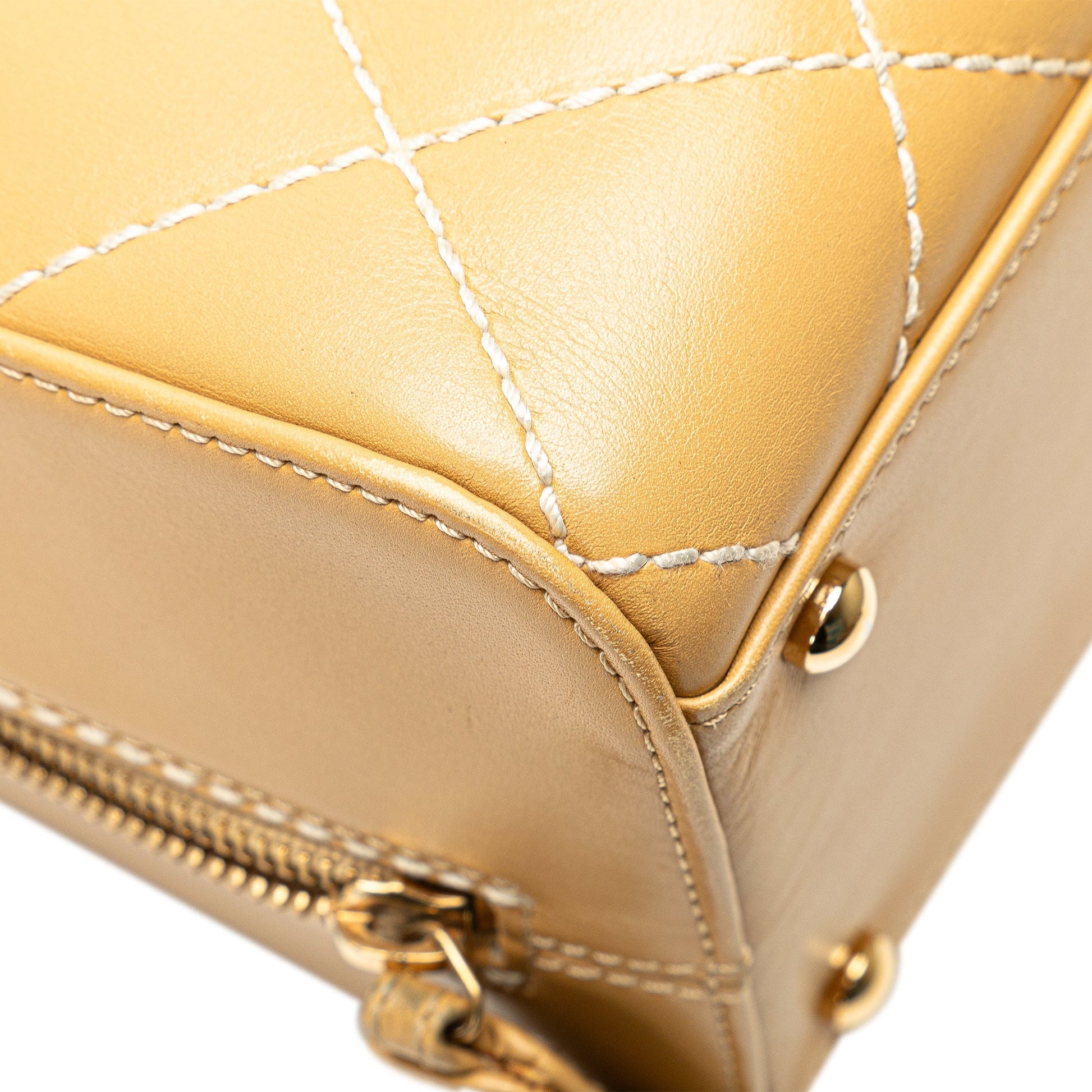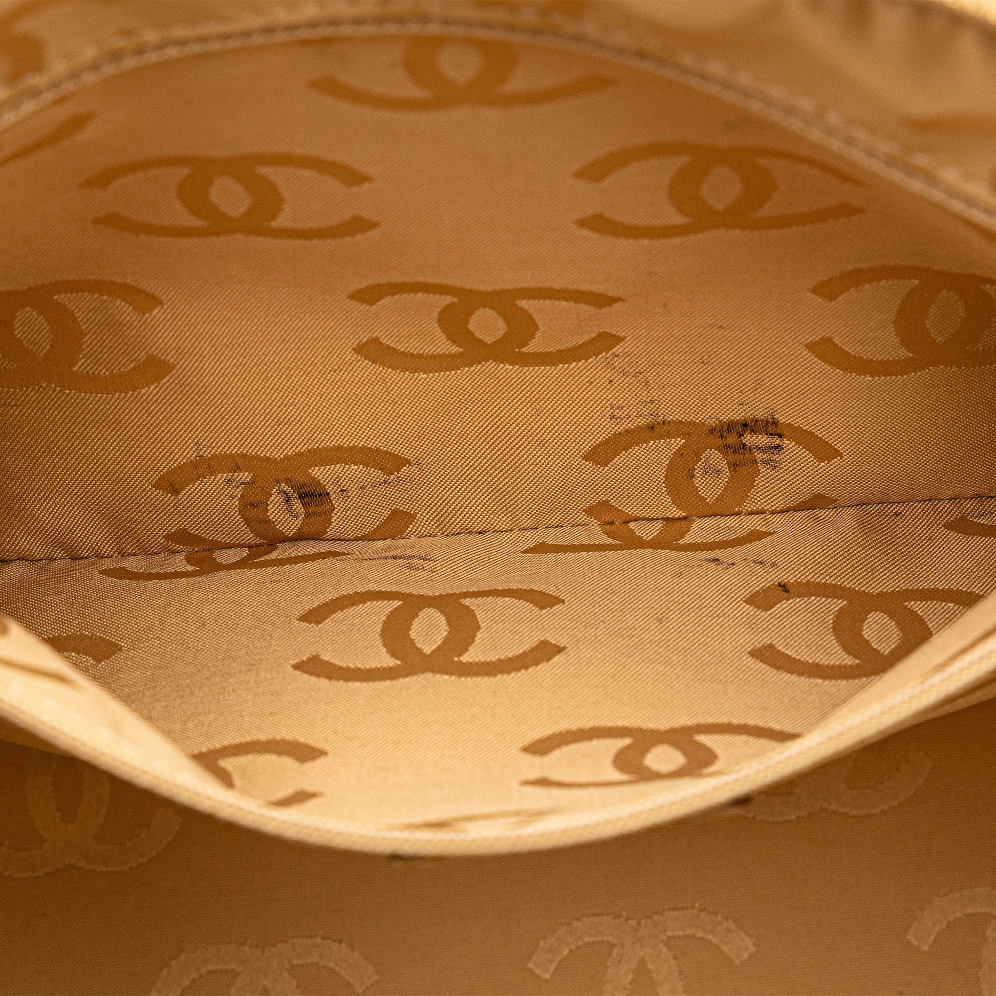 Product Details: Brown Chanel CC Wild Stitch Handbag. This handbag features a wild stitch quilted leather body, exterior back open pocket, flat handles, gold-tone hardware, a zip around closure, and an interior zip and slip pocket. 10.2" L x 12.2" W x 5.1" D, 6.7" drop. Serial number 7523936.