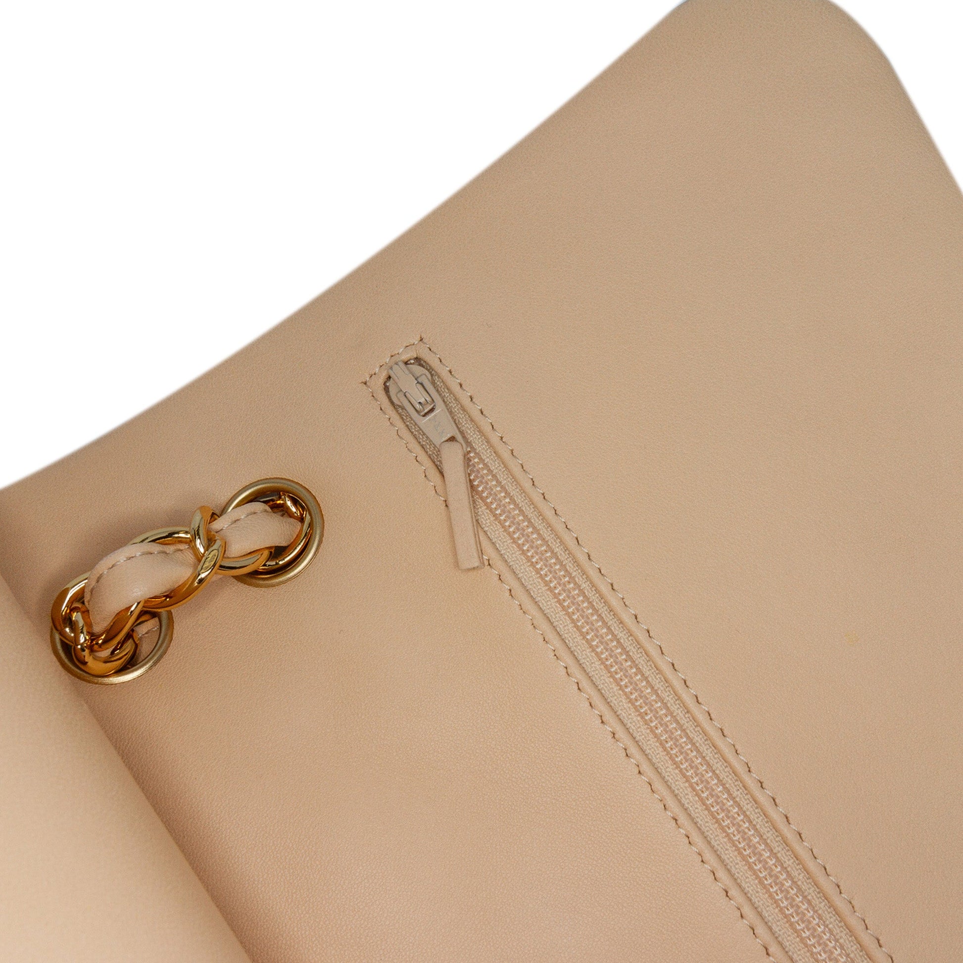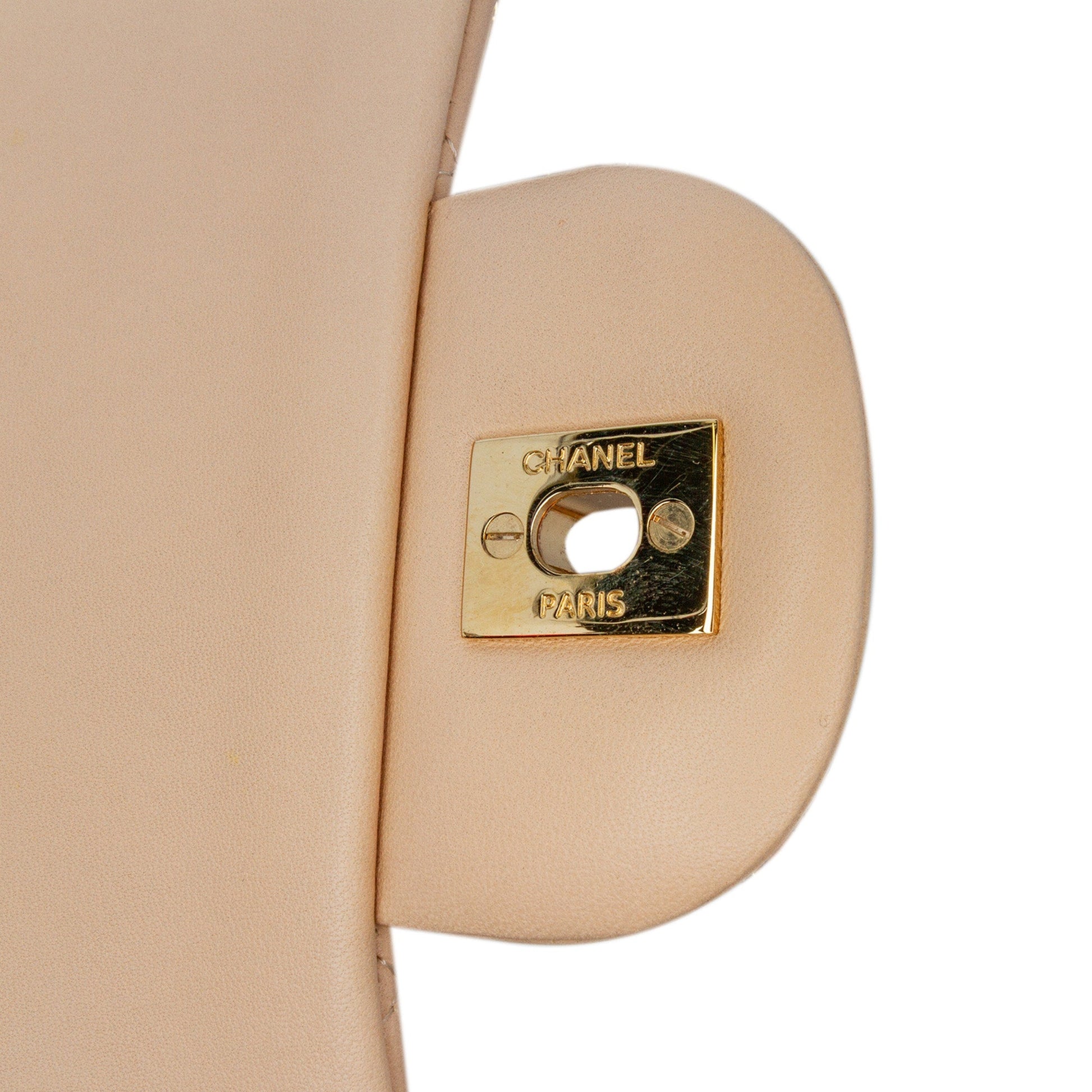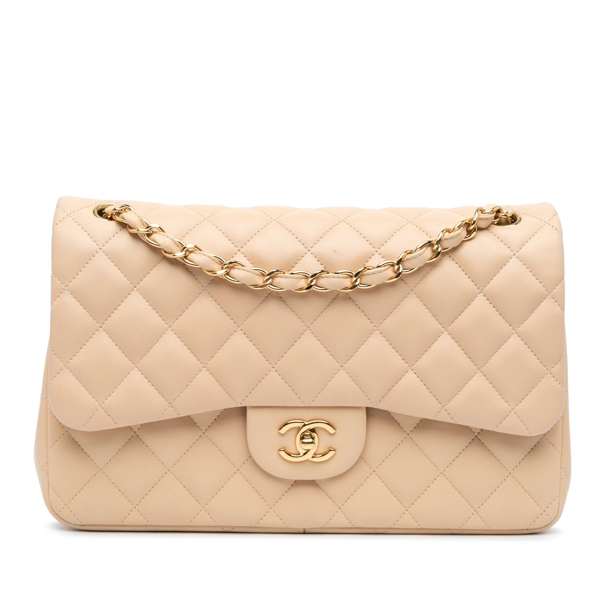 Product Details: Brown Chanel Jumbo Classic Lambskin Double Flap Shoulder Bag. The Classic Jumbo Flap features lambskin leather, chain straps, a front flap with interlocking Cs twist lock closure, an exterior back pocket, and interior zip and open pockets. 7.9" L x 11.8" W x 3.5" D, 13.4" drop. Serial number 14539503.