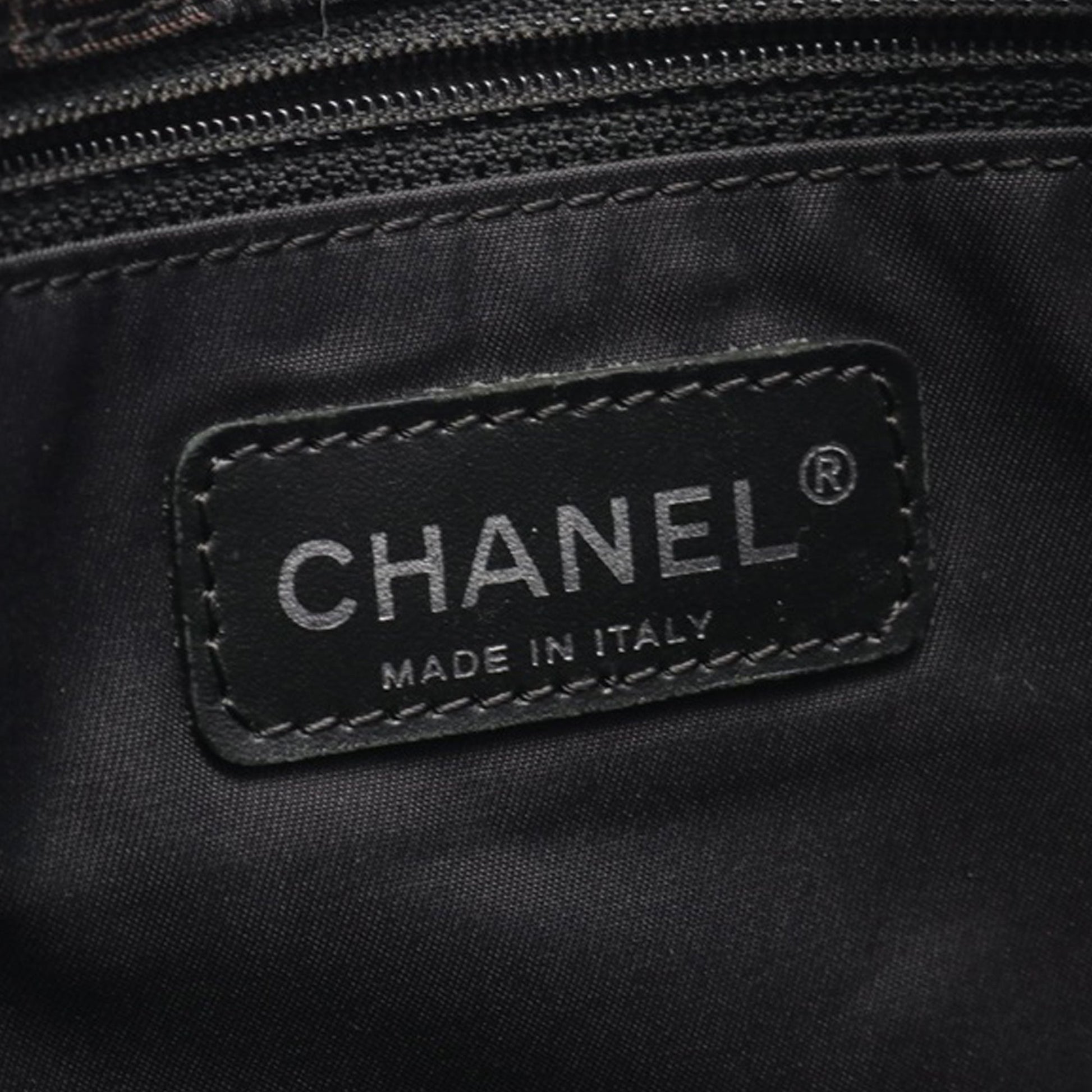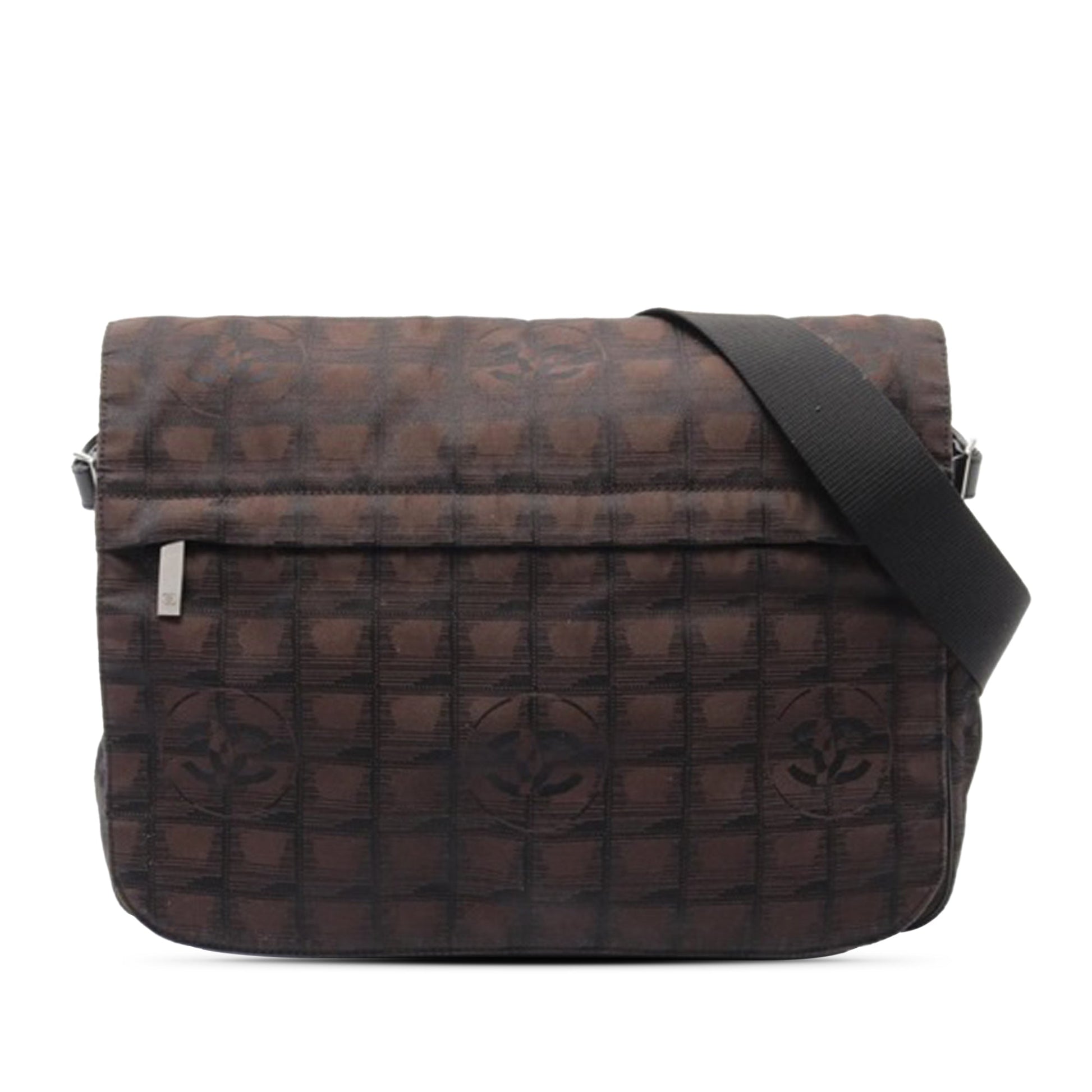Product Details: Brown Chanel New Travel Line Crossbody. This crossbody bag features a nylon body with leather trim, a flat shoulder strap, a front flap with magnetic closure, an exterior front zip pocket, and an interior zip pocket. 11.4" L x 13.4" W x 3.5" D. Serial number 10078337.