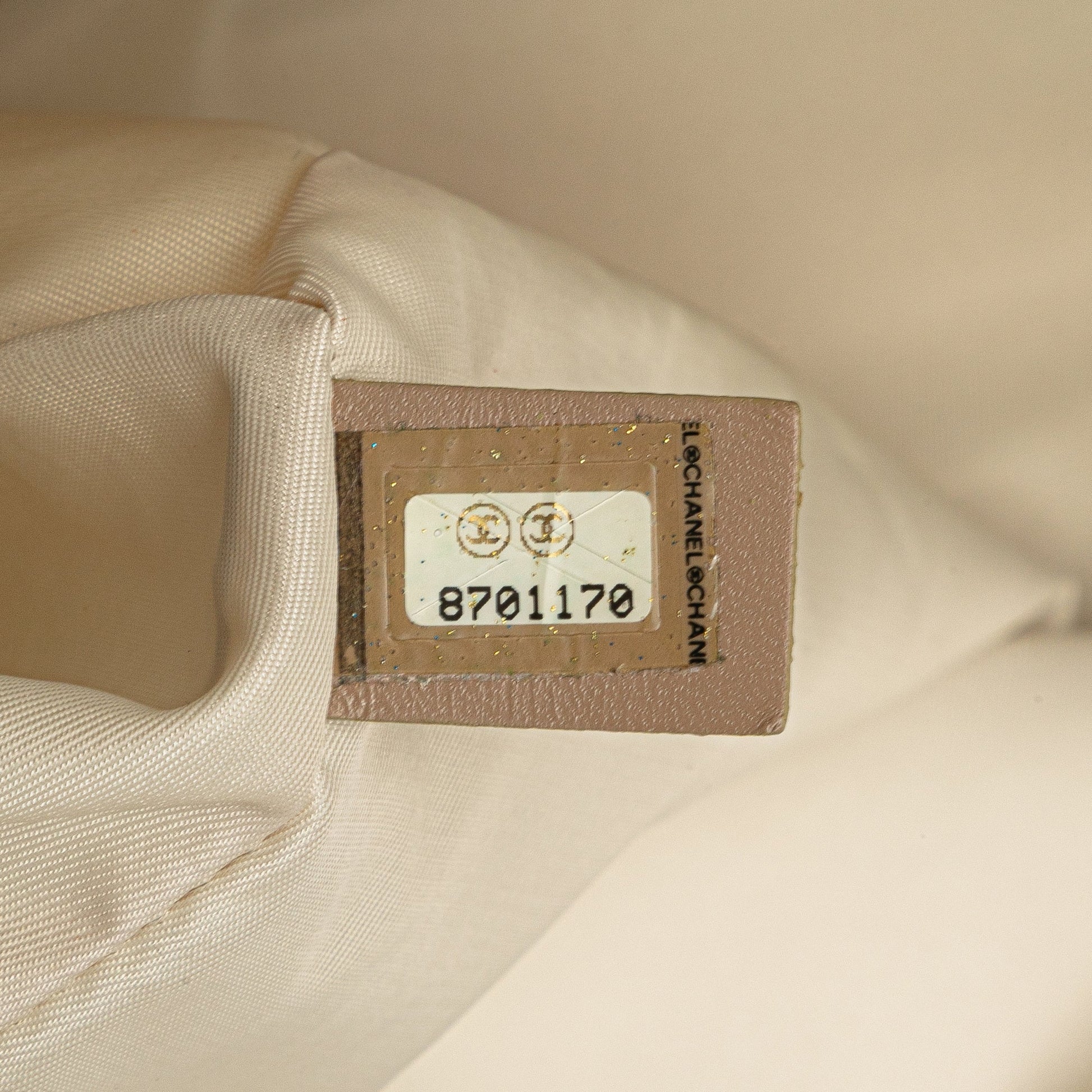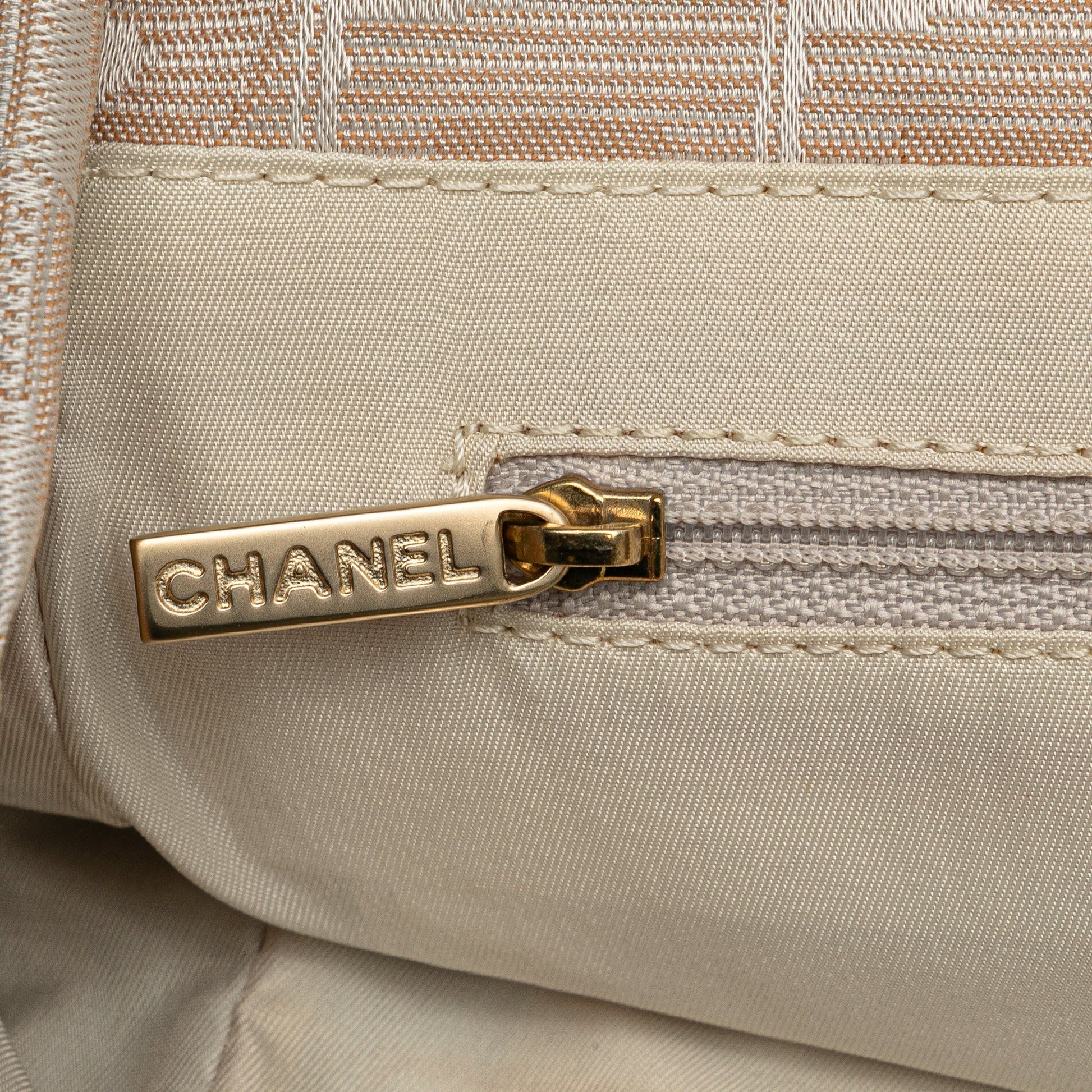 Product Details: Brown Chanel New Travel Line Nylon Tote. This tote bag features a nylon body with leather trim, flat leather straps, an open top, and interior zip pockets. 10.2" L x 13.6" W x 5.9" D, 7.1" drop. Serial number 8701170.