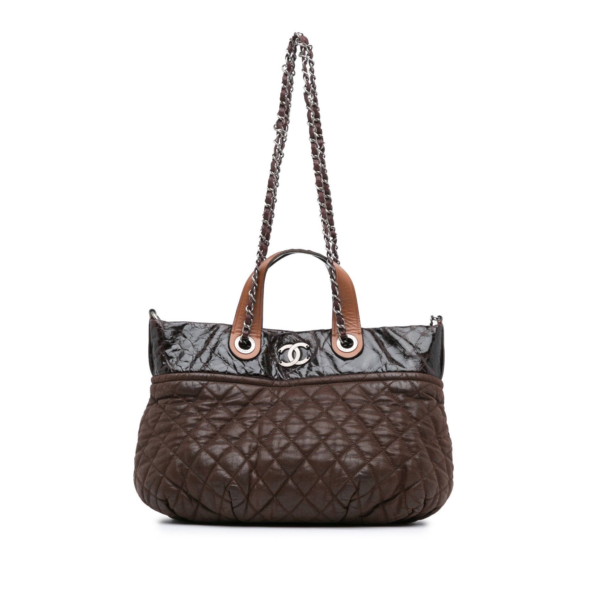 Product Details: Brown Chanel Quilted Iridescent Calfskin In The Mix Satchel. The In The Mix satchel features a quilted leather body, leather woven chain straps, flat leather top handles, an open top with snap button closure, and interior zip and slip pockets. 9.1" L x 15" W x 7.9" D, 3.5" drop. Serial number 13928117.