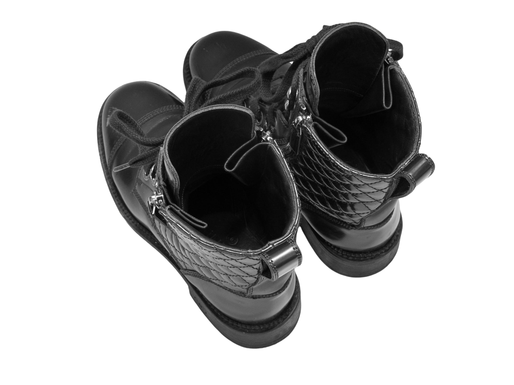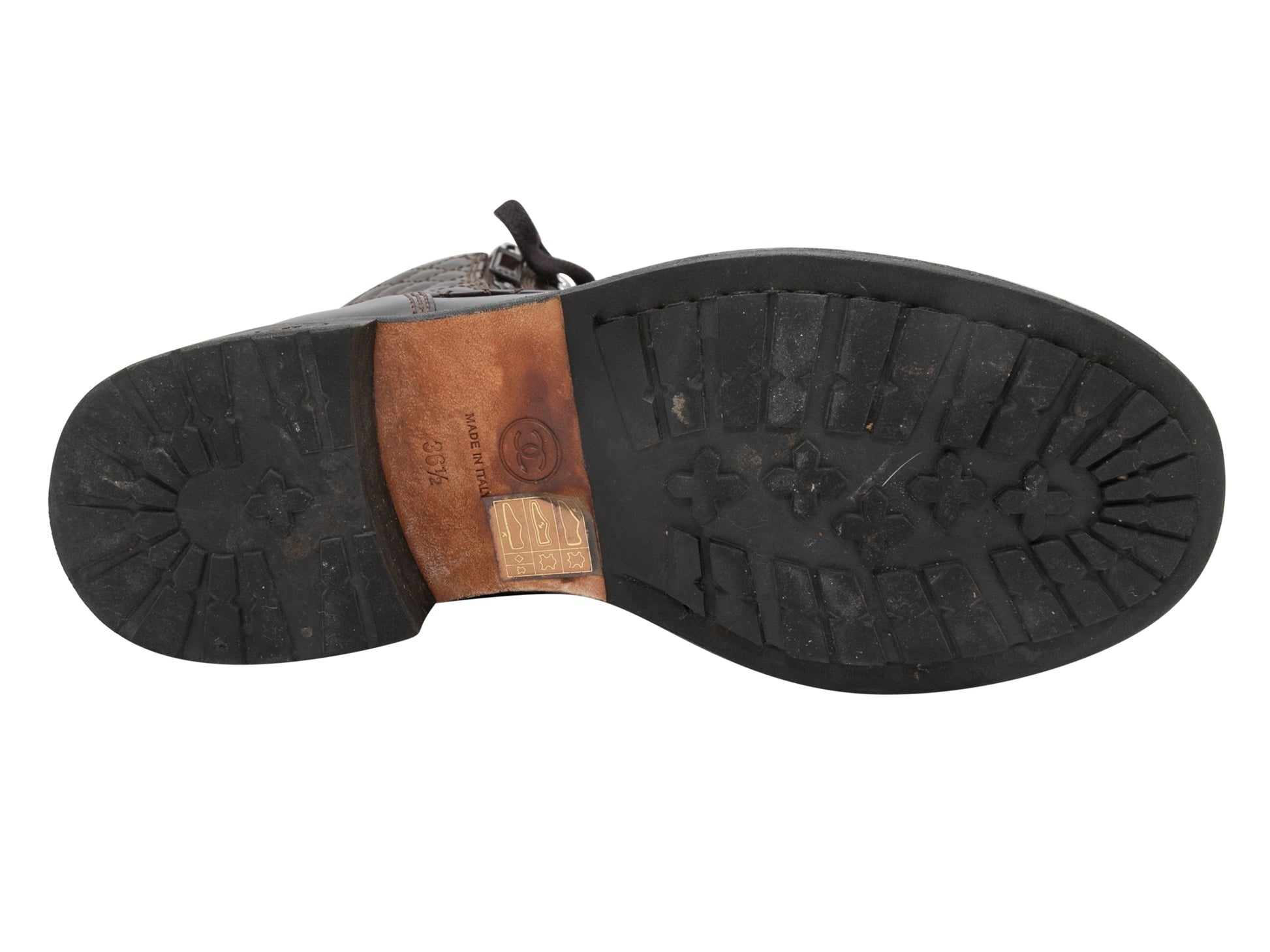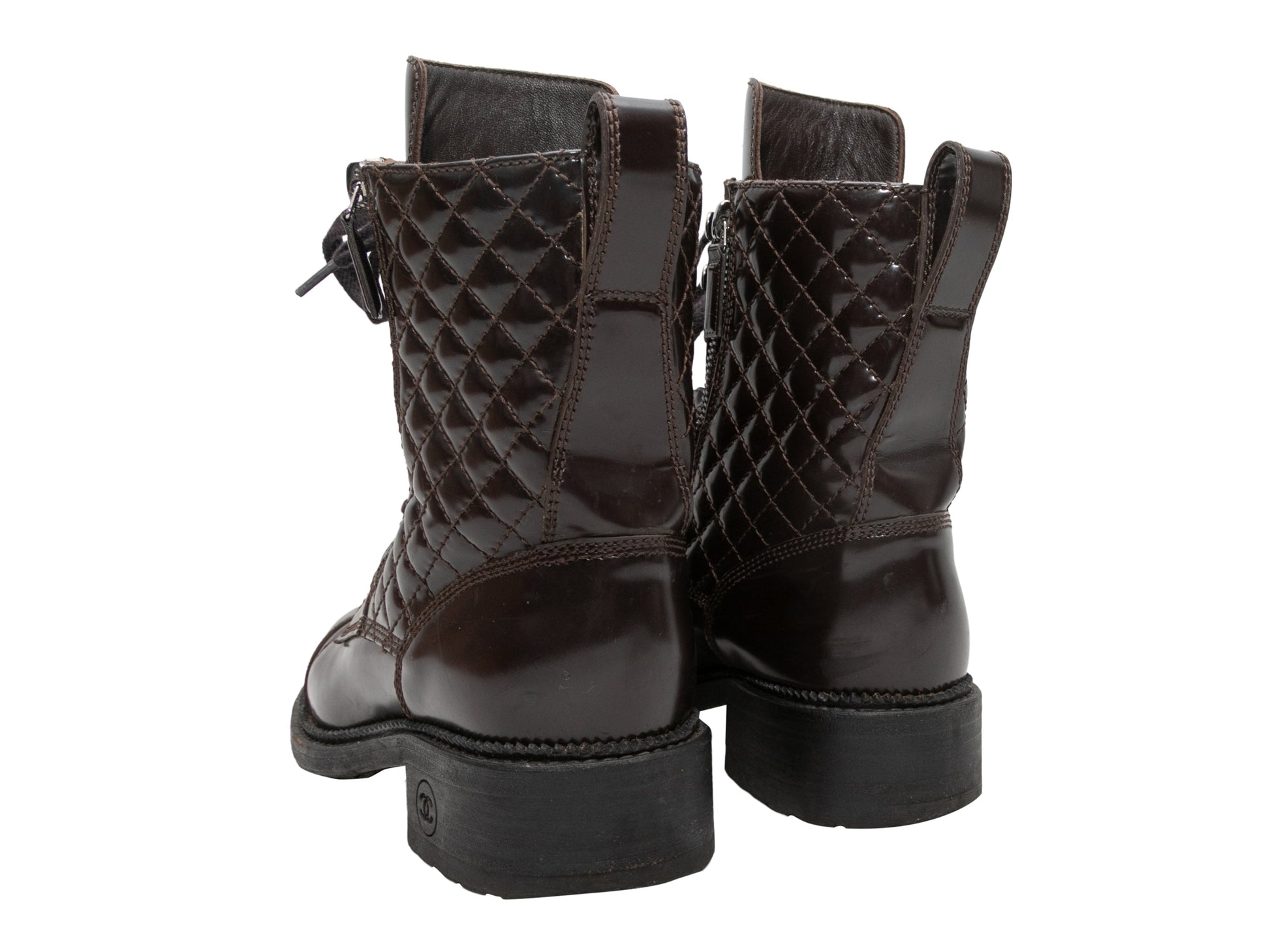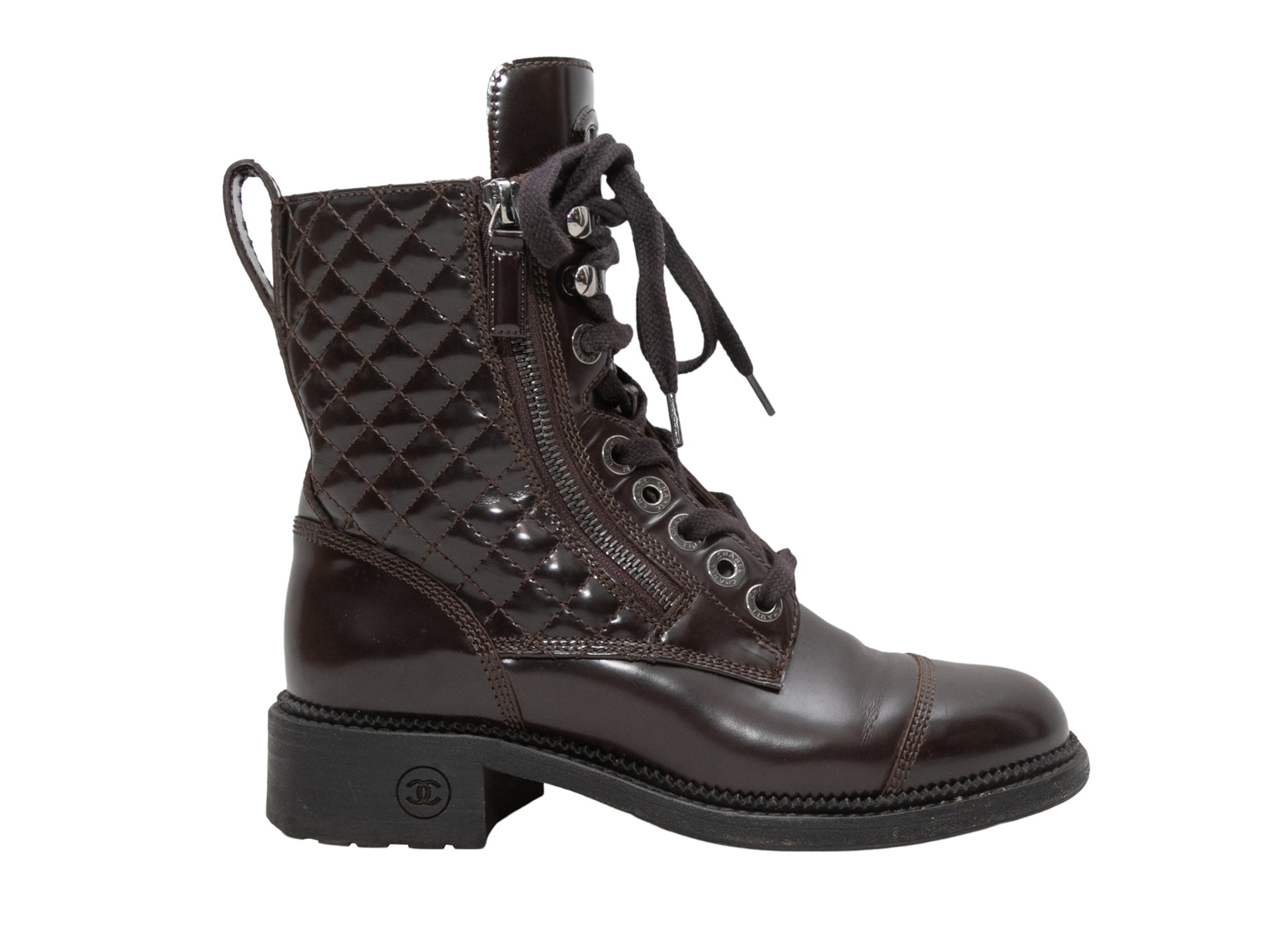 Product Details: Brown quilted patent leather combat boots by Chanel. Silver-tone hardware. Lace-up tie detailing at tops. Zip closures at sides. 6" shaft height, 0.5" platform height, 1.5" heel height.