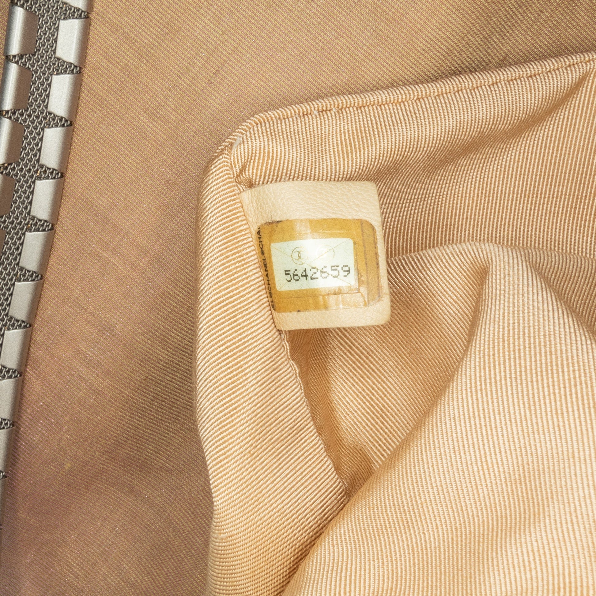 Product Details: Brown Chanel Reissue 2.55 Iridescent Chocolate Bar Shoulder Bag. This shoulder bag features an iridescent fabric body, chain-link shoulder straps, a front flap with twist lock closure, and an interior slip pocket. 6.7" L x 9.8" W x 2.4" D. Serial number 5642659.