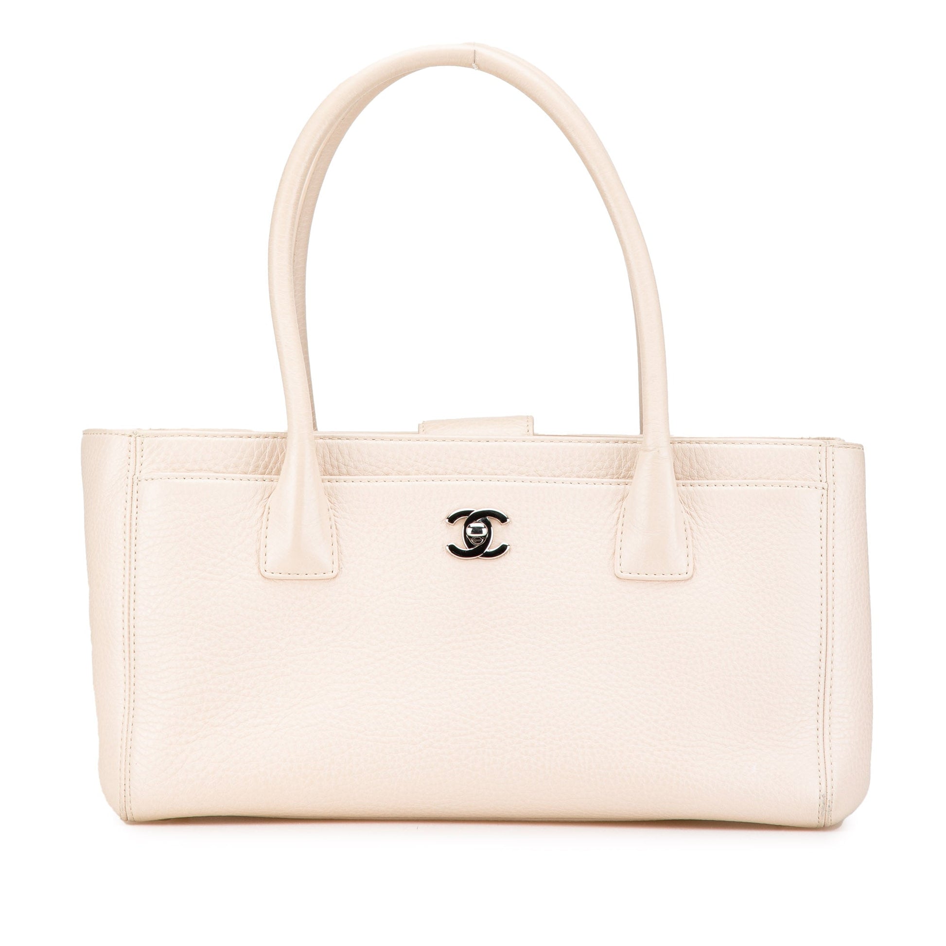 Product Details: Brown Chanel Small Calfskin Executive Cerf Tote. The Executive Cerf tote features a calf leather body, rolled leather handles, an open top with a front tab and a twist lock closure, exterior slip pockets, and an interior zip pocket. 6.7" L x 12.2" W x 5.1" D, 6.7" drop. Serial number 19161875.
