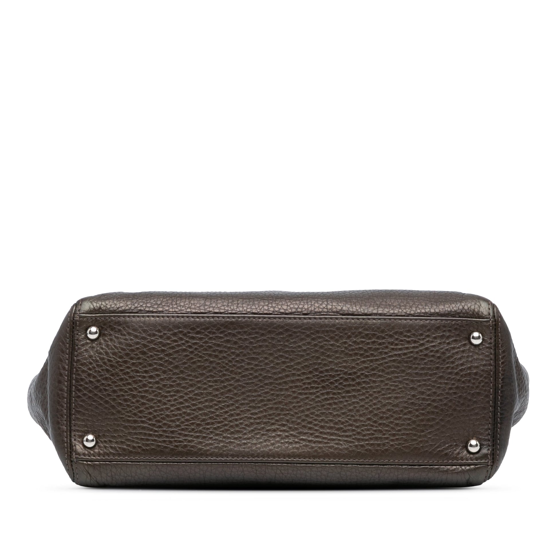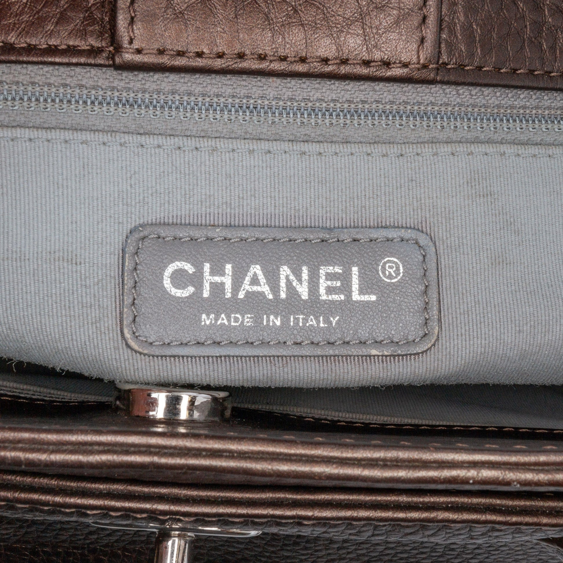 Product Details: Brown Chanel Small Metallic Calfskin Executive Cerf Tote. The Executive Cerf tote features a calf leather body, rolled leather handles, an open top with a front tab and a twist lock closure, an interior slip pocket, and interior zip pockets. 6.3" L x 11.8" W x 5.1" D, 8.3" drop. Serial number 19862988.