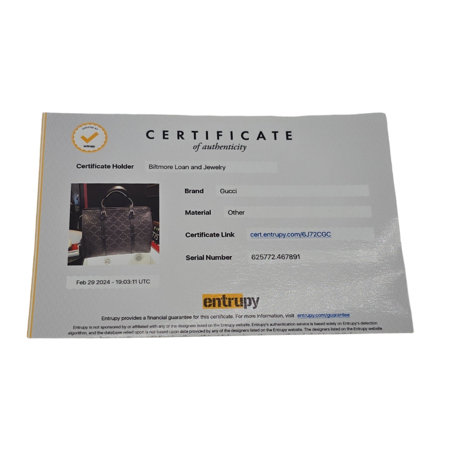 Includes: Dust Bag, Literature and Entrupy