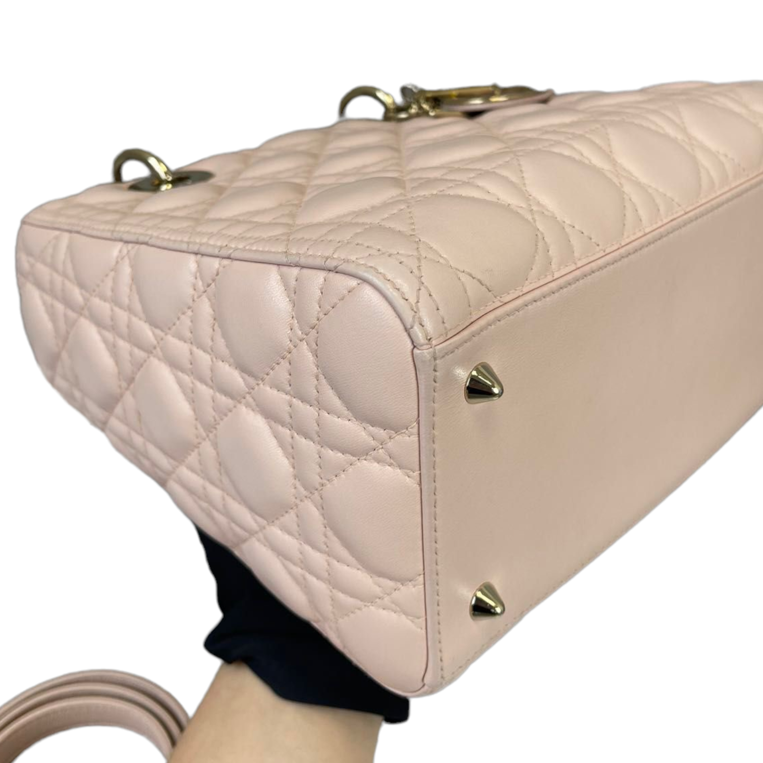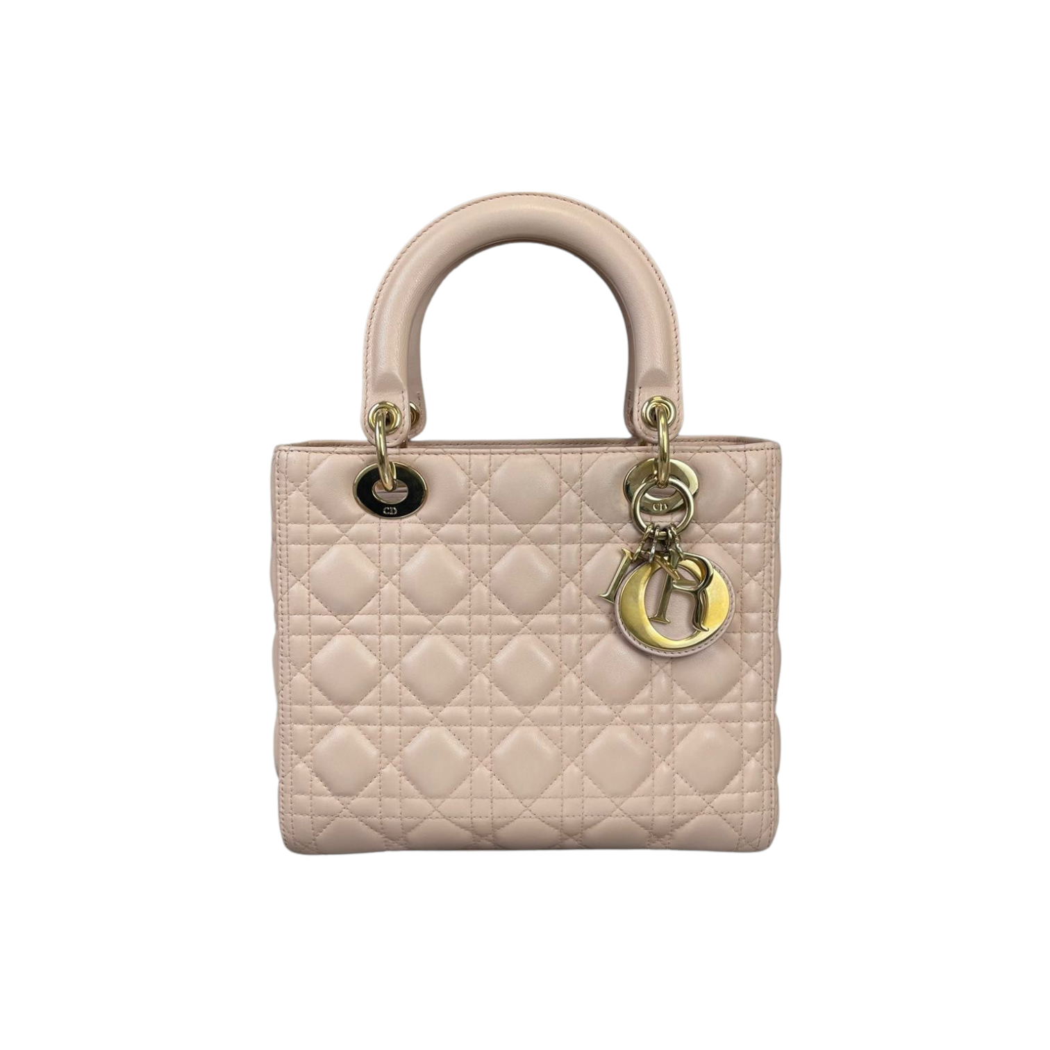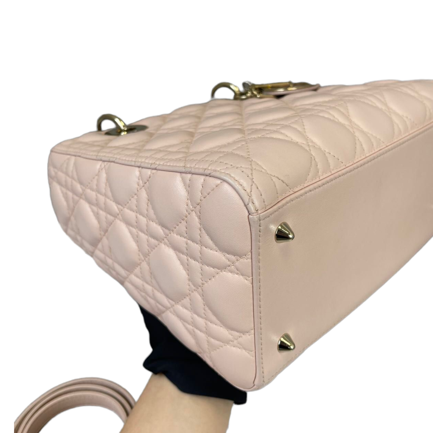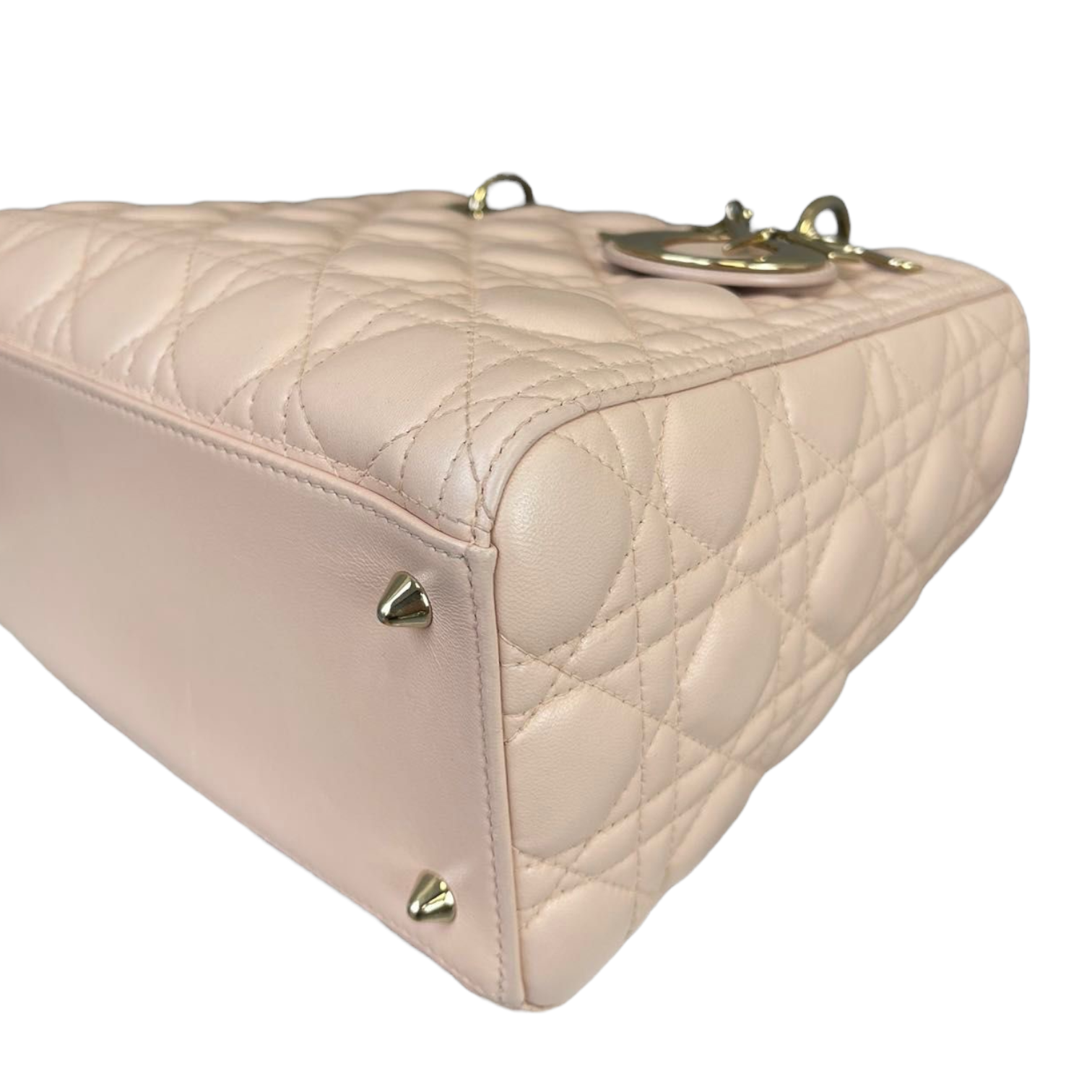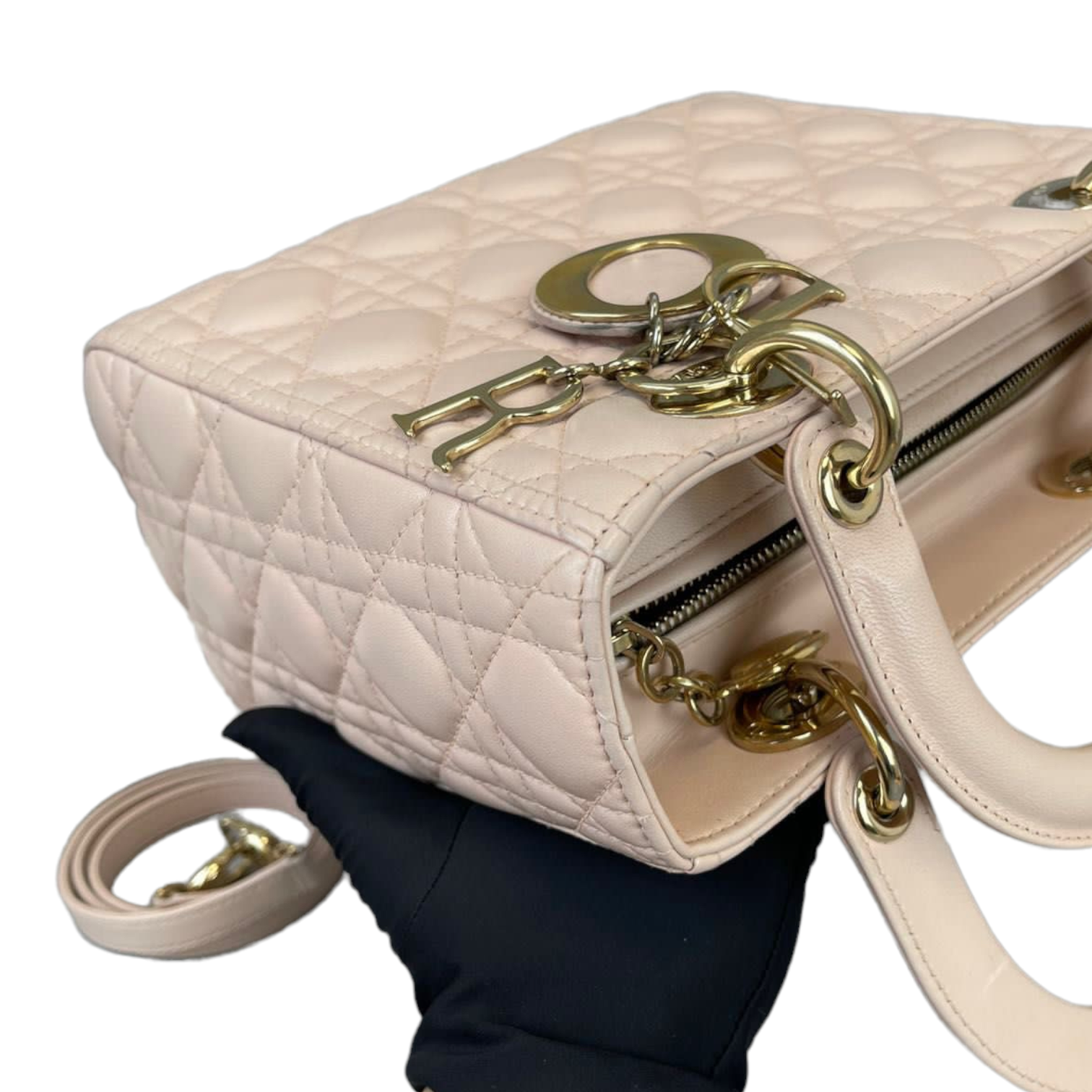 This Lady Dior in size mediumcomes in light pink lambskin leather featuring Gold hardware. This classic bag can be throughout the day but is perfect for your evening socials.