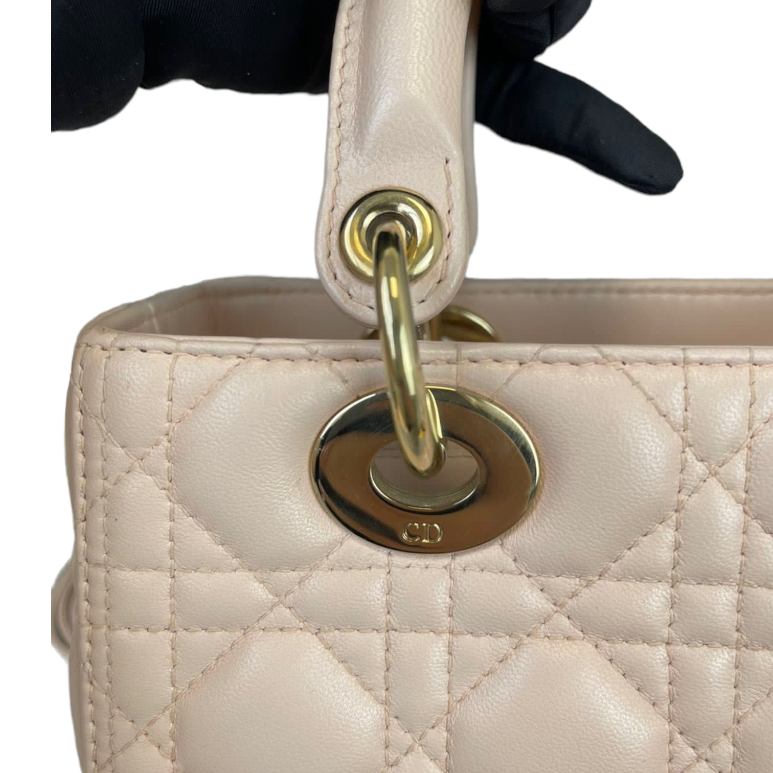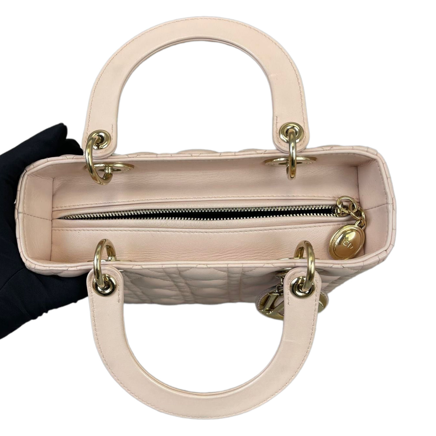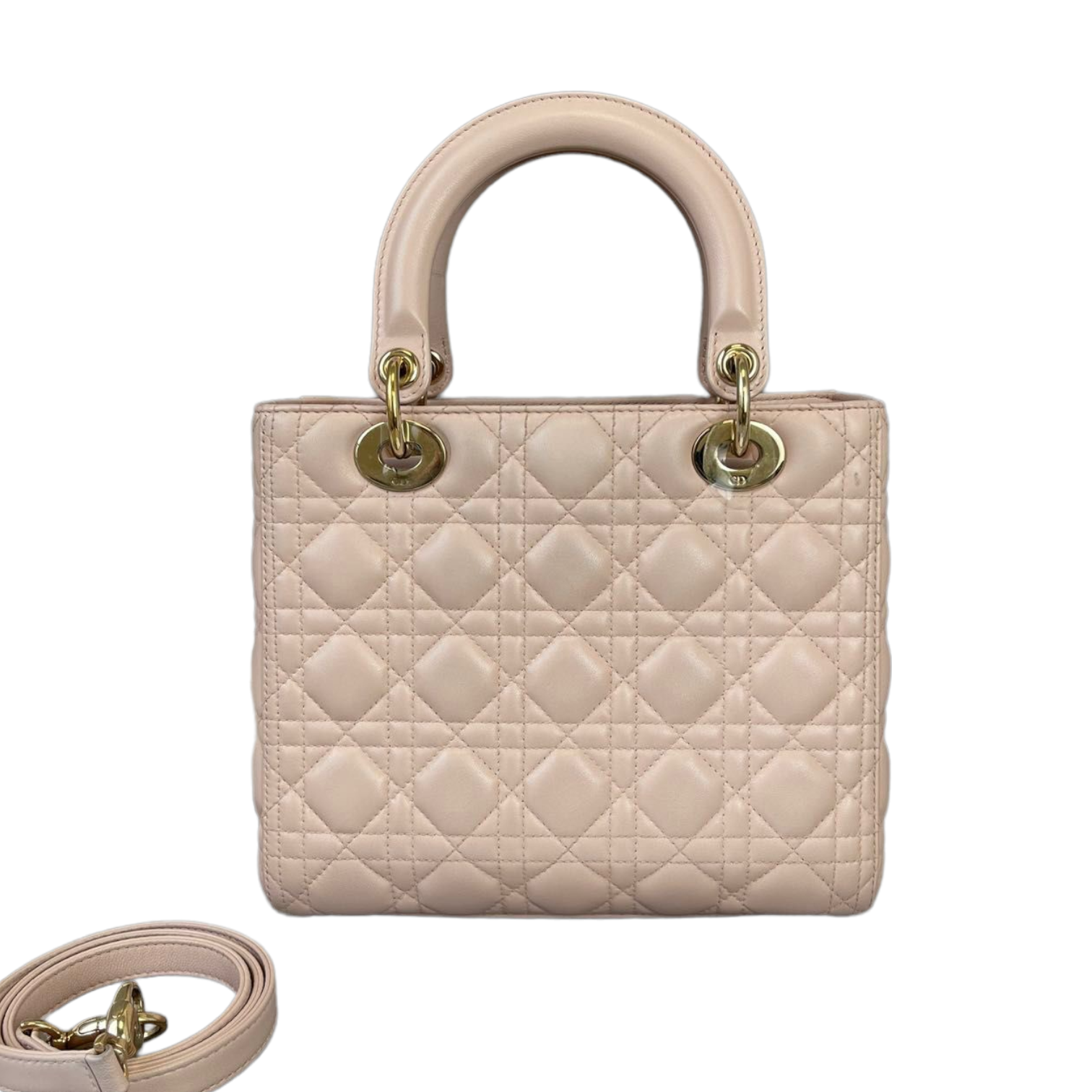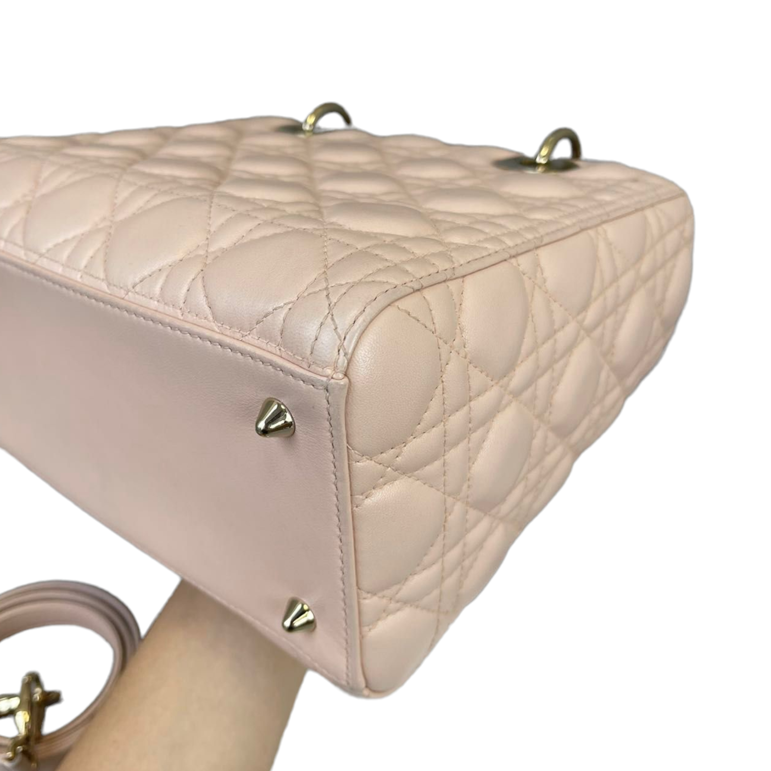 This Lady Dior in size mediumcomes in light pink lambskin leather featuring Gold hardware. This classic bag can be throughout the day but is perfect for your evening socials.