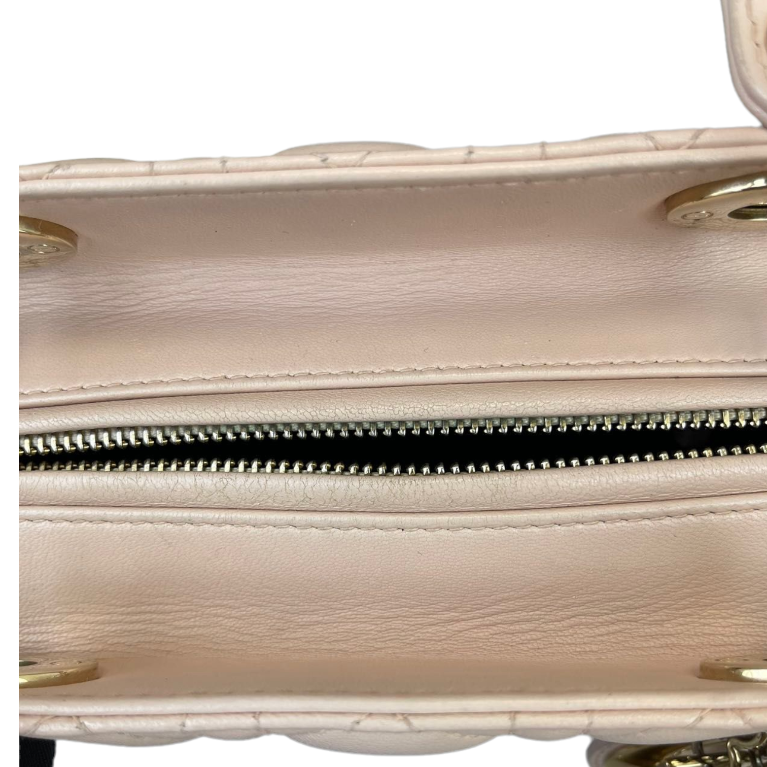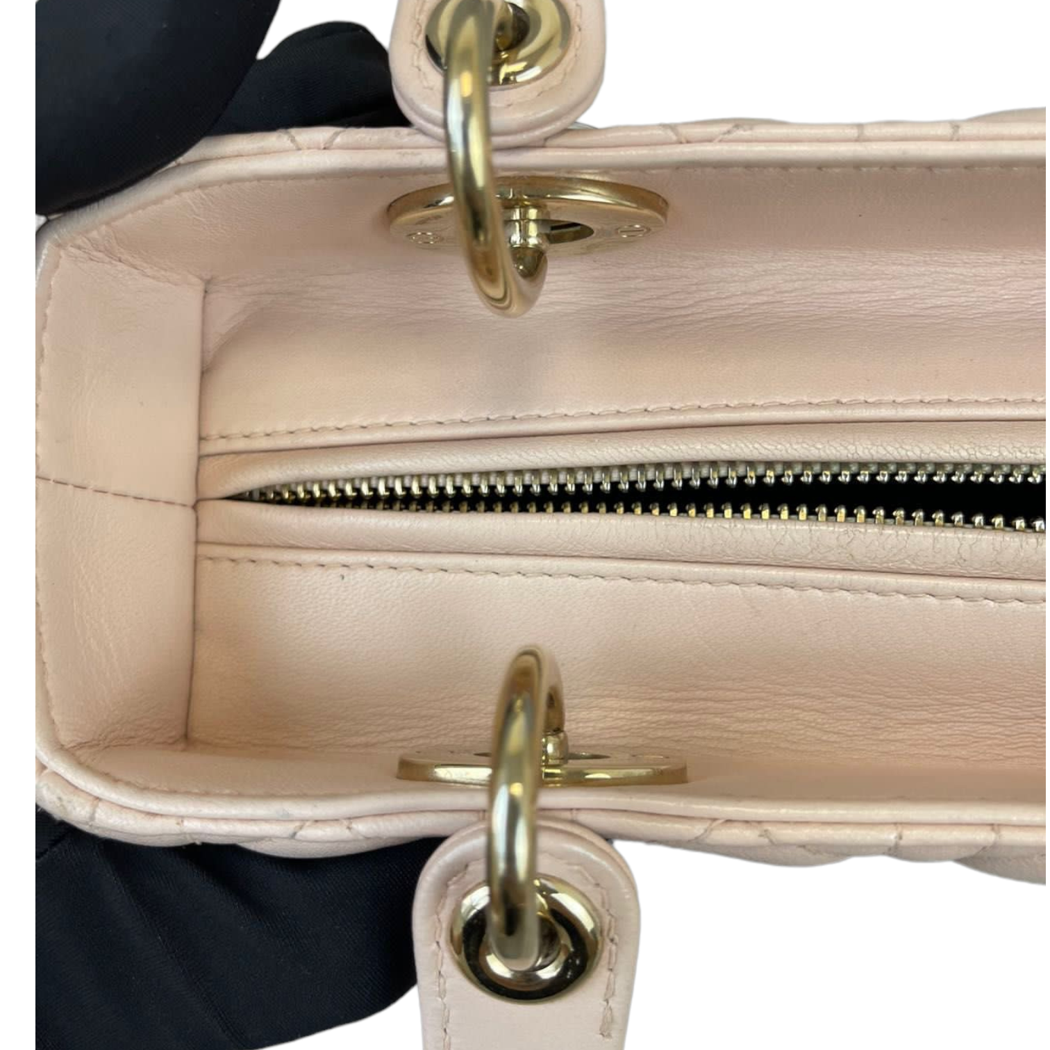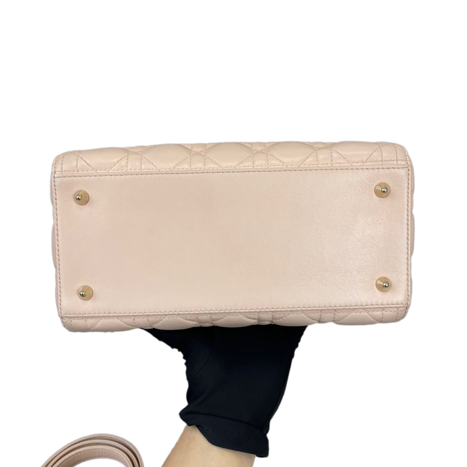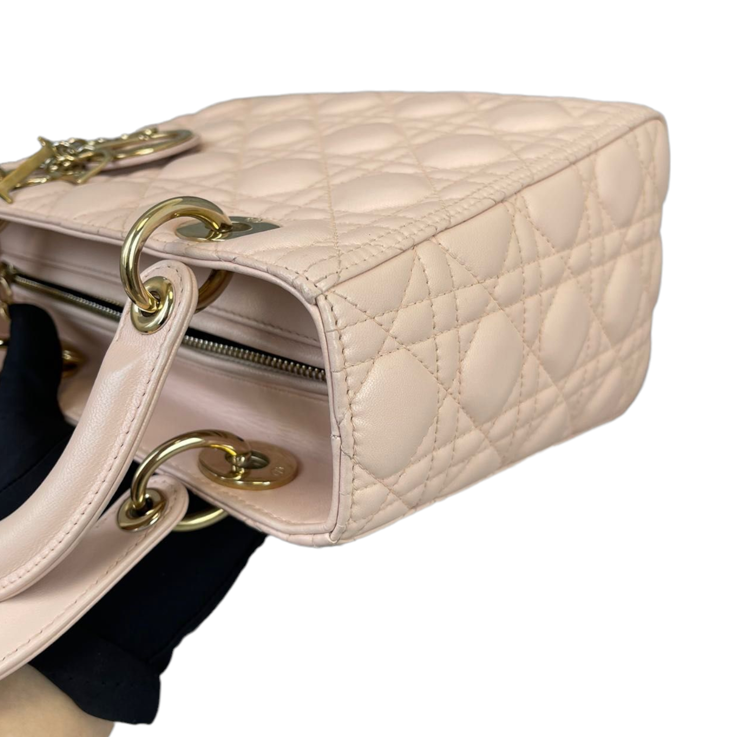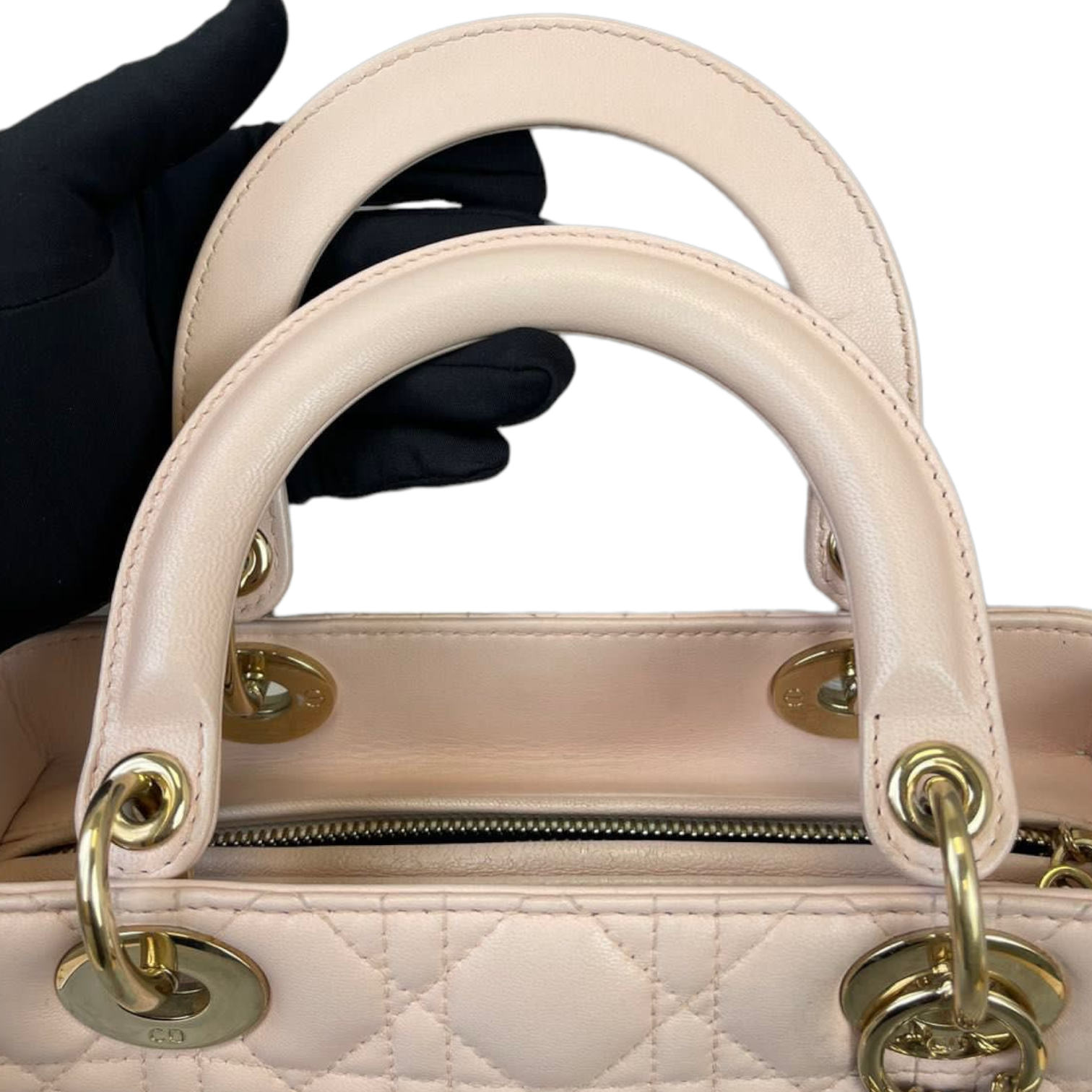 This Lady Dior in size mediumcomes in light pink lambskin leather featuring Gold hardware. This classic bag can be throughout the day but is perfect for your evening socials.