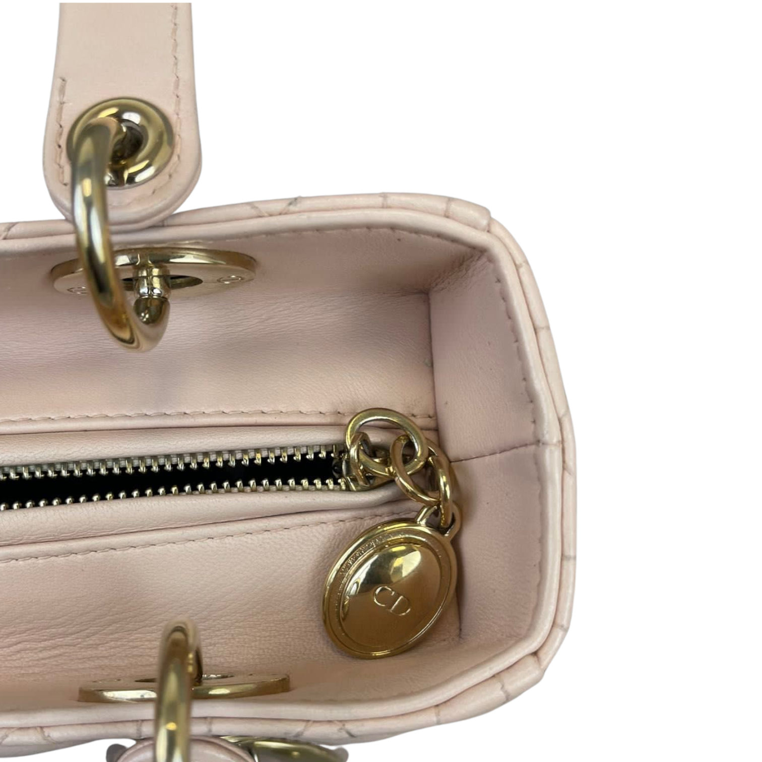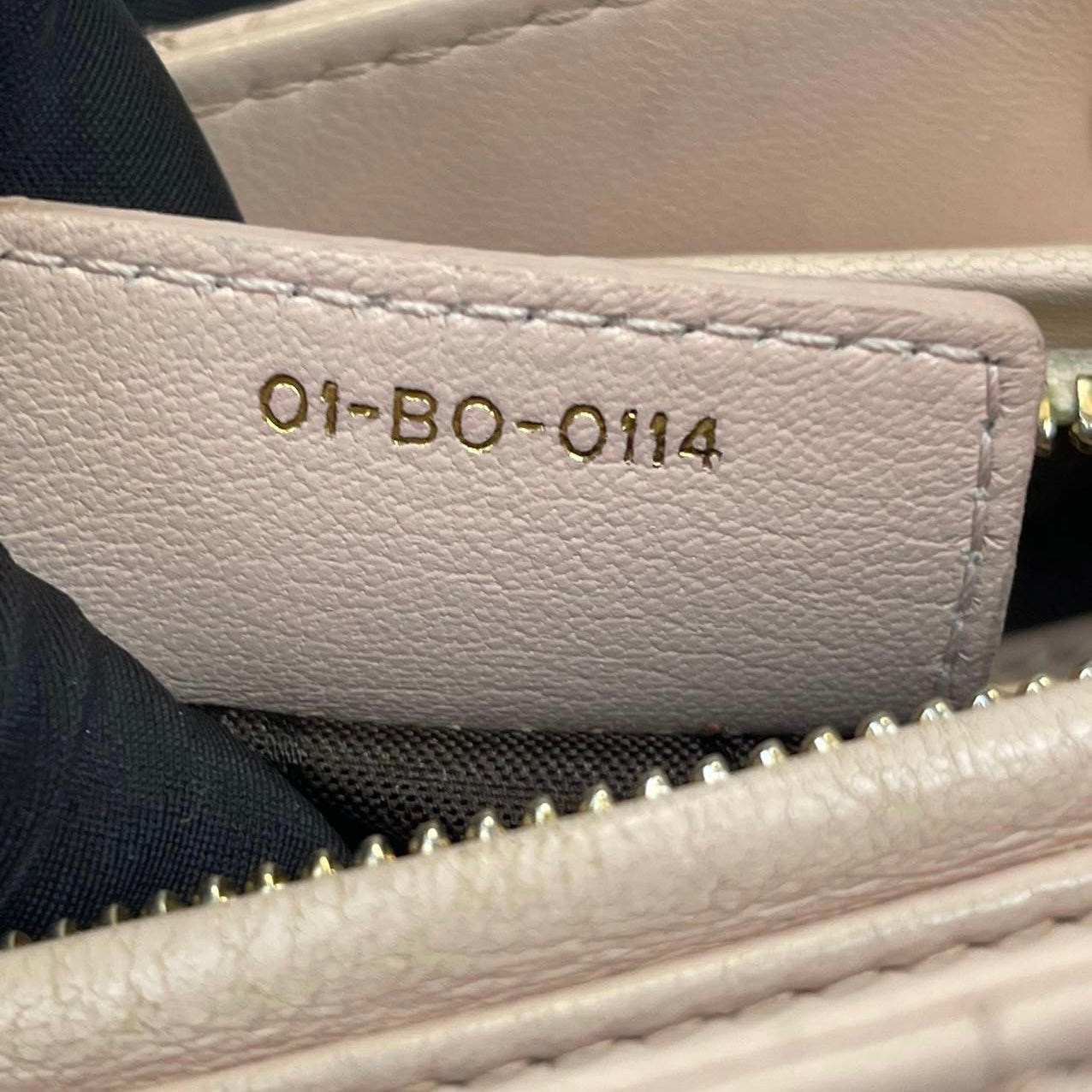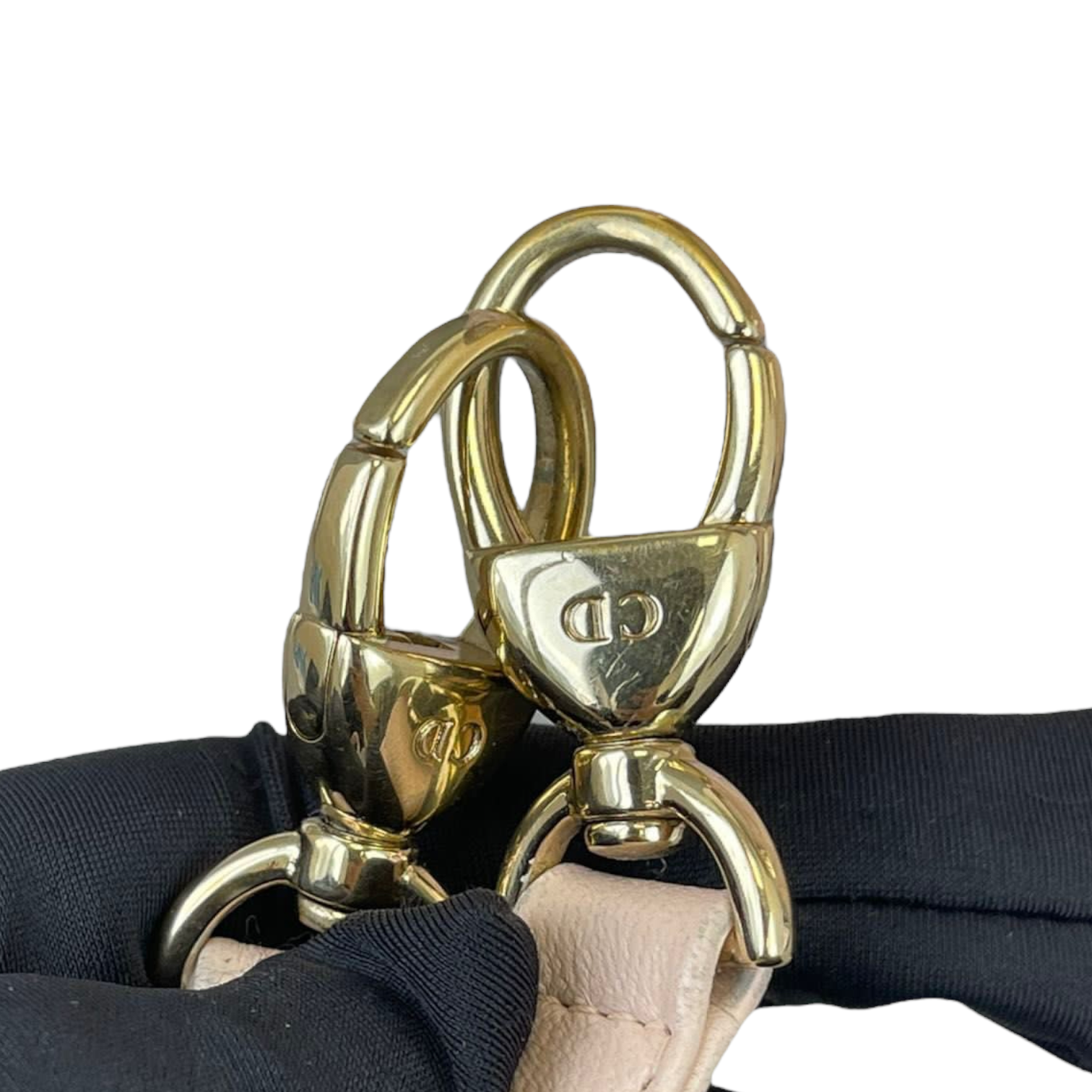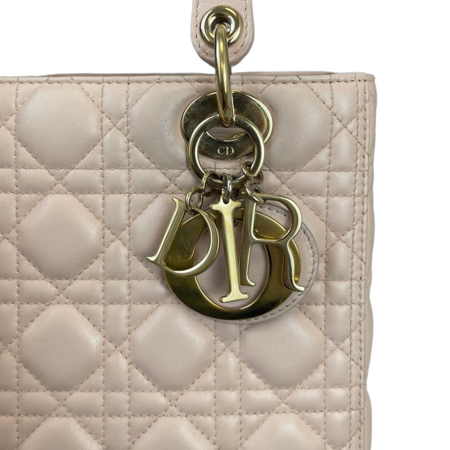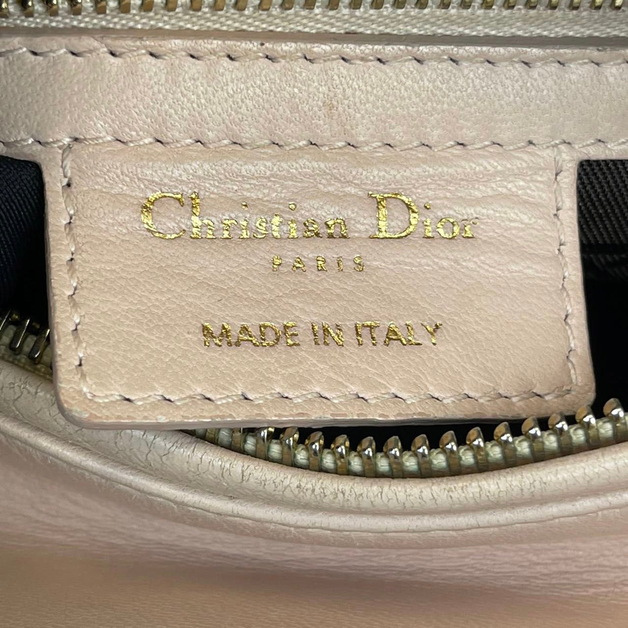 This Lady Dior in size mediumcomes in light pink lambskin leather featuring Gold hardware. This classic bag can be throughout the day but is perfect for your evening socials.