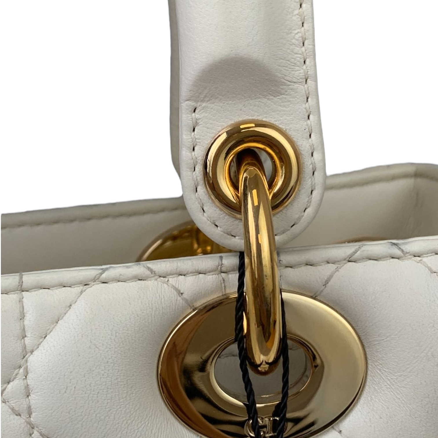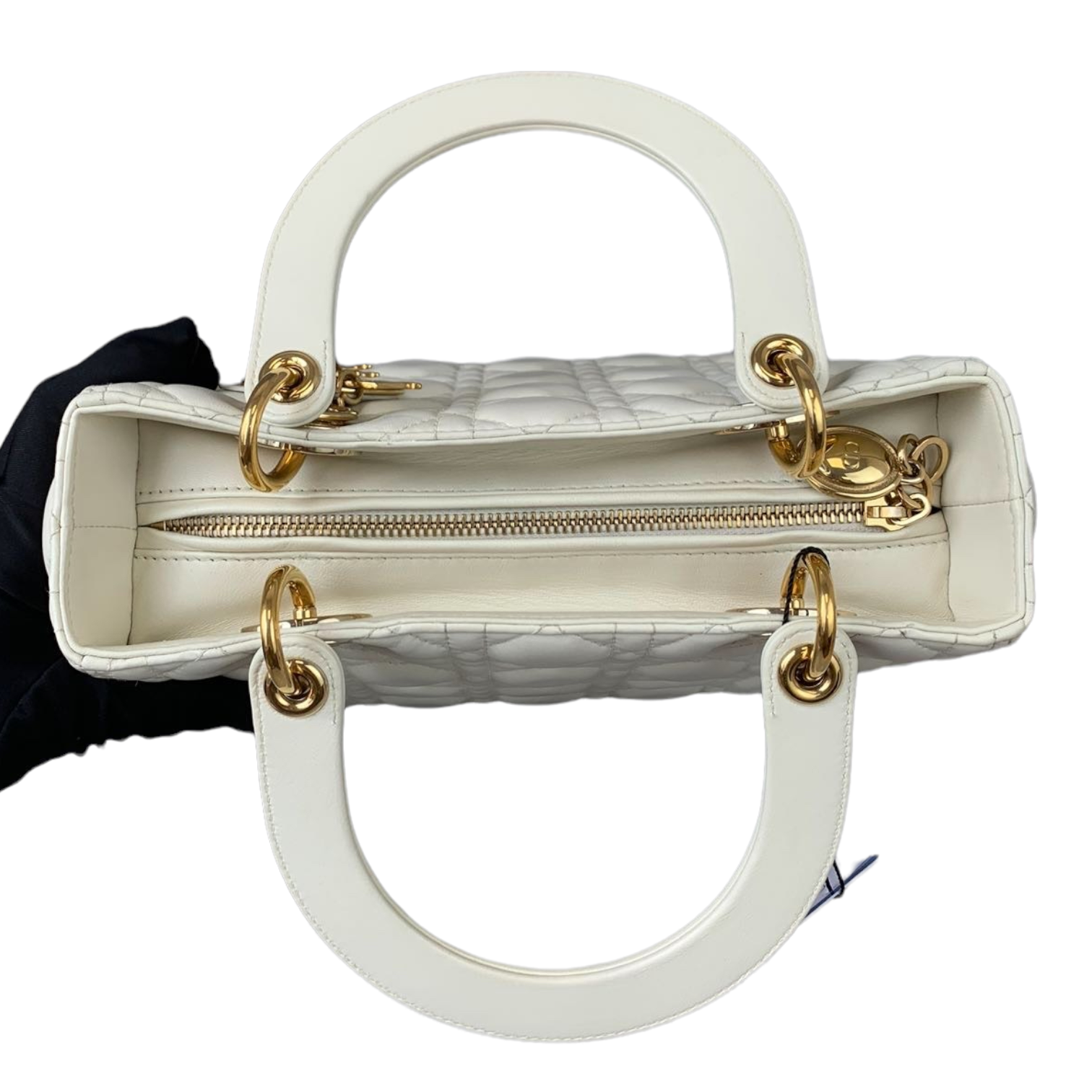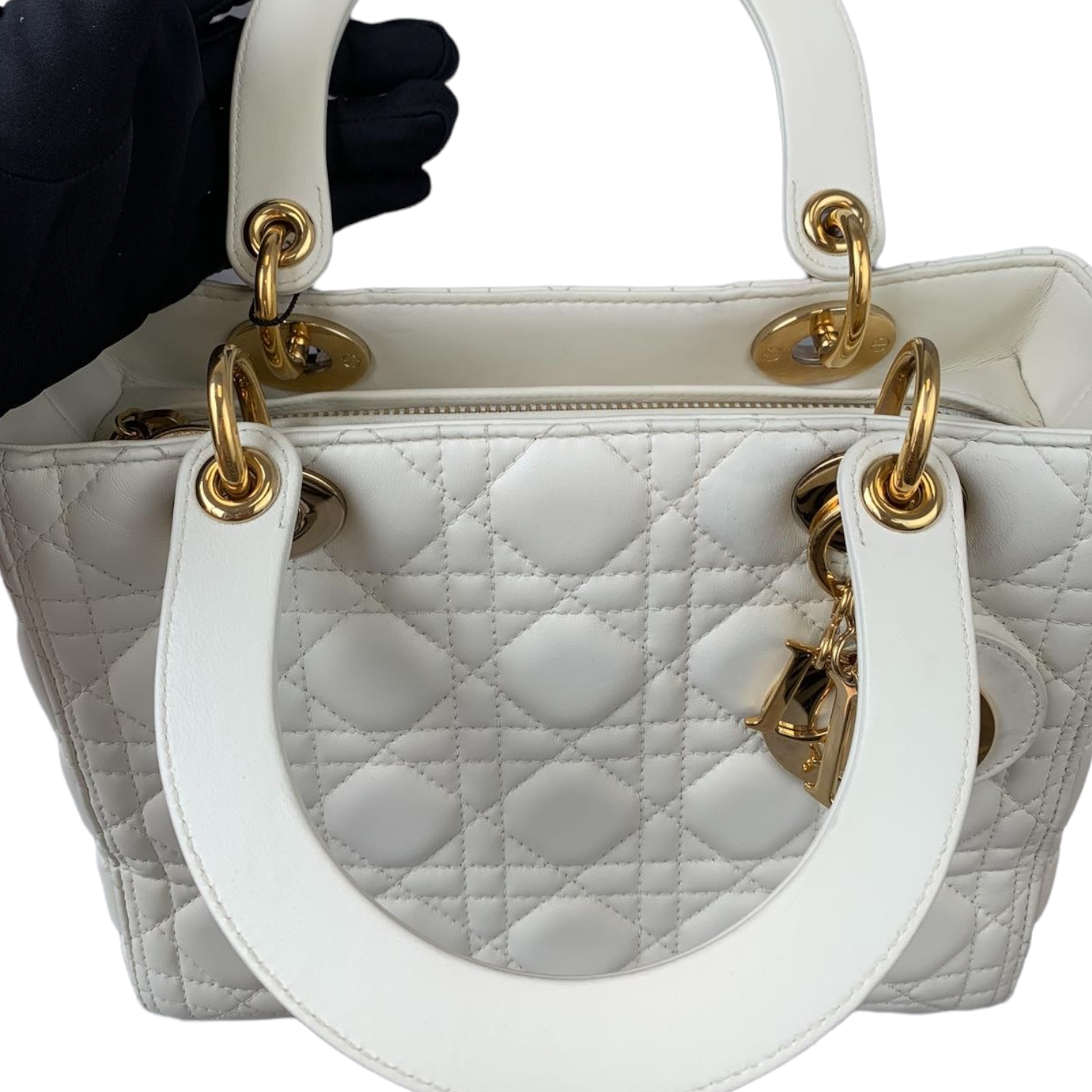 Cannage Lady Dior Medium in a rare creamy white accented with gold toned hardware. The Lady Dior features a quilted leather body, flat top handles, a detachable flat leather strap, a top zip closure, and an interior zip pocket.