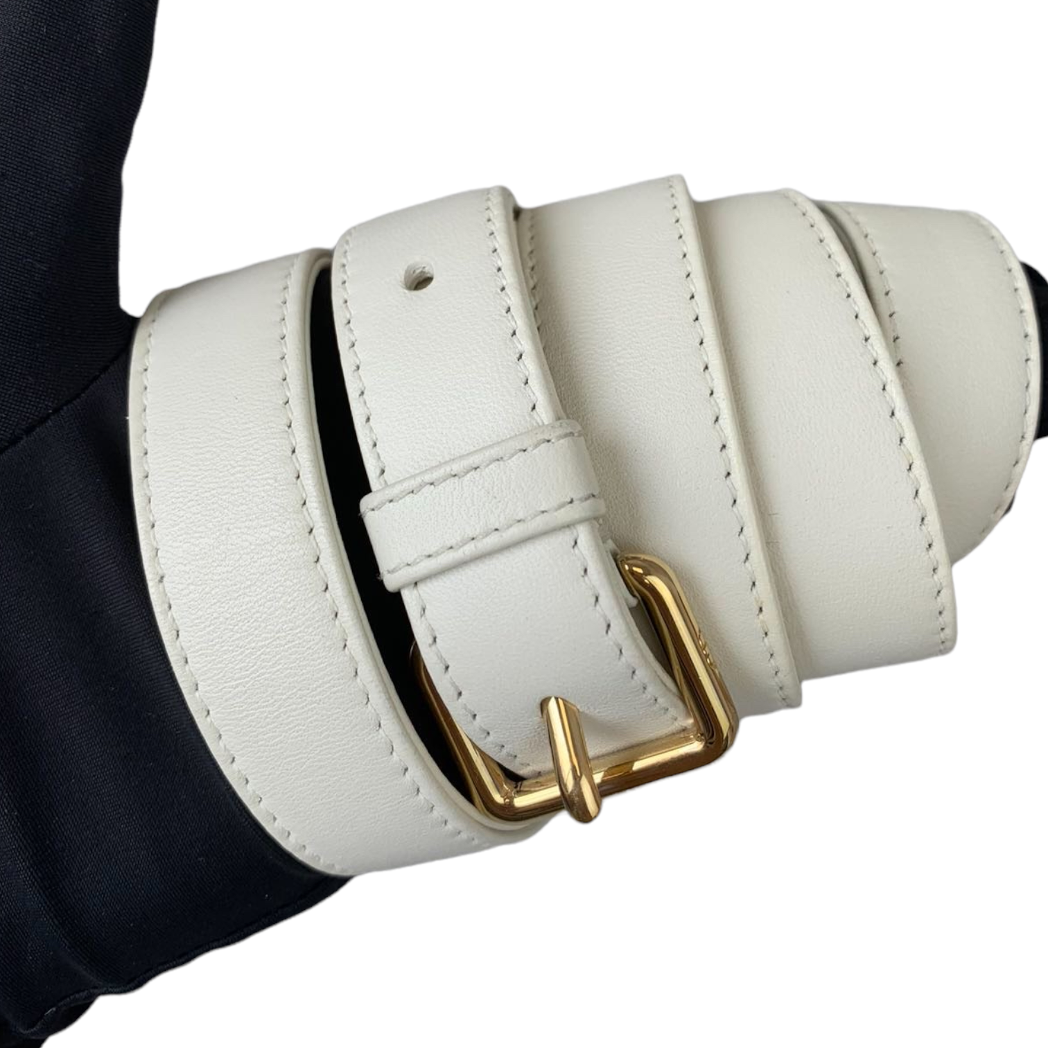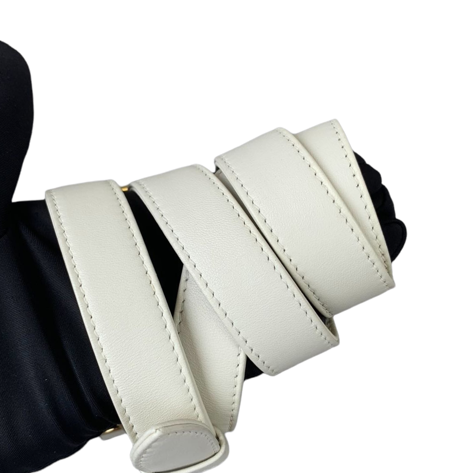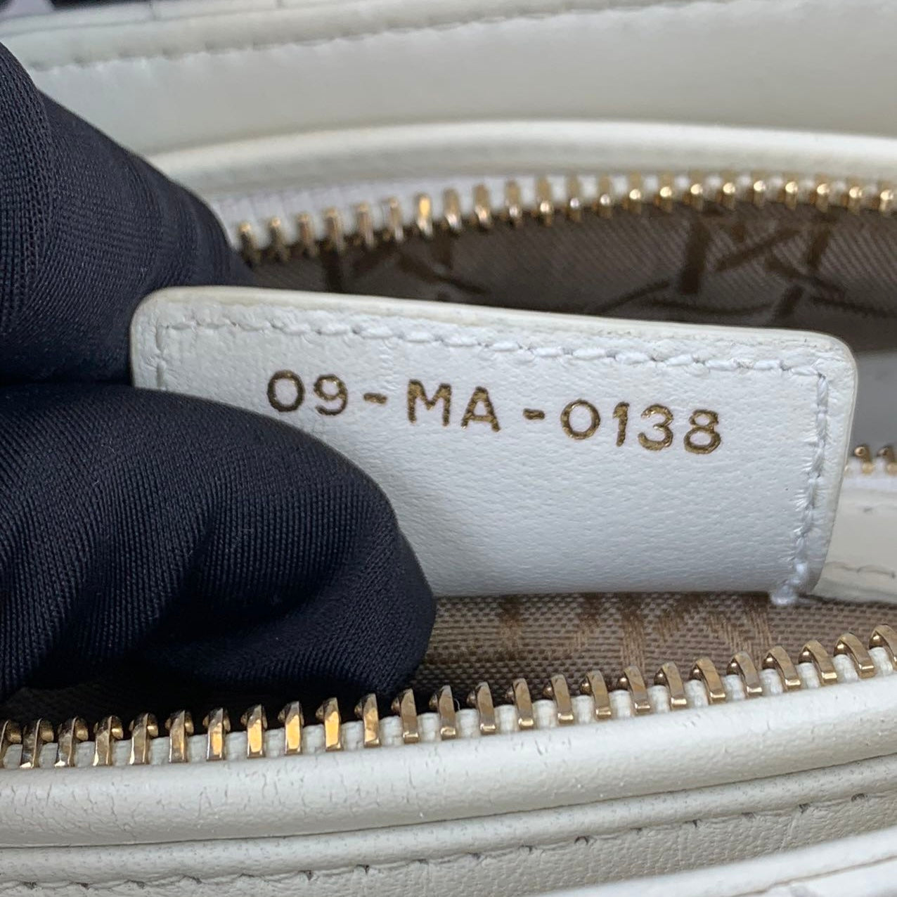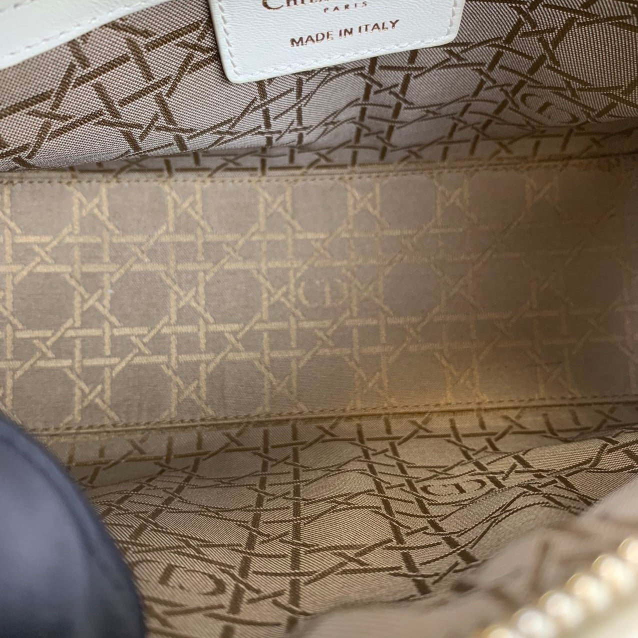Cannage Lady Dior Medium in a rare creamy white accented with gold toned hardware. The Lady Dior features a quilted leather body, flat top handles, a detachable flat leather strap, a top zip closure, and an interior zip pocket.