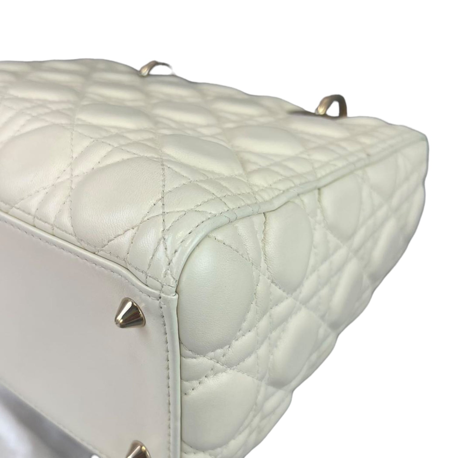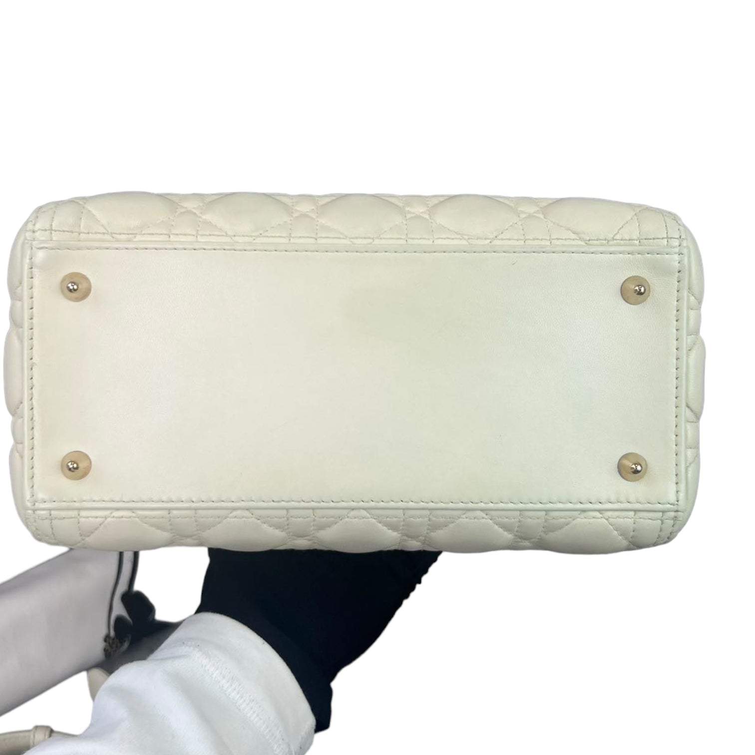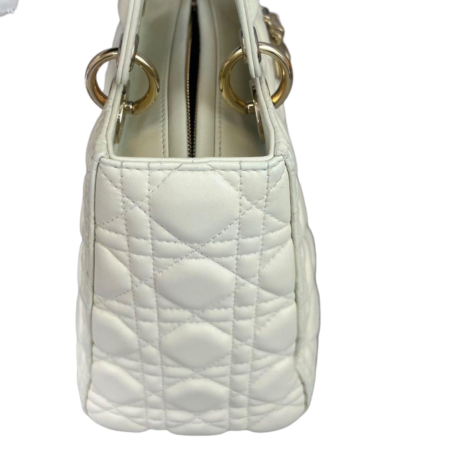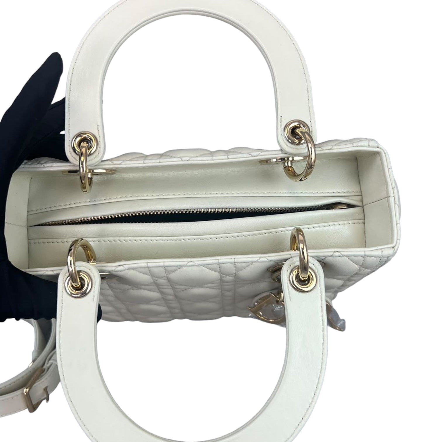 Cannage Lady Dior Medium in a rare creamy white accented with gold toned hardware. The Lady Dior features a quilted leather body, flat top handles, a detachable flat leather strap, a top zip closure, and an interior zip pocket.
