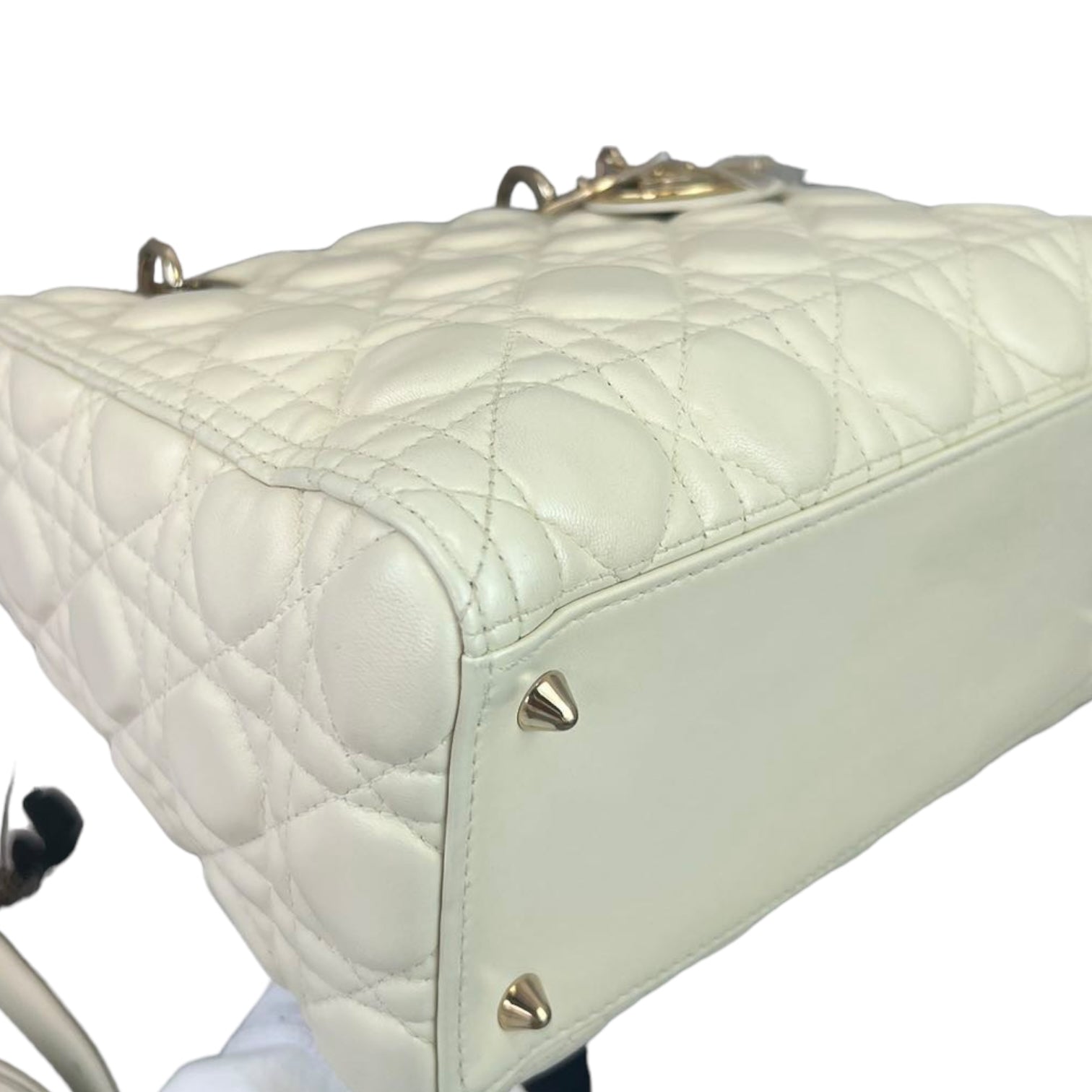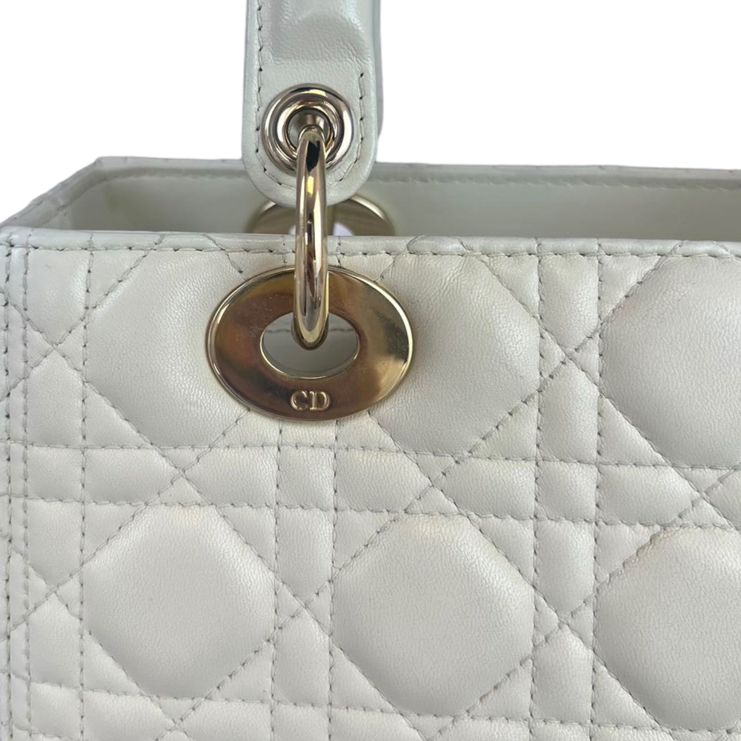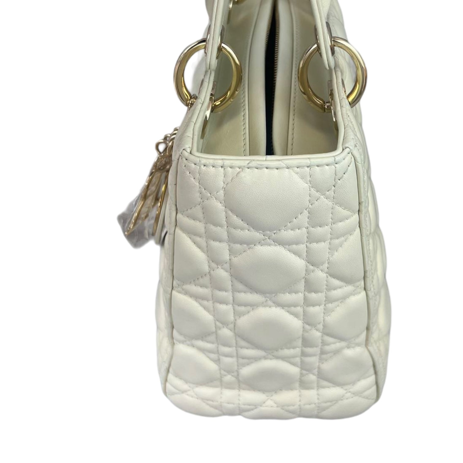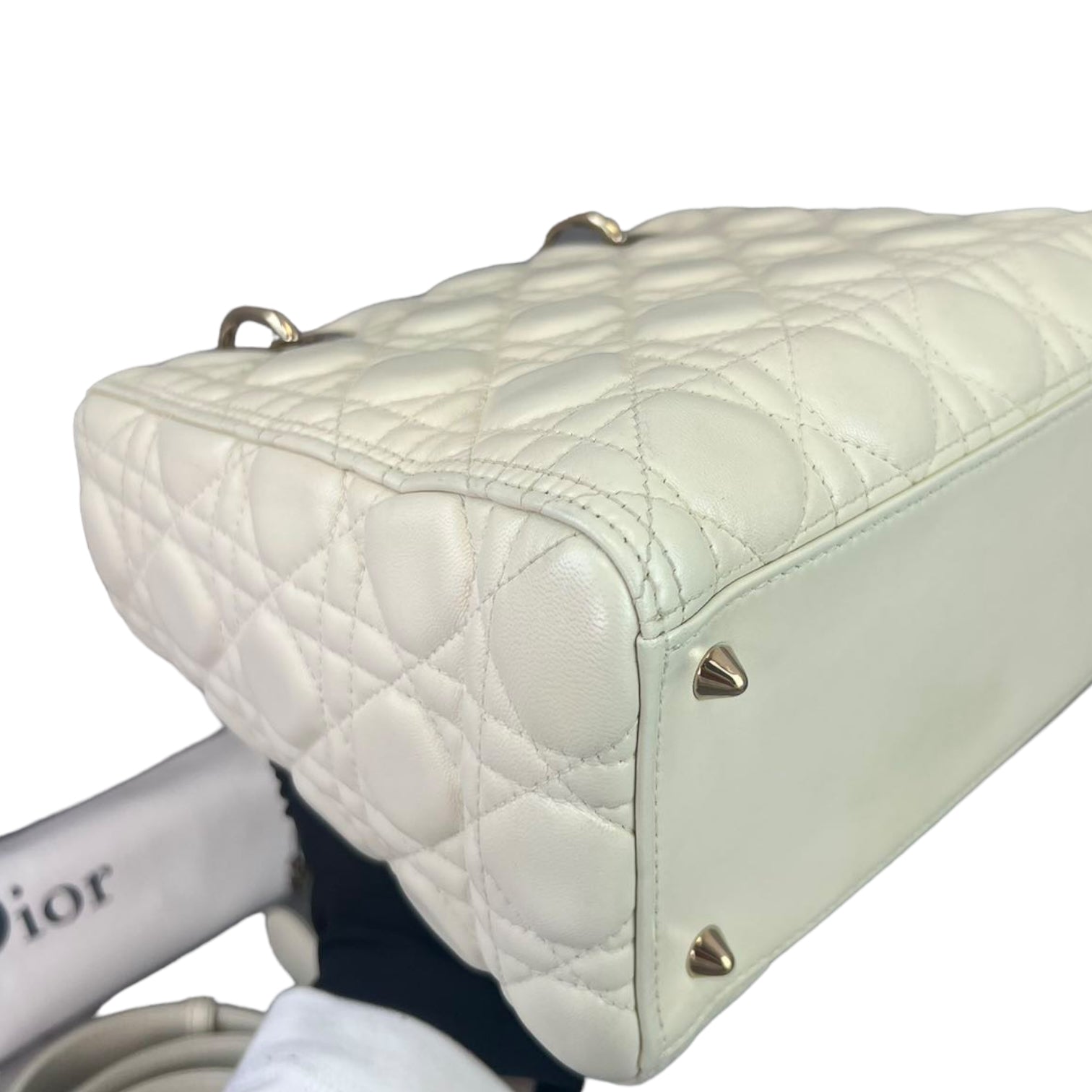 Cannage Lady Dior Medium in a rare creamy white accented with gold toned hardware. The Lady Dior features a quilted leather body, flat top handles, a detachable flat leather strap, a top zip closure, and an interior zip pocket.
