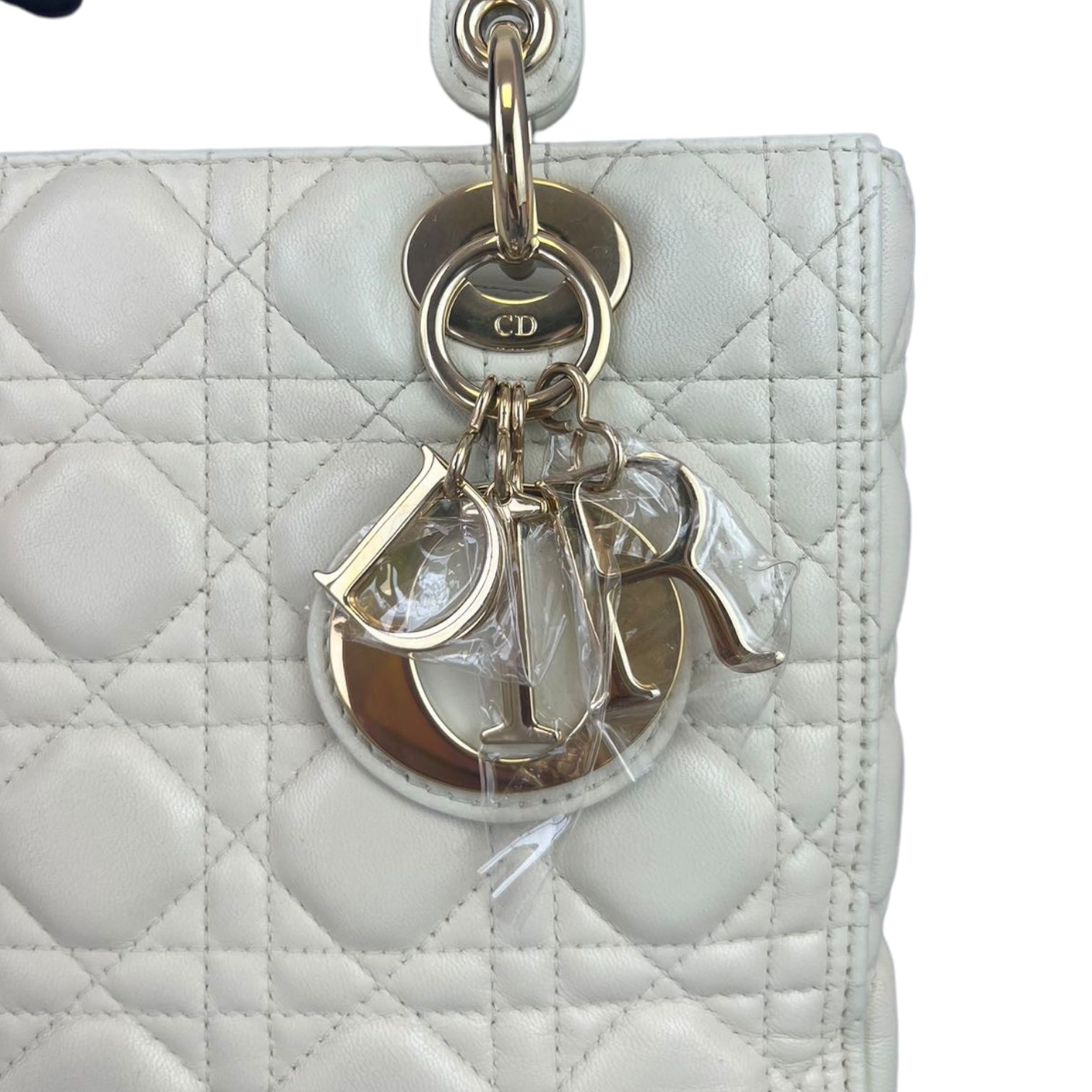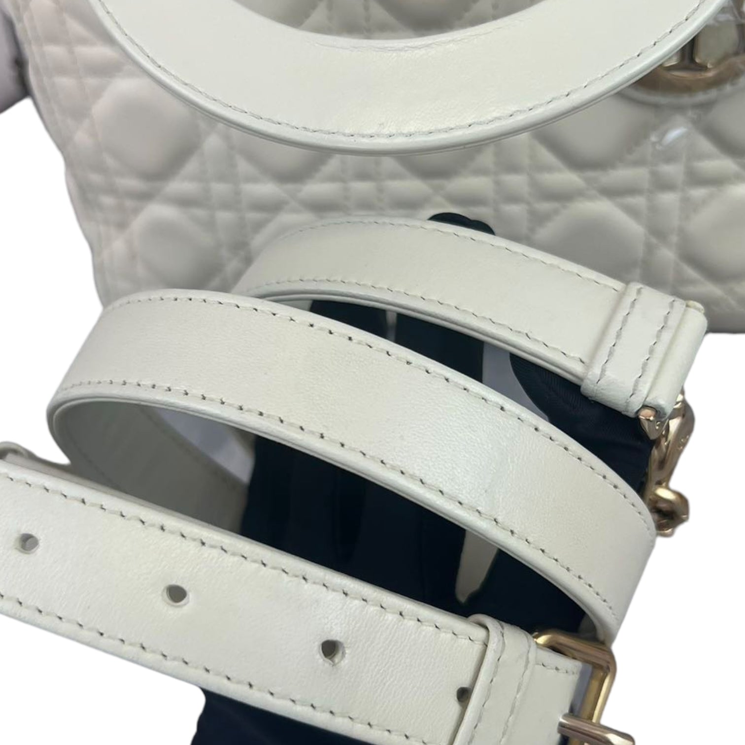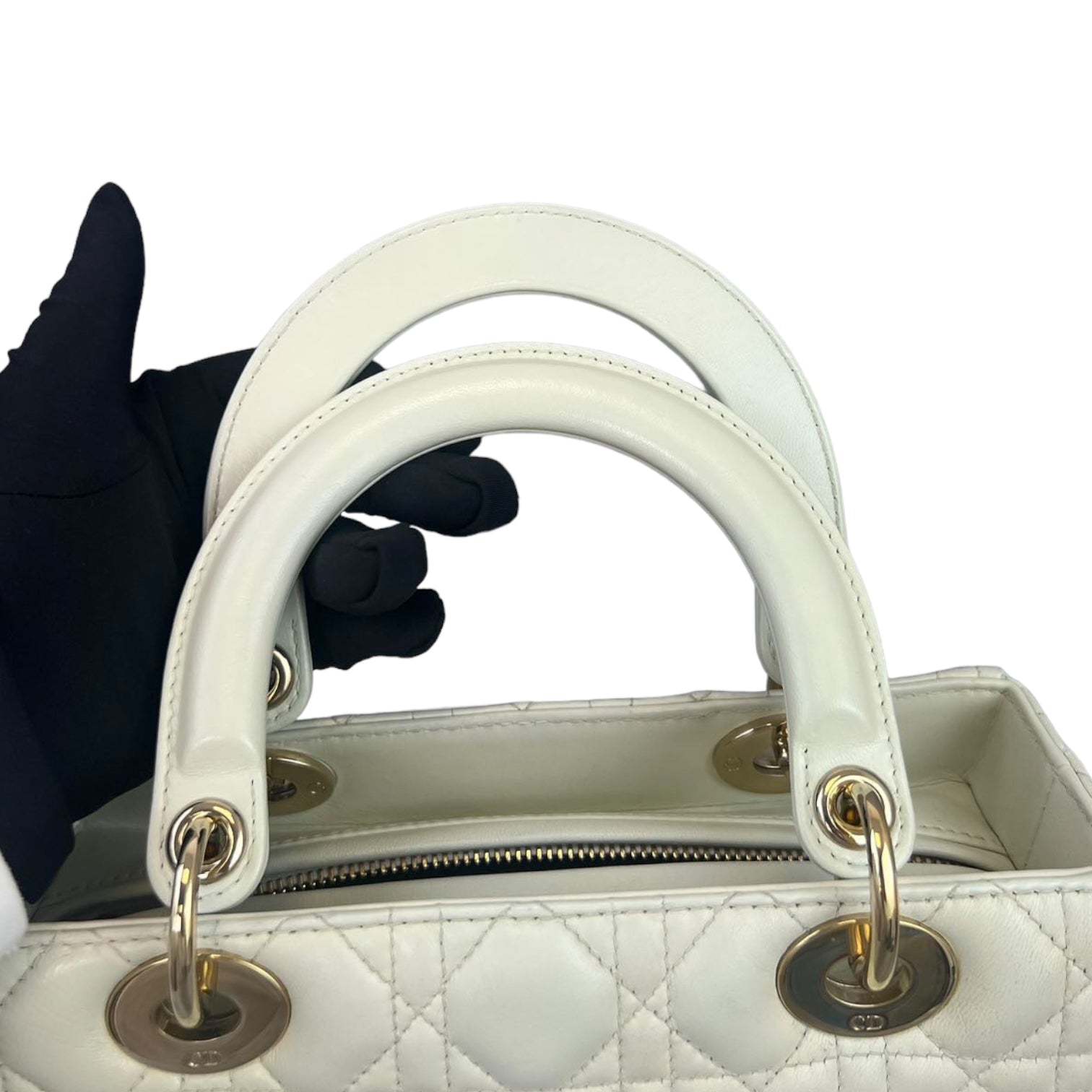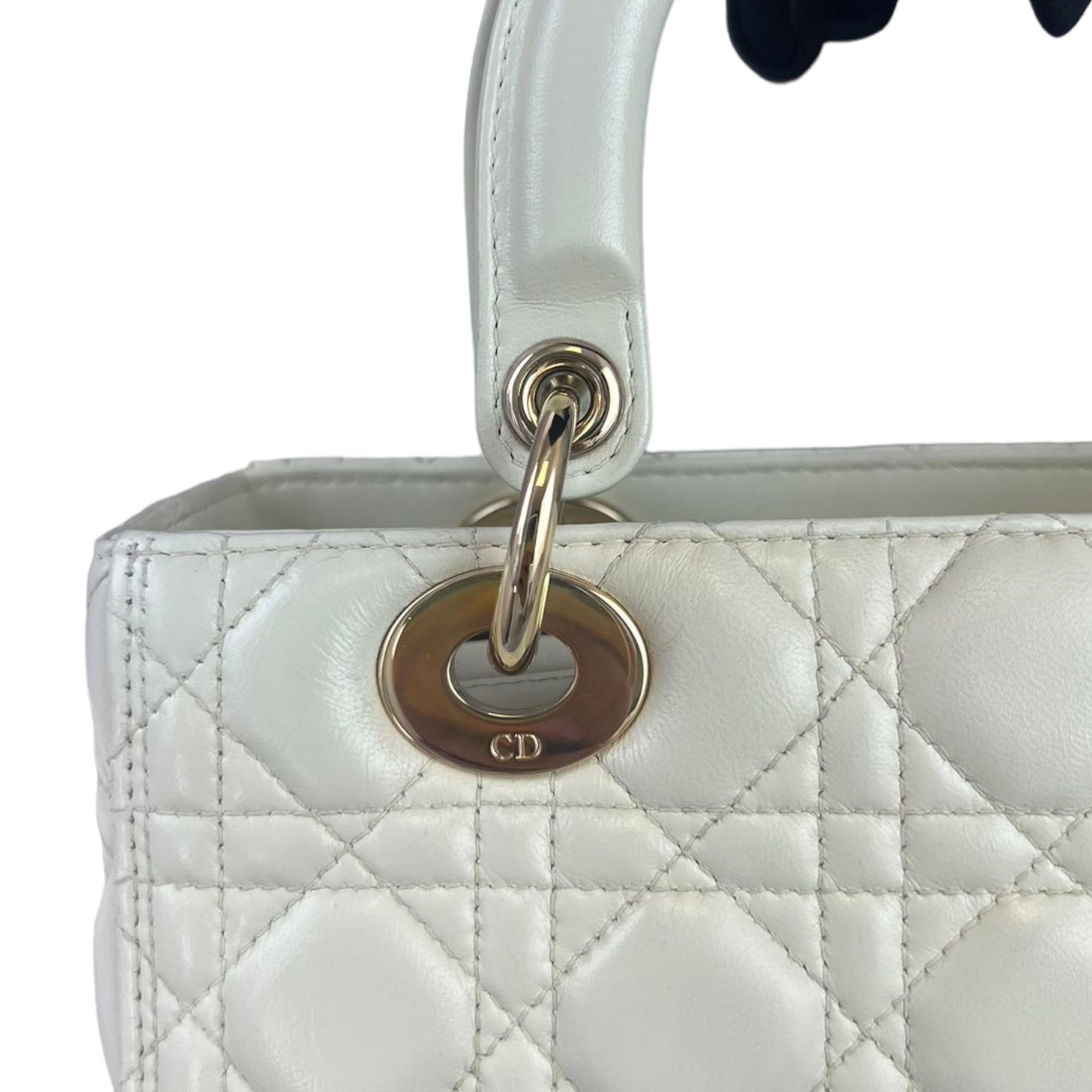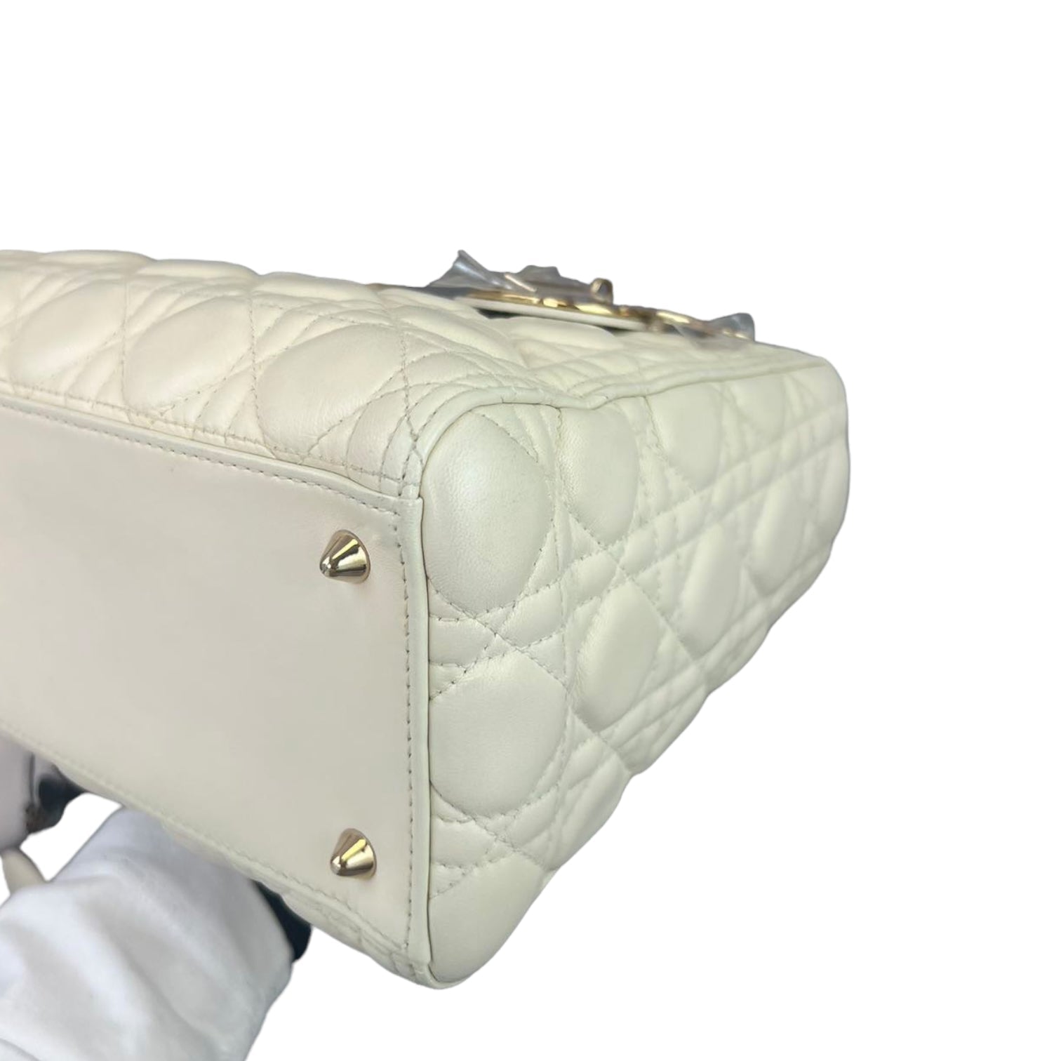 Cannage Lady Dior Medium in a rare creamy white accented with gold toned hardware. The Lady Dior features a quilted leather body, flat top handles, a detachable flat leather strap, a top zip closure, and an interior zip pocket.