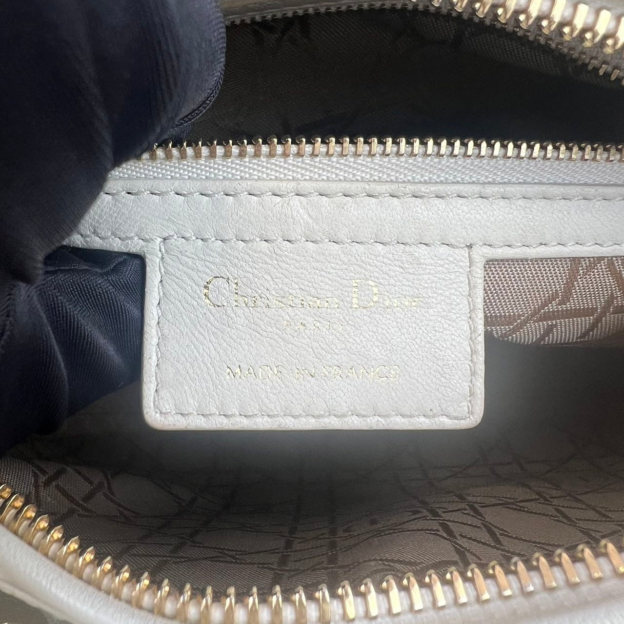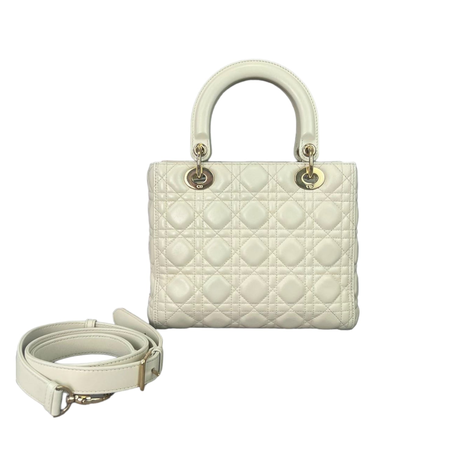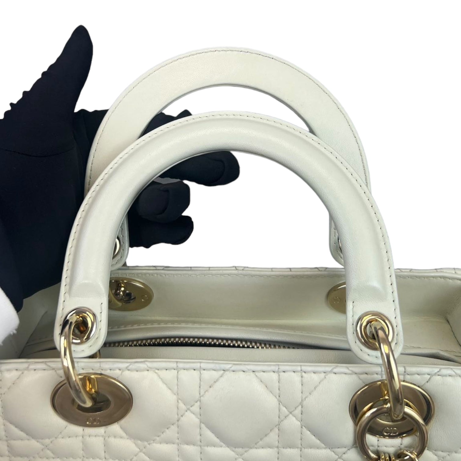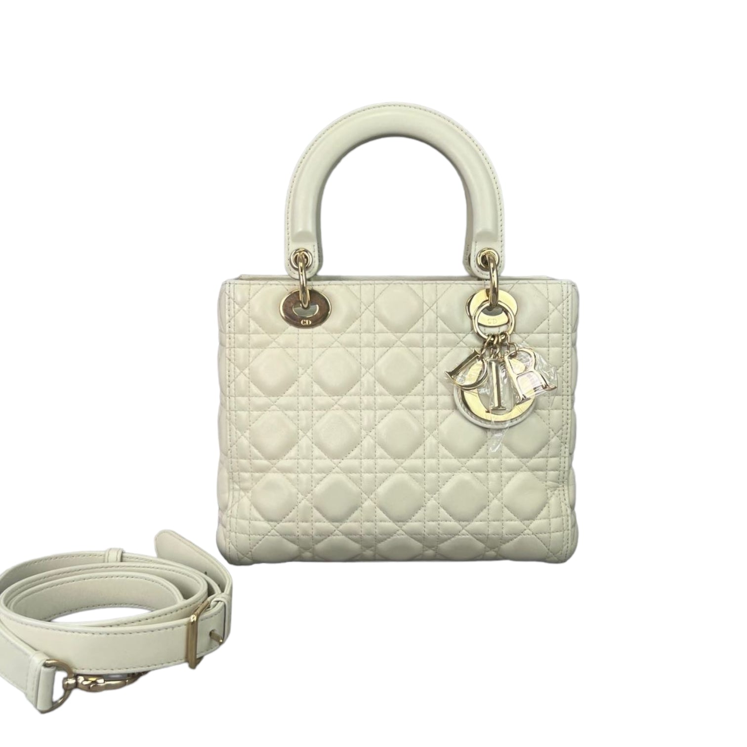 Cannage Lady Dior Medium in a rare creamy white accented with gold toned hardware. The Lady Dior features a quilted leather body, flat top handles, a detachable flat leather strap, a top zip closure, and an interior zip pocket.