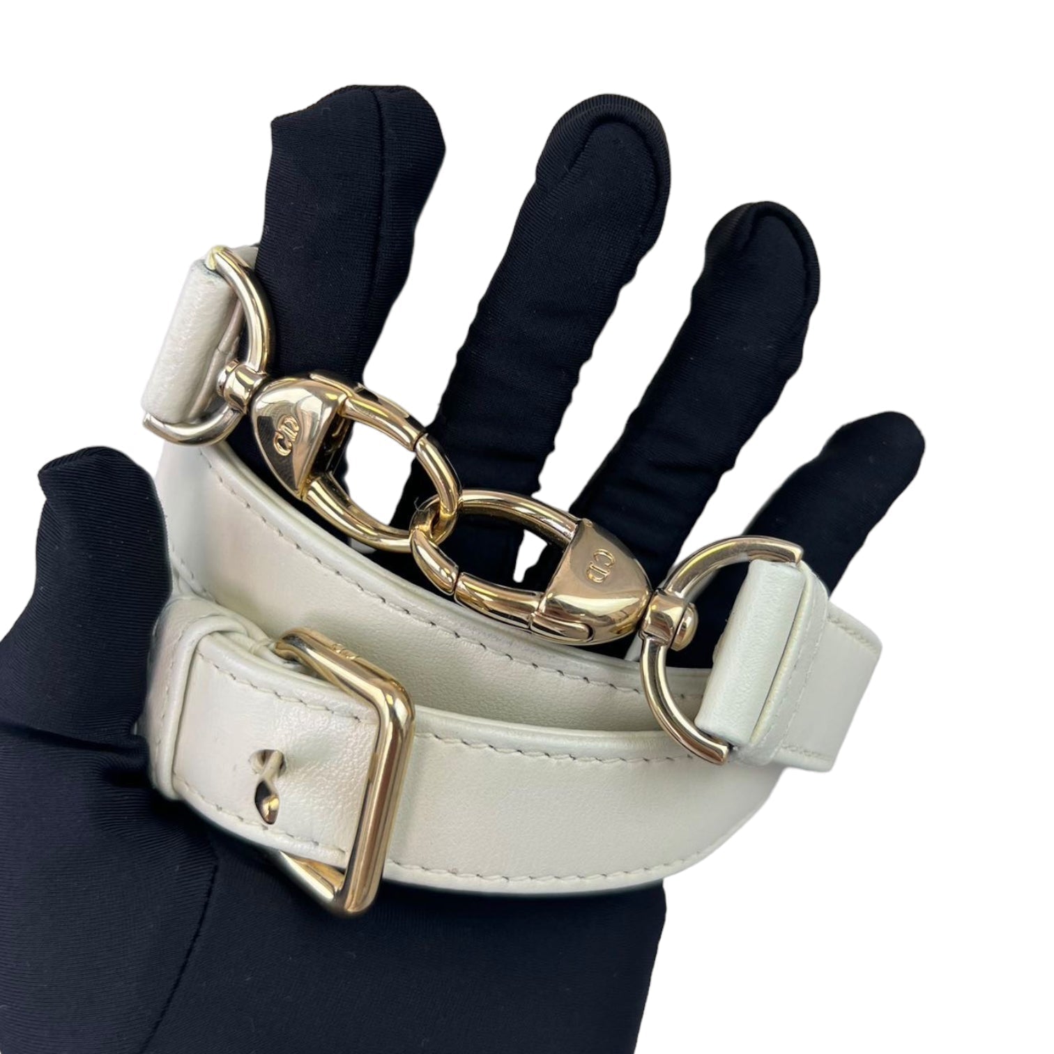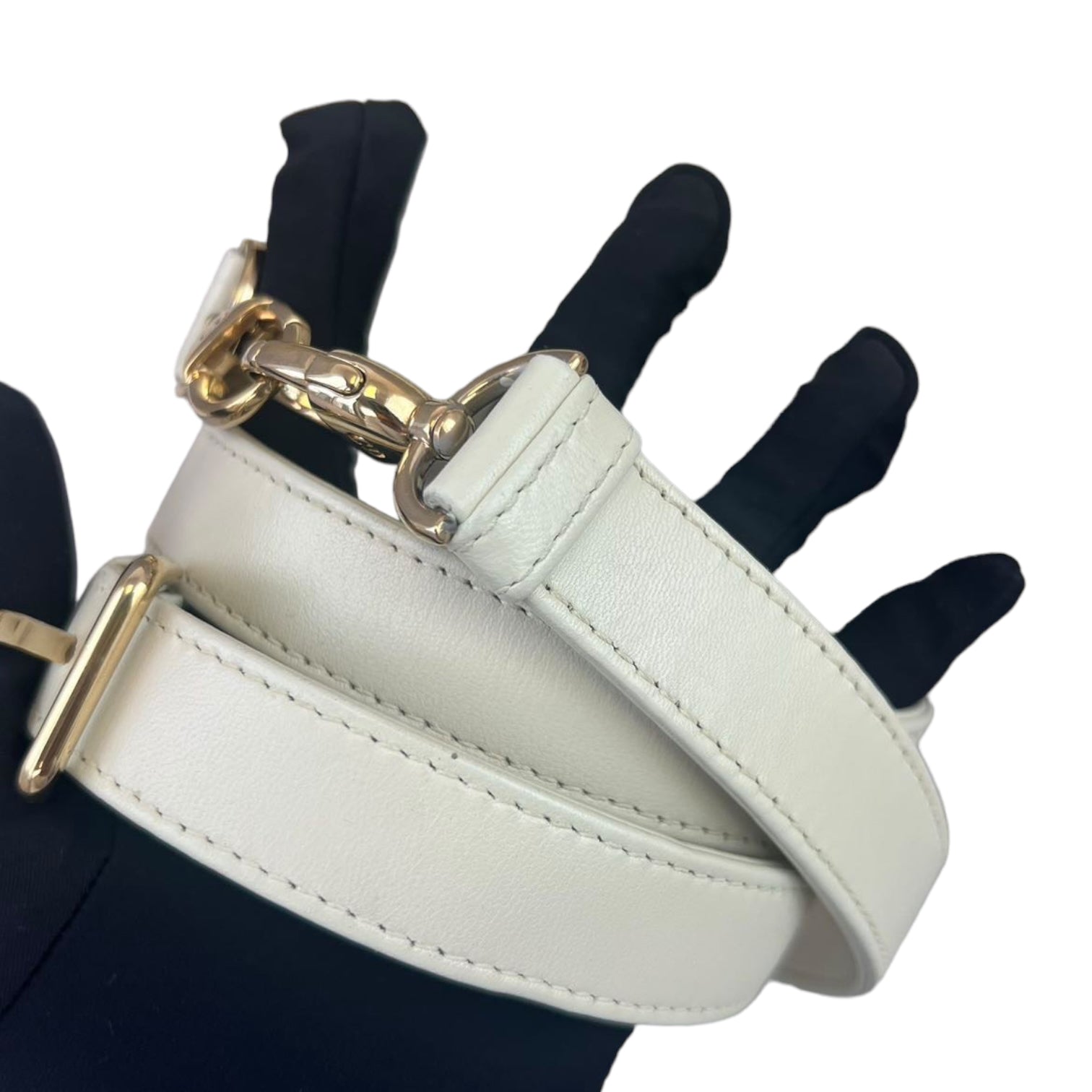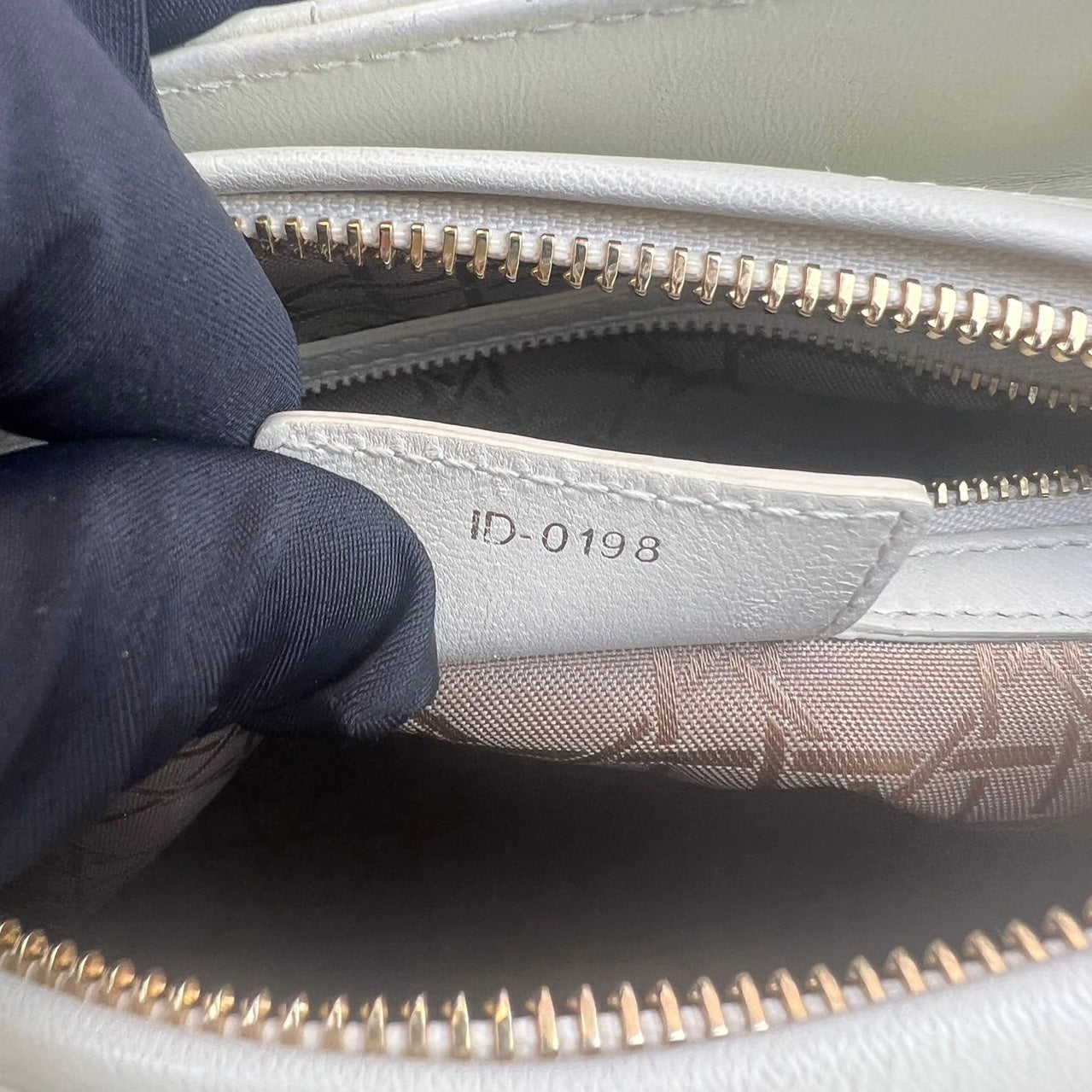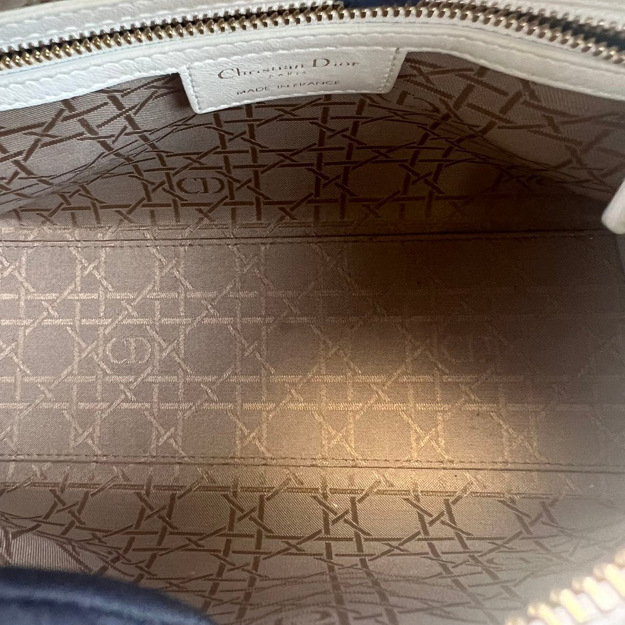 Cannage Lady Dior Medium in a rare creamy white accented with gold toned hardware. The Lady Dior features a quilted leather body, flat top handles, a detachable flat leather strap, a top zip closure, and an interior zip pocket.