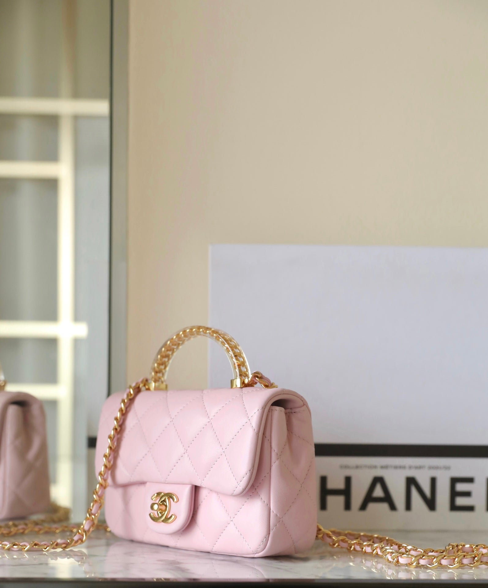 CHANEL 24s flap bag 19cm top handle pink lambskin gold hardware