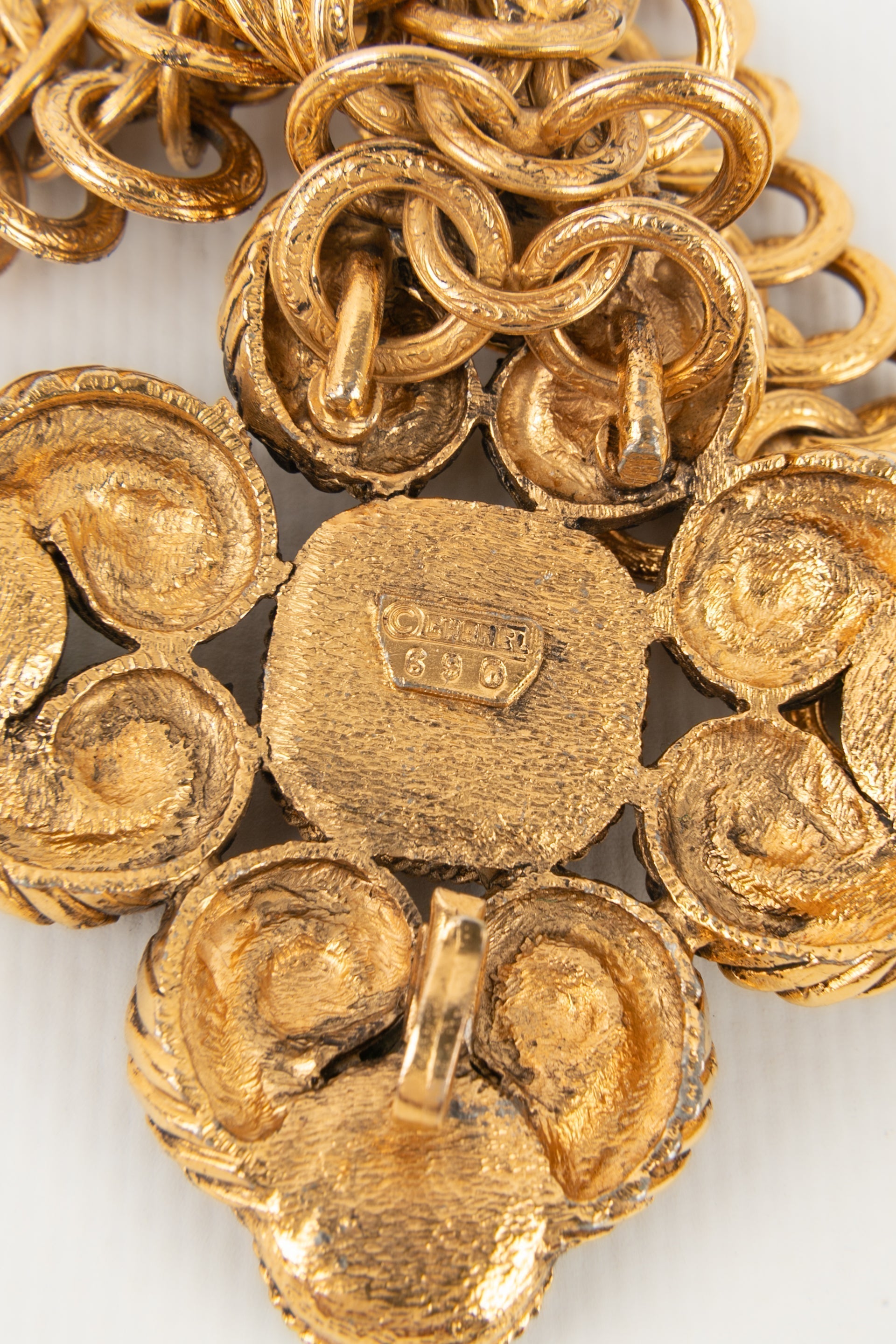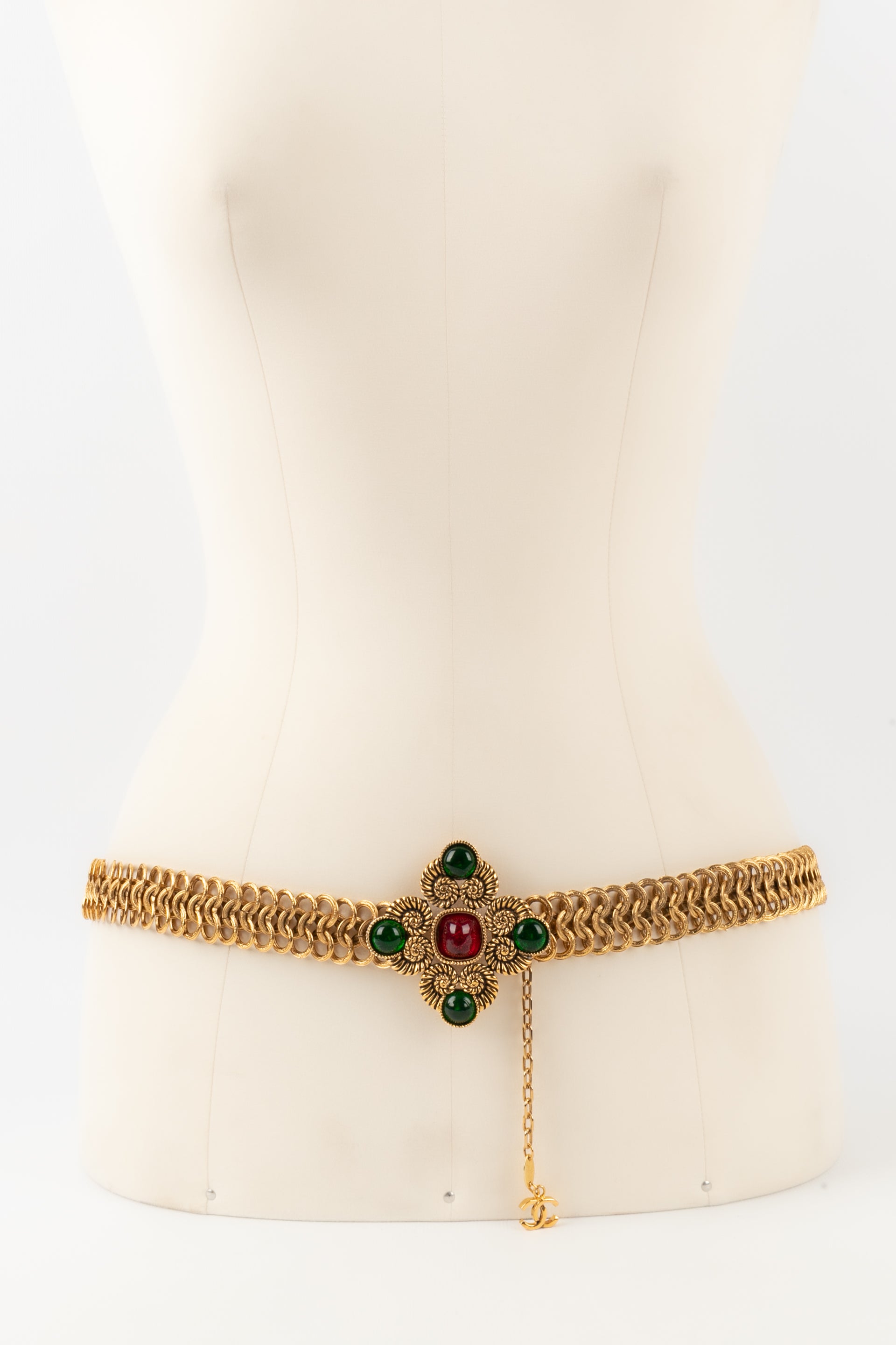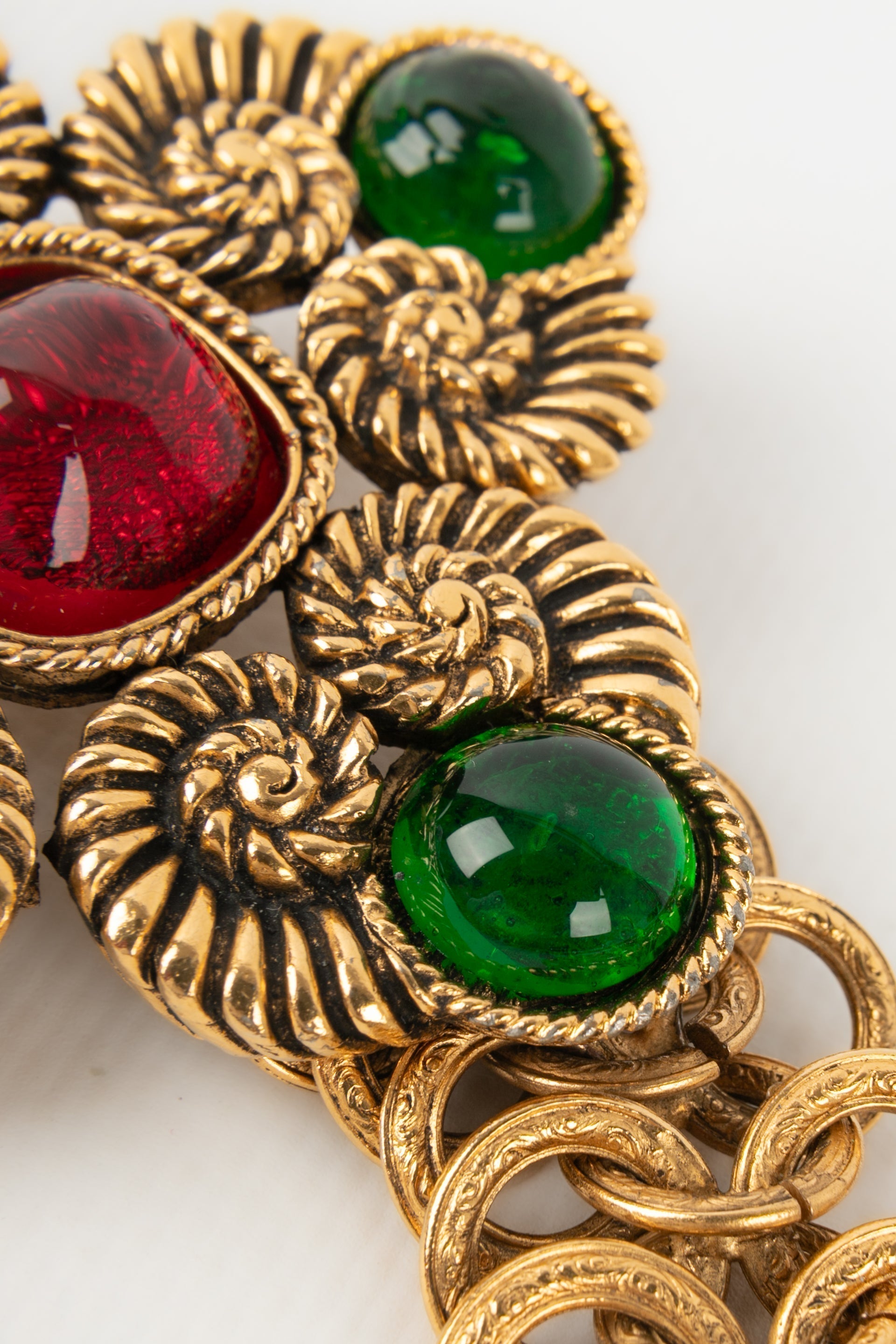 CHANEL -(Made in France) Ceinture en mtal dor, pte de verre verte et rouge. Collection 1985.