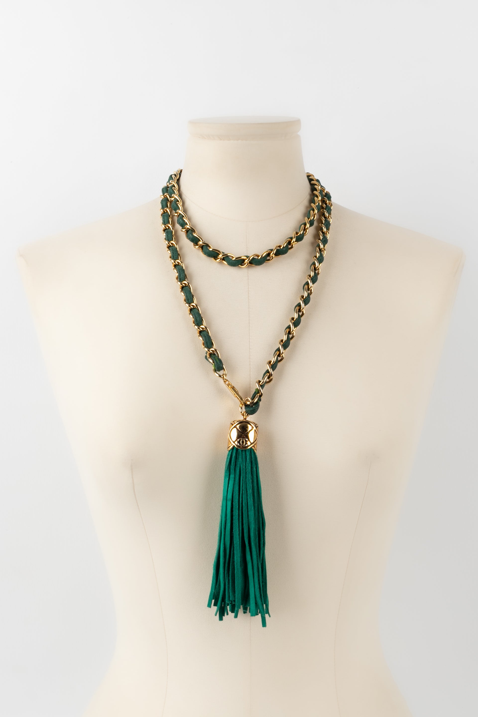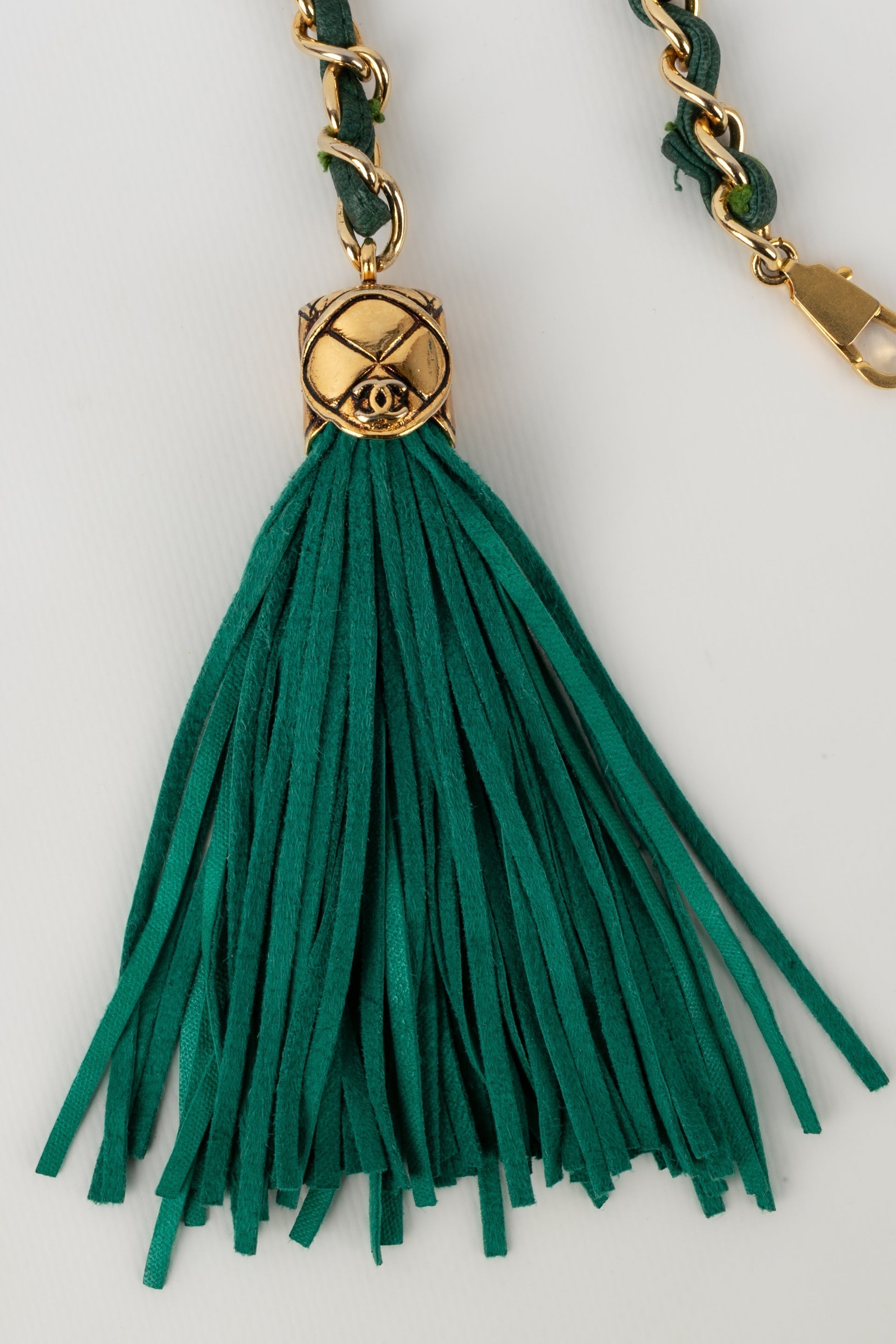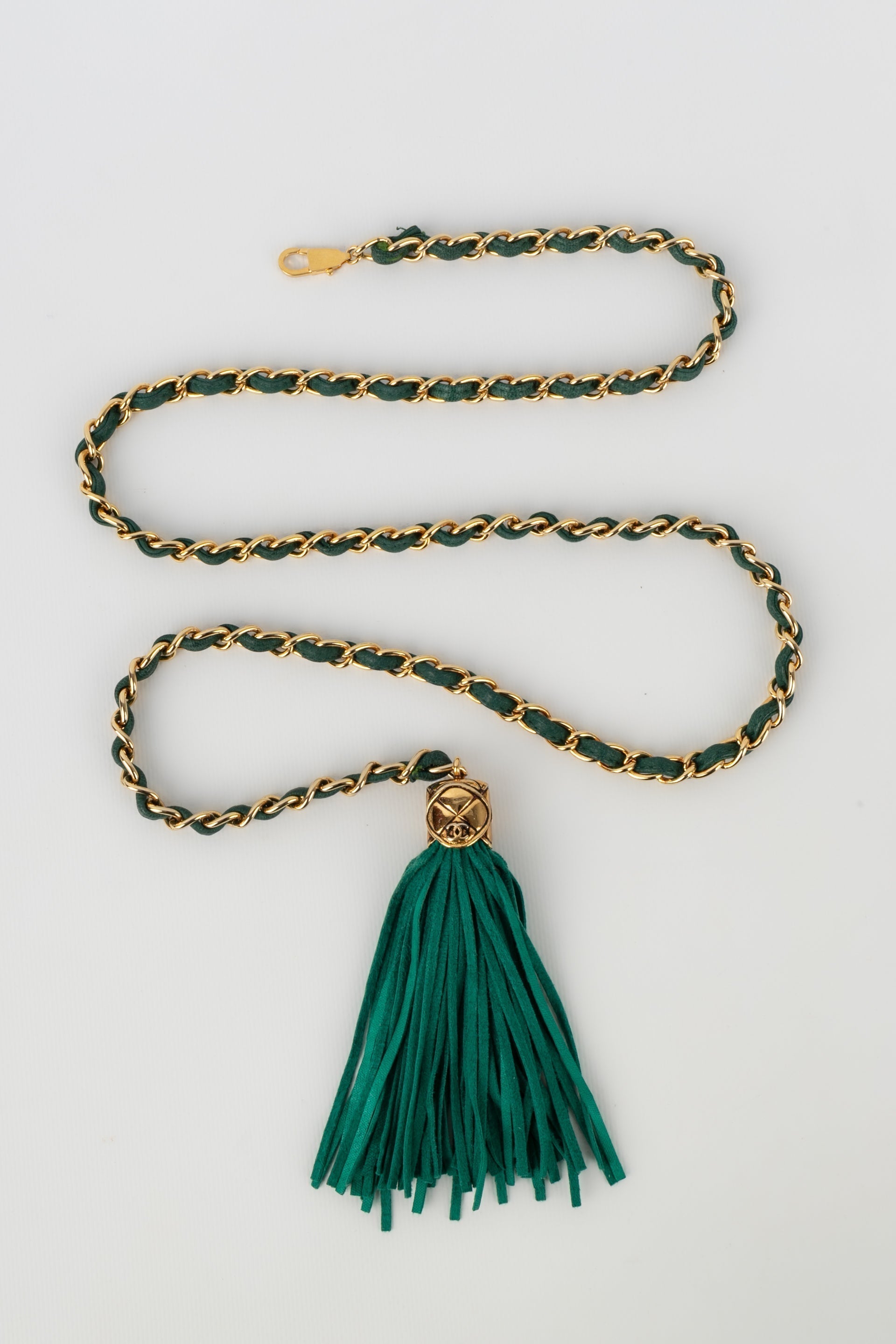 CHANEL - Ceinture en mtal dor entrelac de cuir vert.