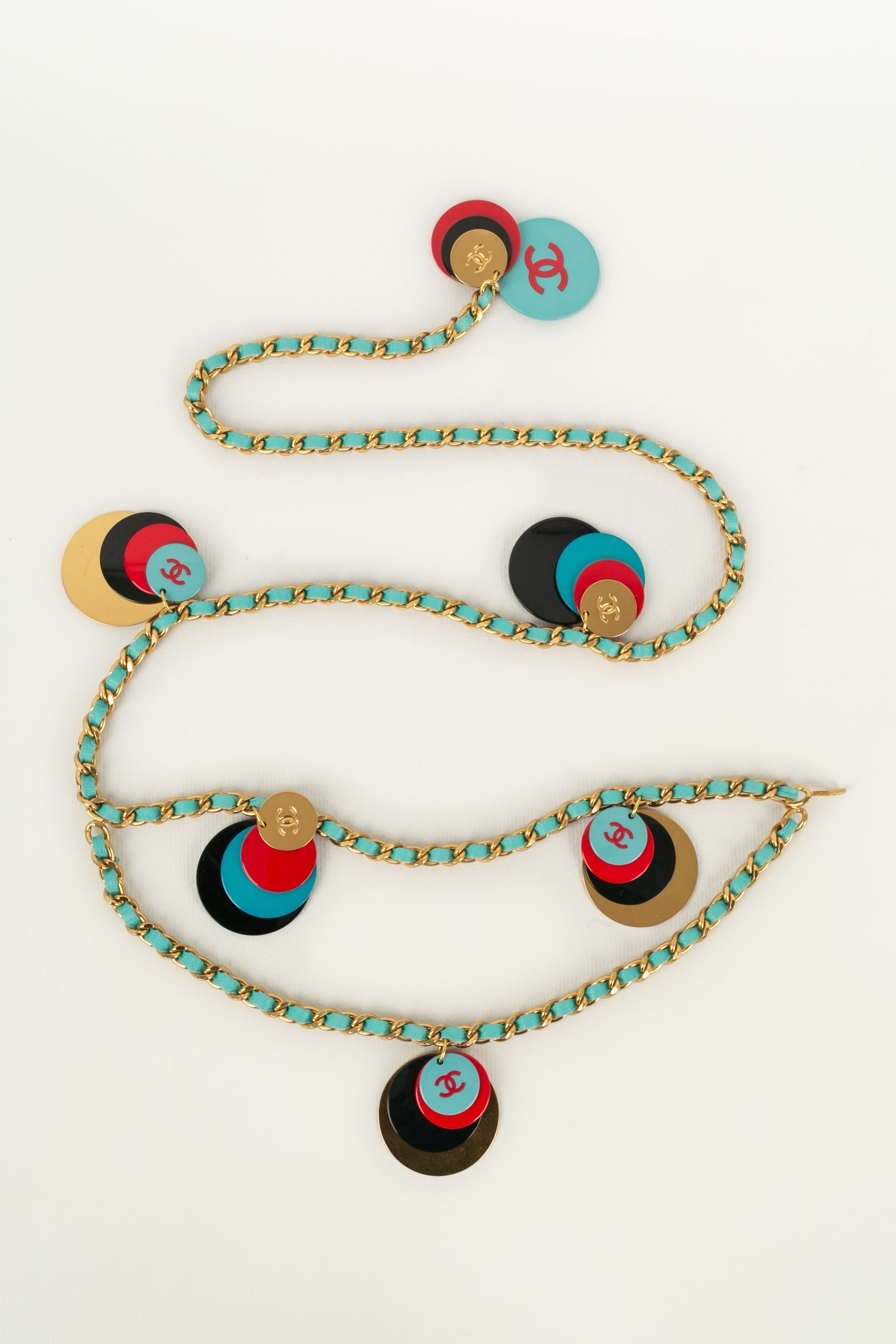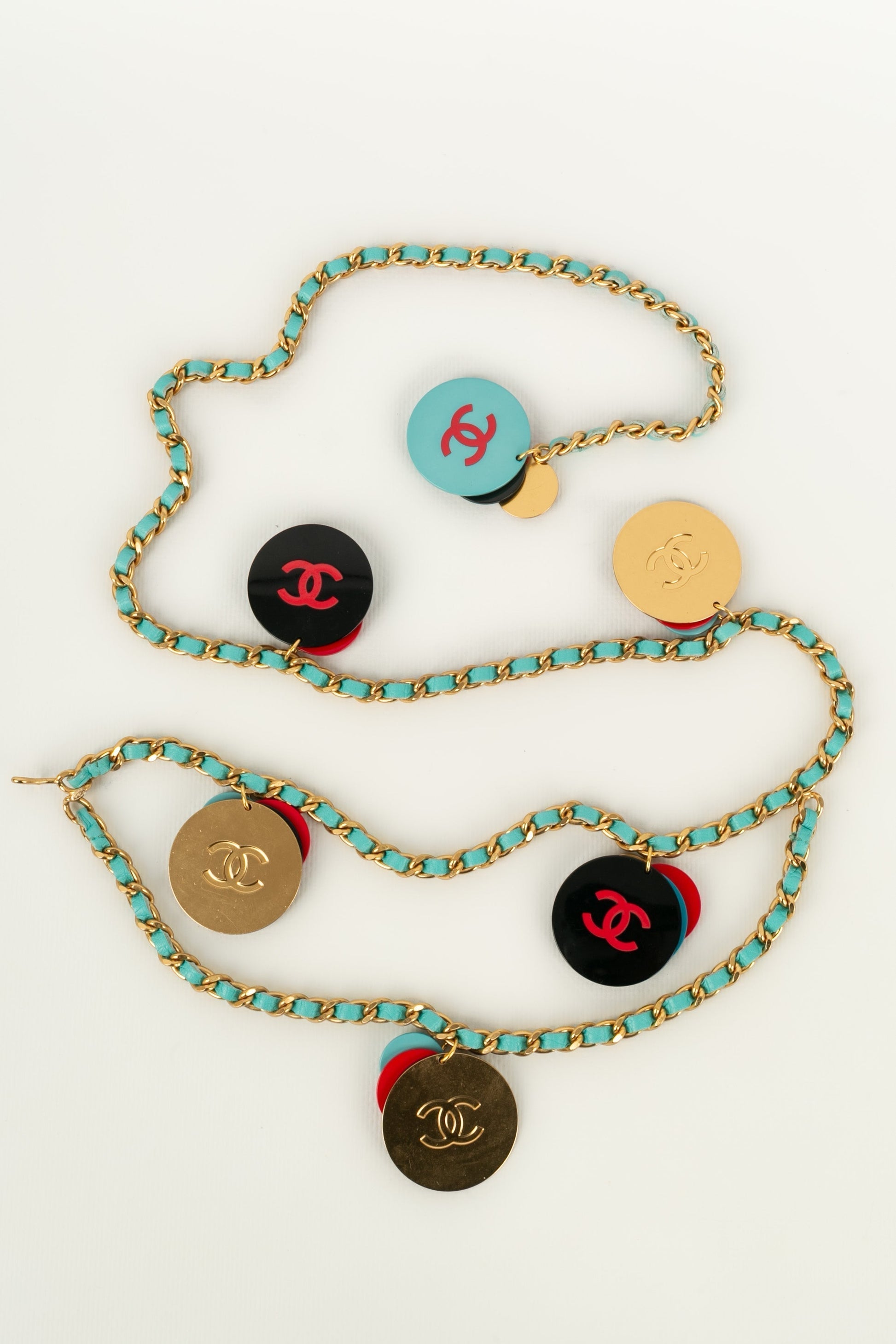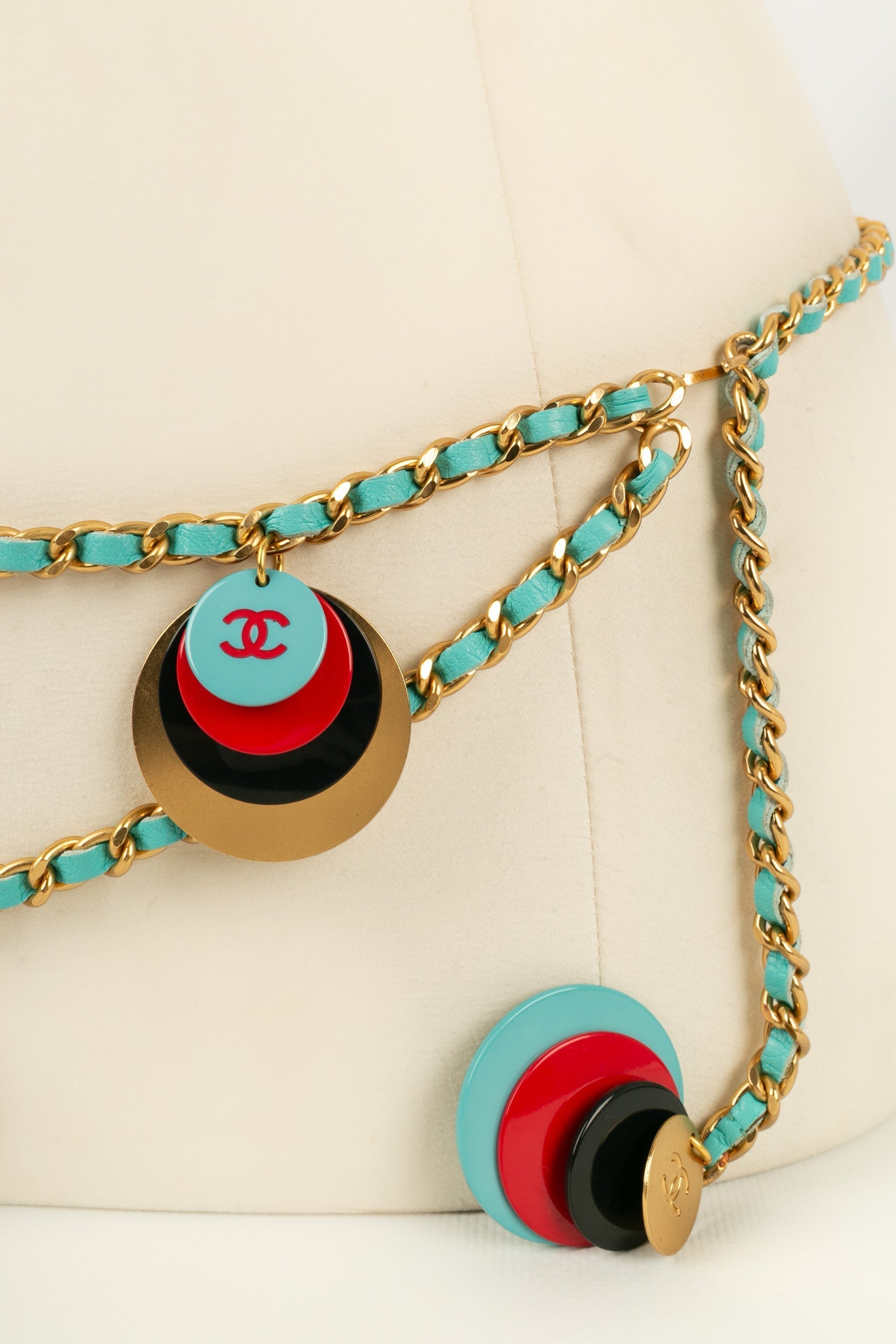 CHANEL - (Made in France) Ceinture en mtal dor entrelace de cuir turquoise et pastilles en mtal dor et rsine. Collection Automne-Hiver 2001.