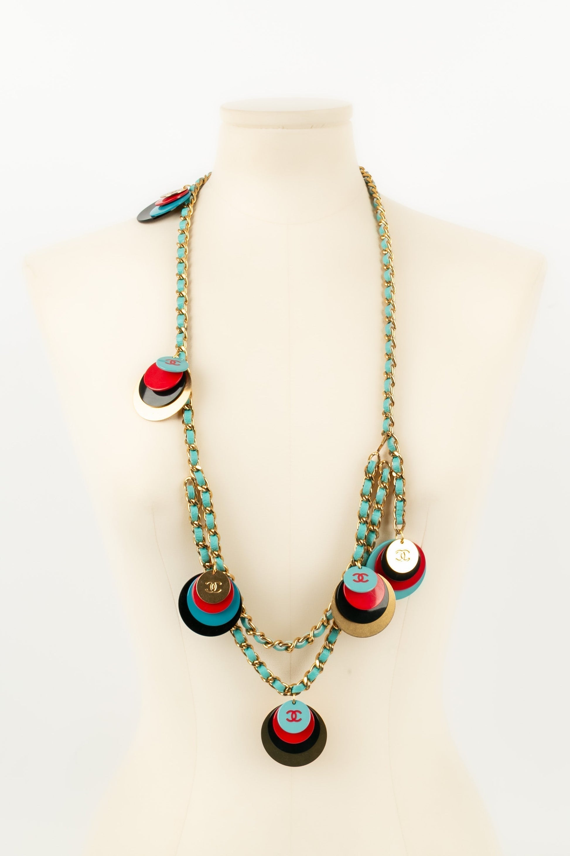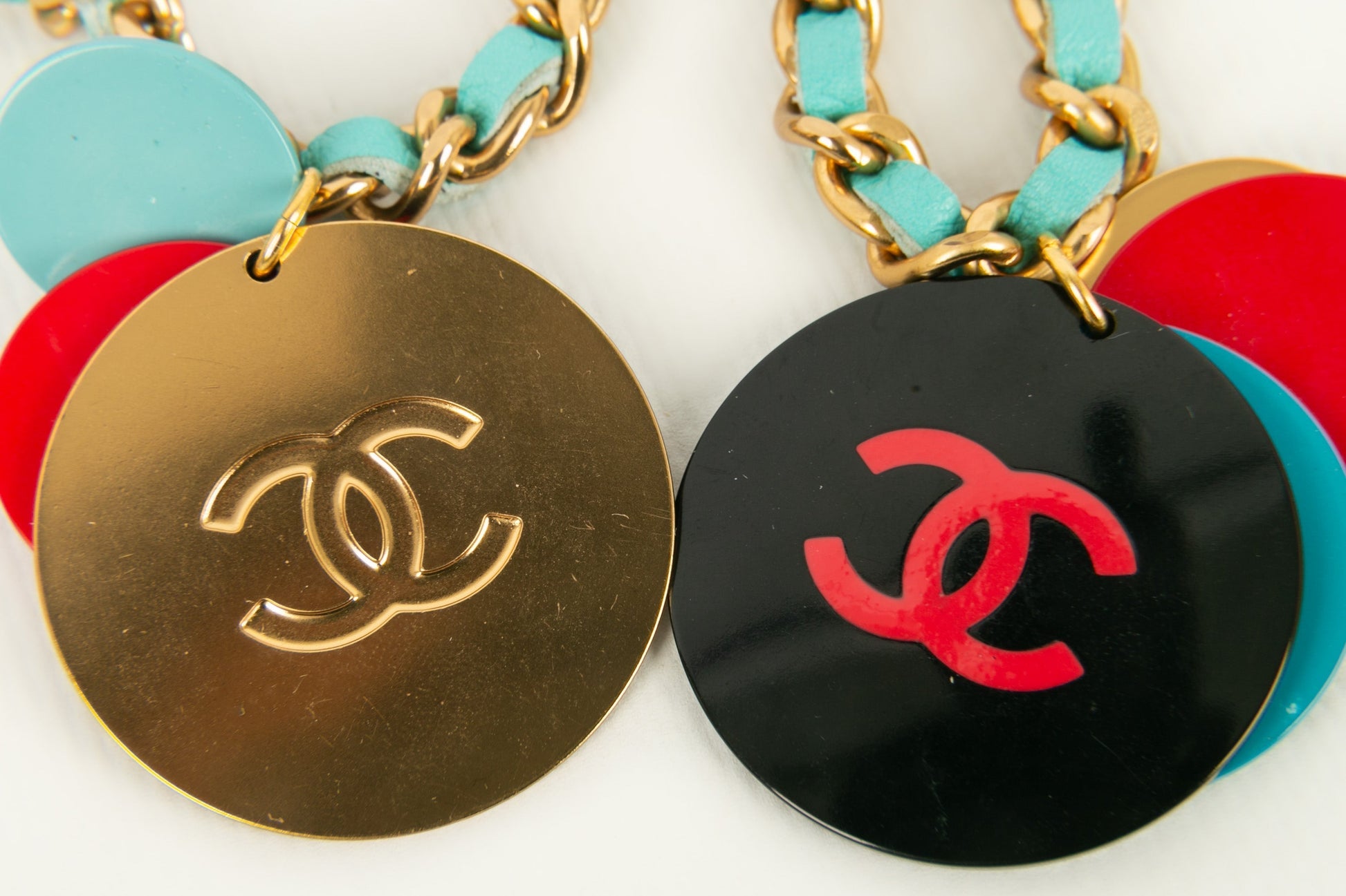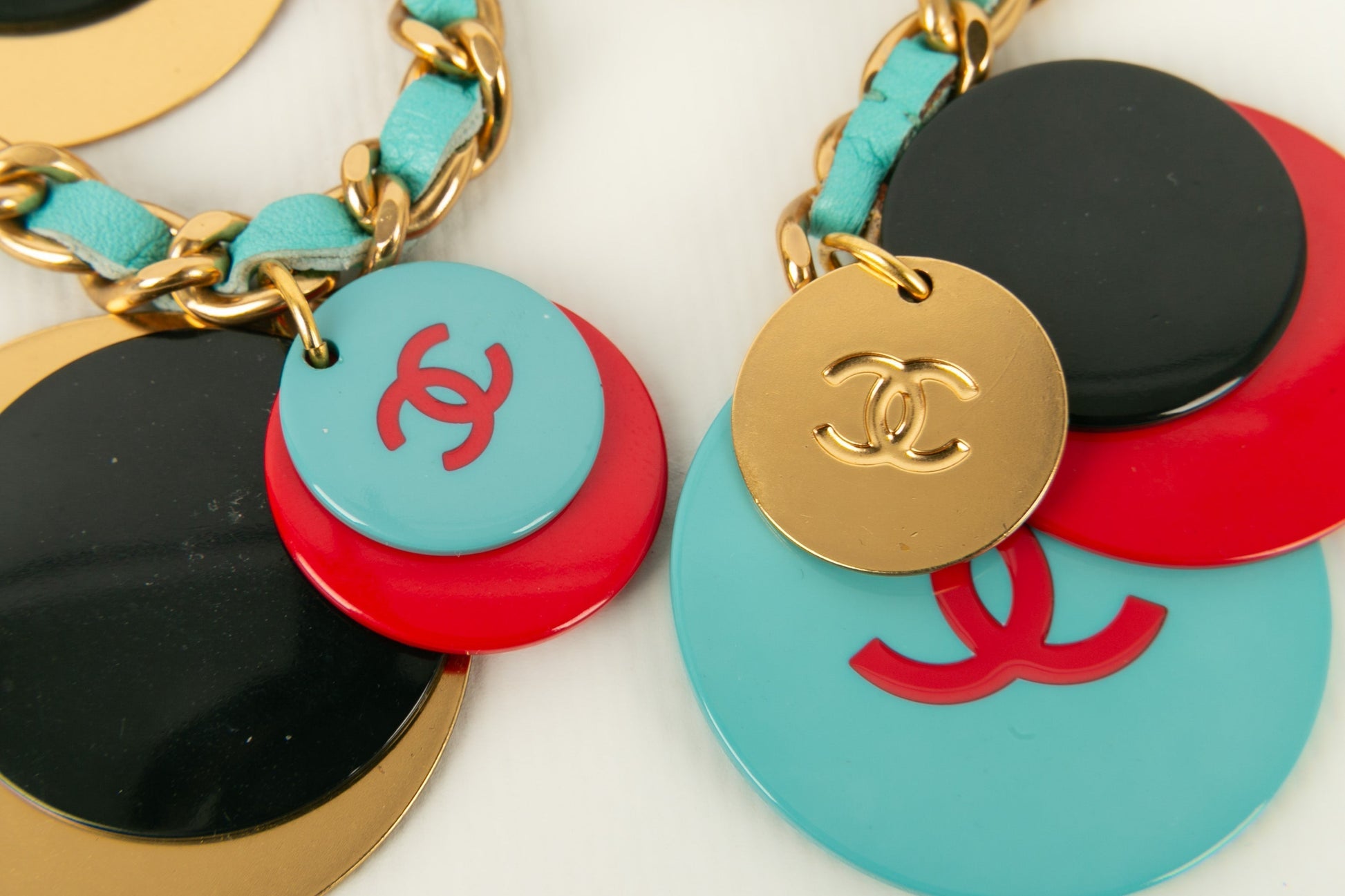 CHANEL - (Made in France) Ceinture en mtal dor entrelace de cuir turquoise et pastilles en mtal dor et rsine. Collection Automne-Hiver 2001.