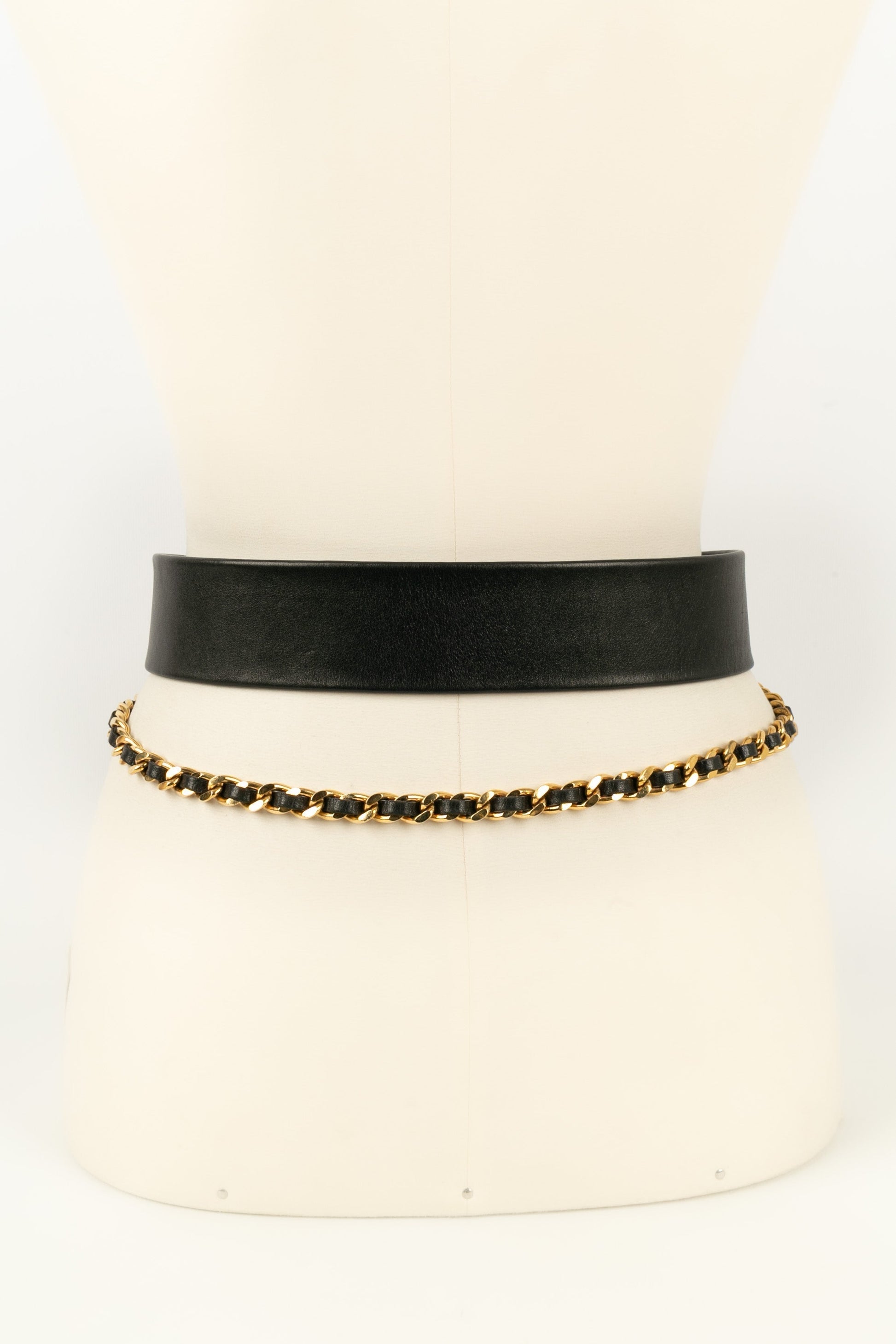 CHANEL -(Made in France) Large ceinture en cuir de veau noir et chaine en mtal dor. Aucune taille indique.