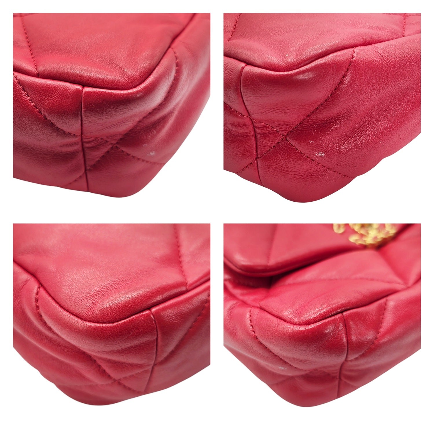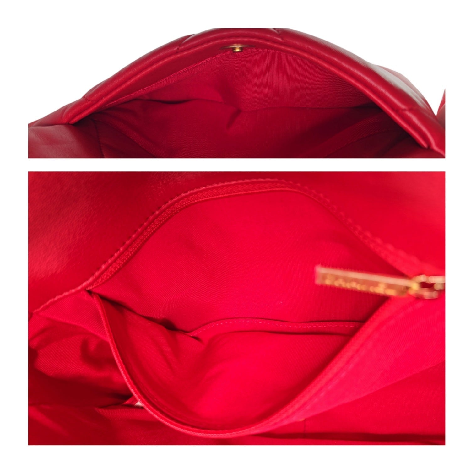 This Chanel Lambskin Quilted Medium Chanel 19 Flap is crafted of oversized quilted lambskin leather in Red. The bag features an aged gold chain detail CC turn lock on the flap, a magnetic snap pocket at the rear, and a leather threaded aged gold, ruthenium, and dark silver chain link shoulder strap with a leather shoulder pad. The front flap opens to a matching fabric interior with a zipper pocket.