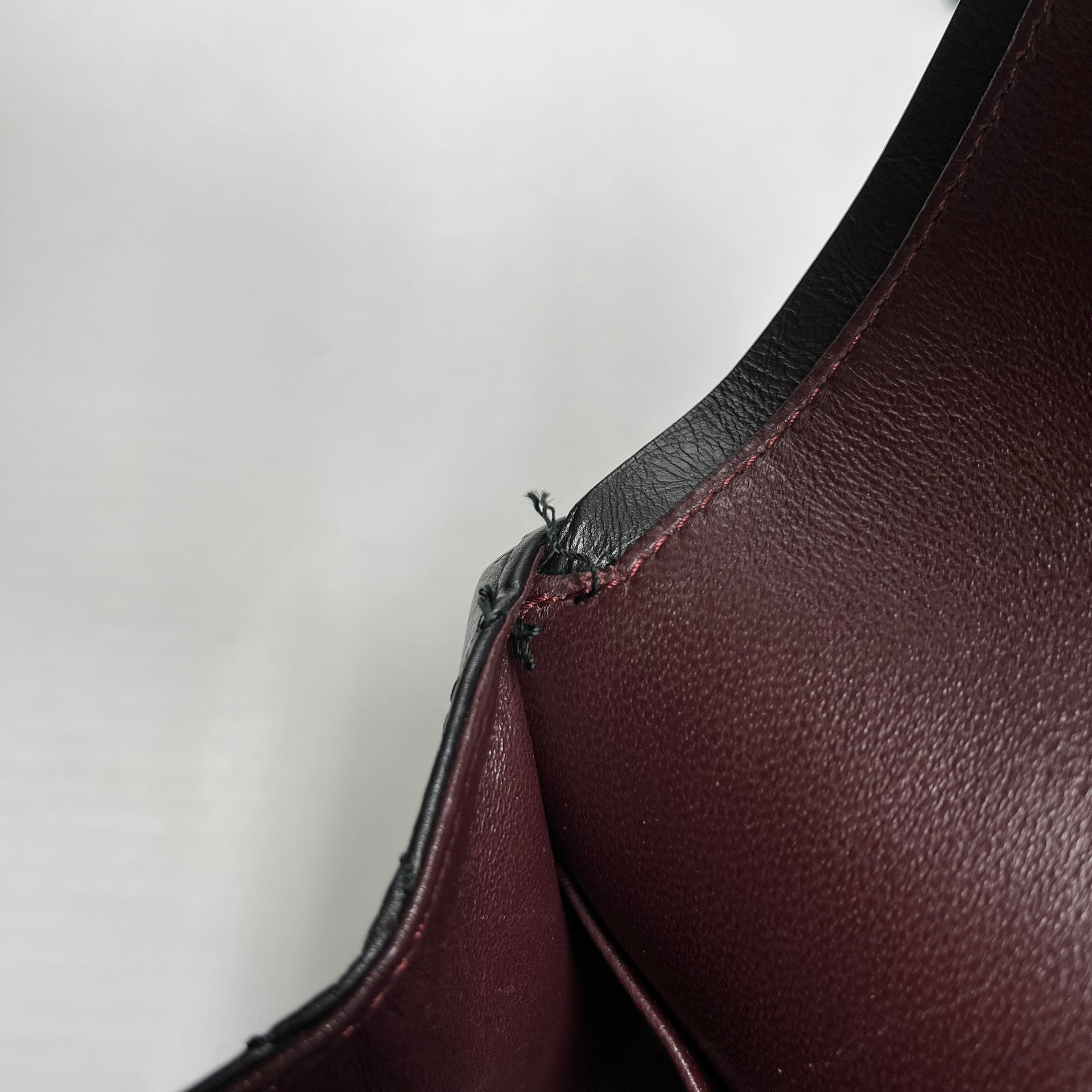 Well New (This item is in very New condition with slight creasing and dents on leather, one small mark on bottom, one obvious mark inside, sign of use inside, stitch lose on one side.)