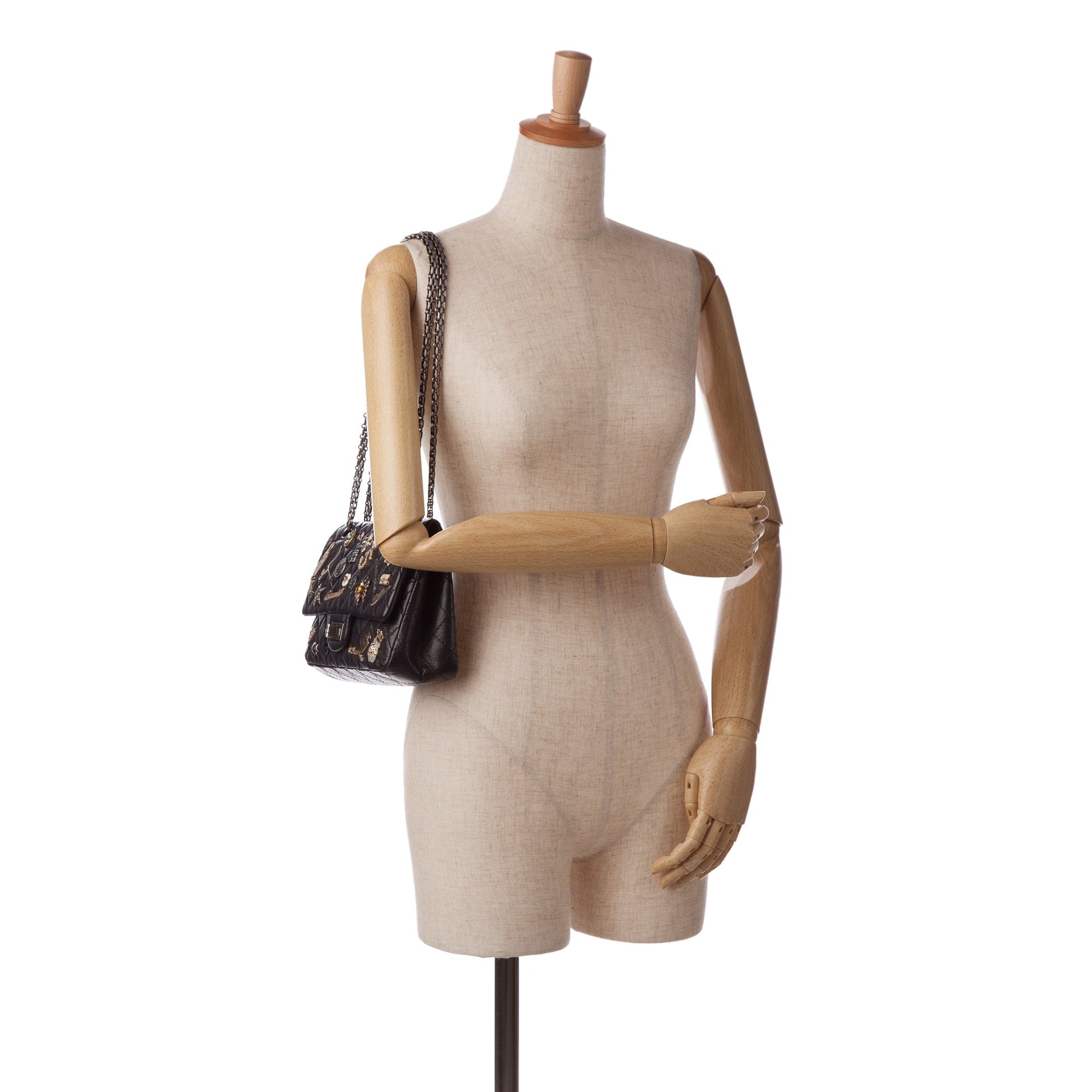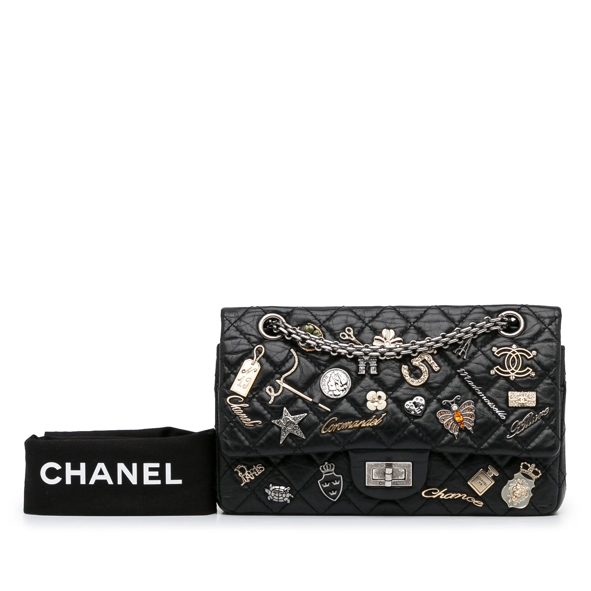 This unique Chanel 2.55 Reissue Flap Bag is made of black lambskin leather with Lucky Charms charms, a shoulder strap with a silver-tone chain, a flap with a twist closure, an outer slip pocket and inner slip pockets. This Bag can be worn loosely over the shoulder.