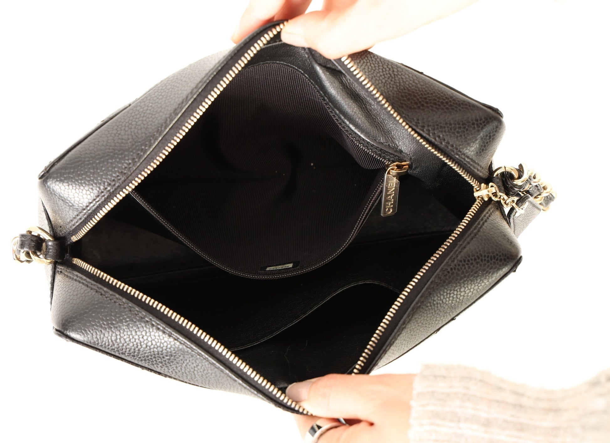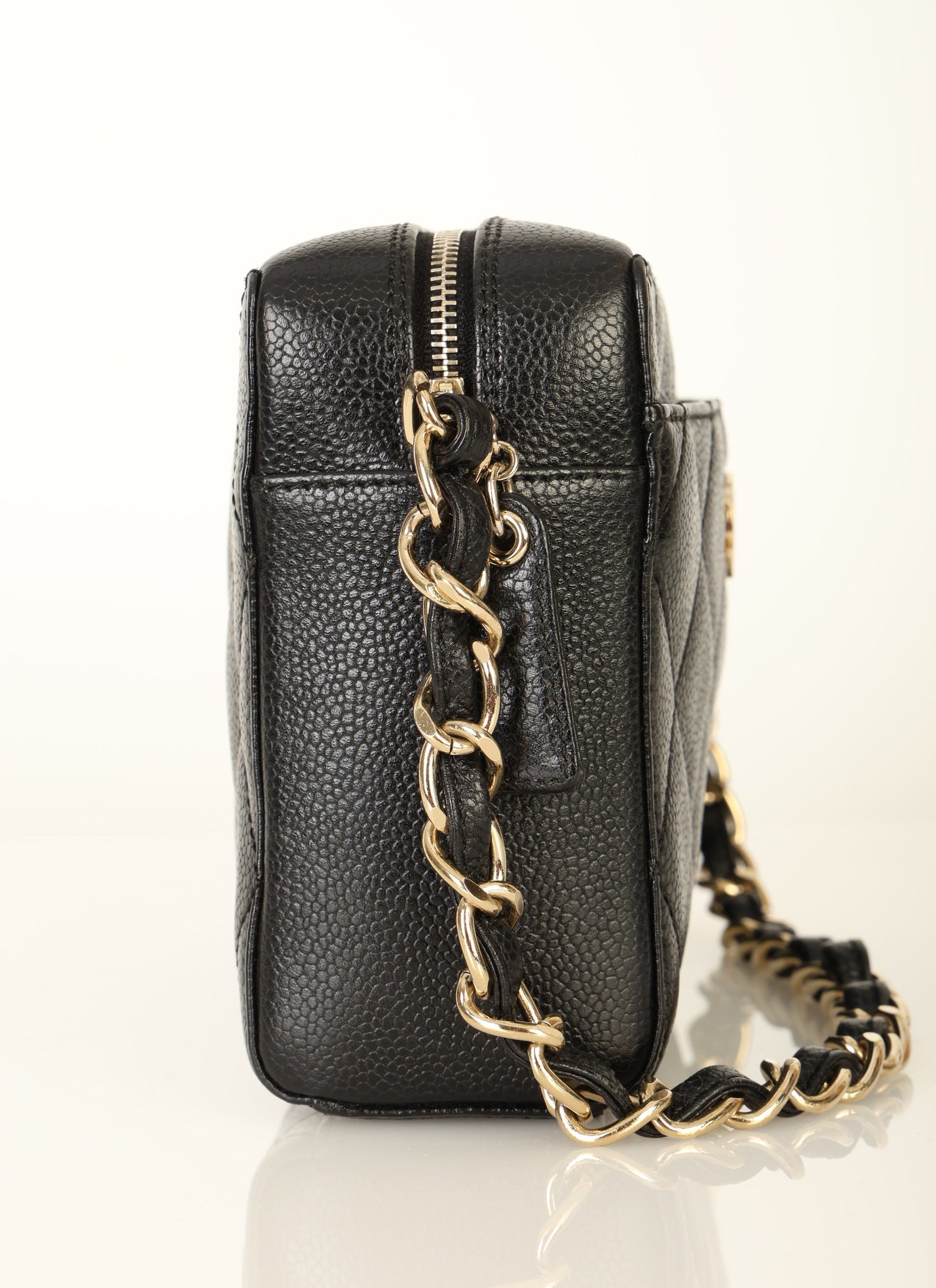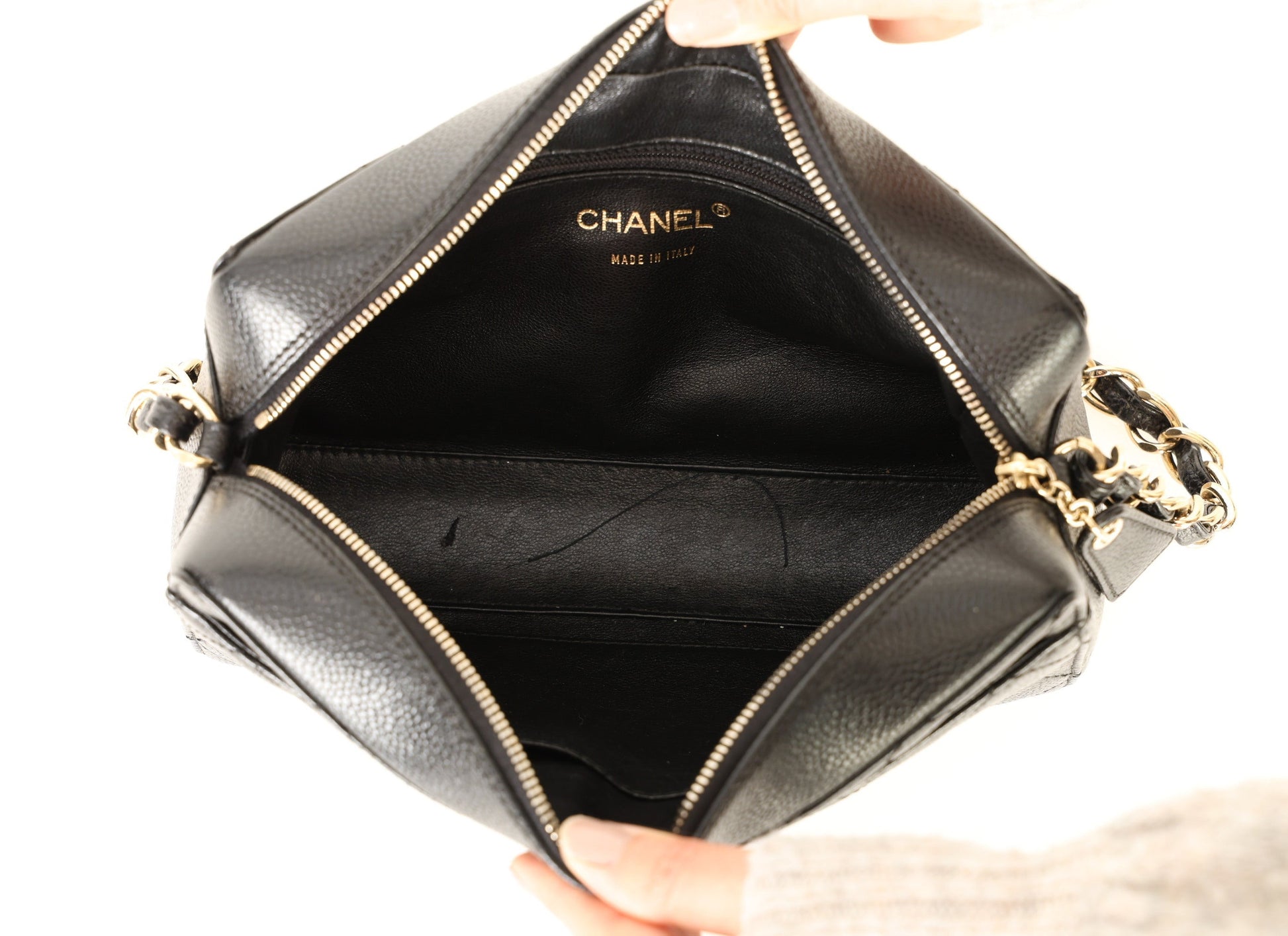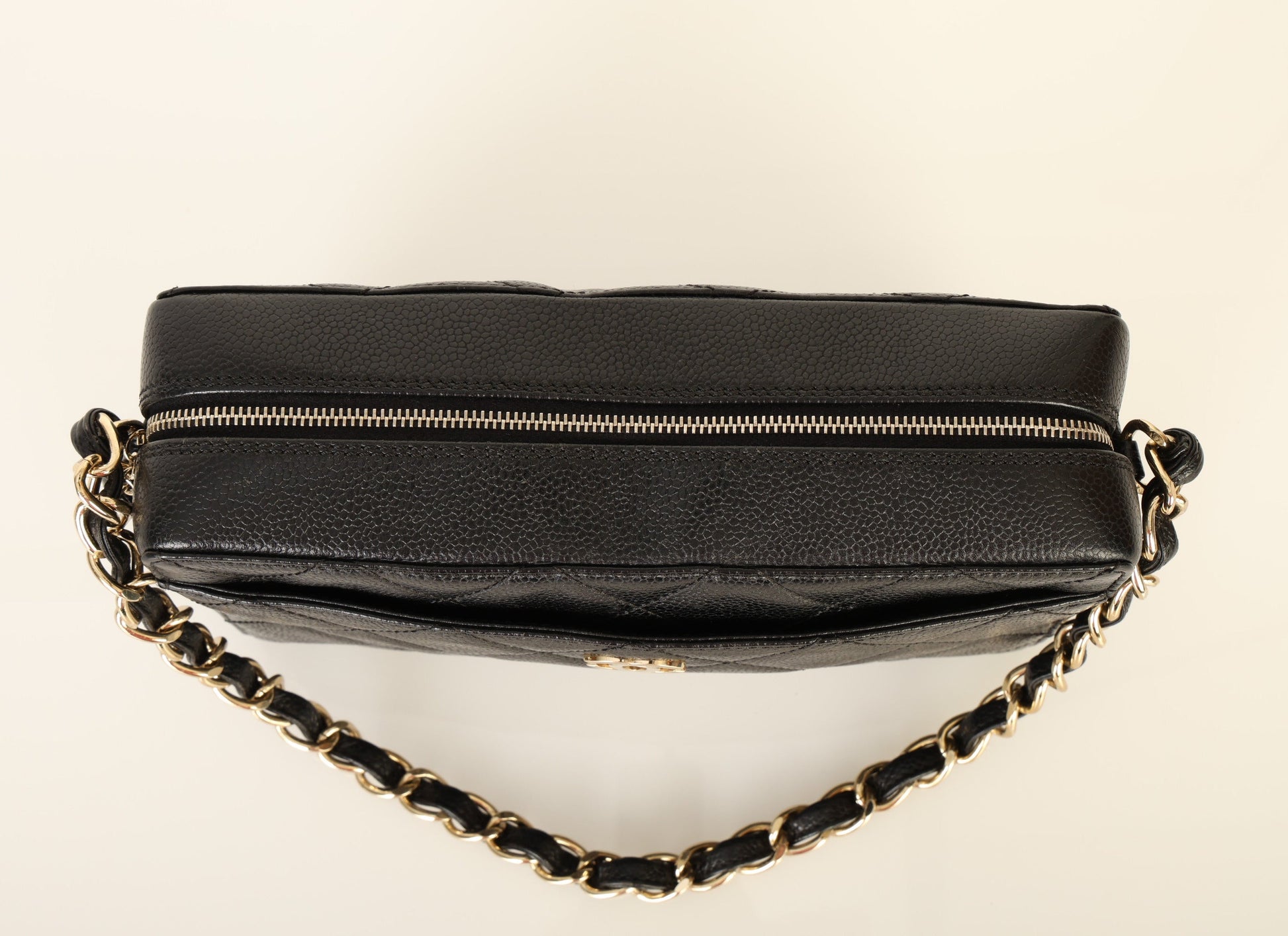 Dropping in the shop is a 2002?Chanel Caviar Chain Shoulder Bag in black with champagne gold hardware! This piece fits perfectly underneath the shoulder and is such a great everyday bag. The front features the iconic CC logo with a large front pocket. The interior features one large compartment, and two smaller compartments, one being zipped. Crafted from durable caviar, this will be your next go-to everyday bag! You can fit your iPad Mini/Kindle and the rest of your daily essentials.?