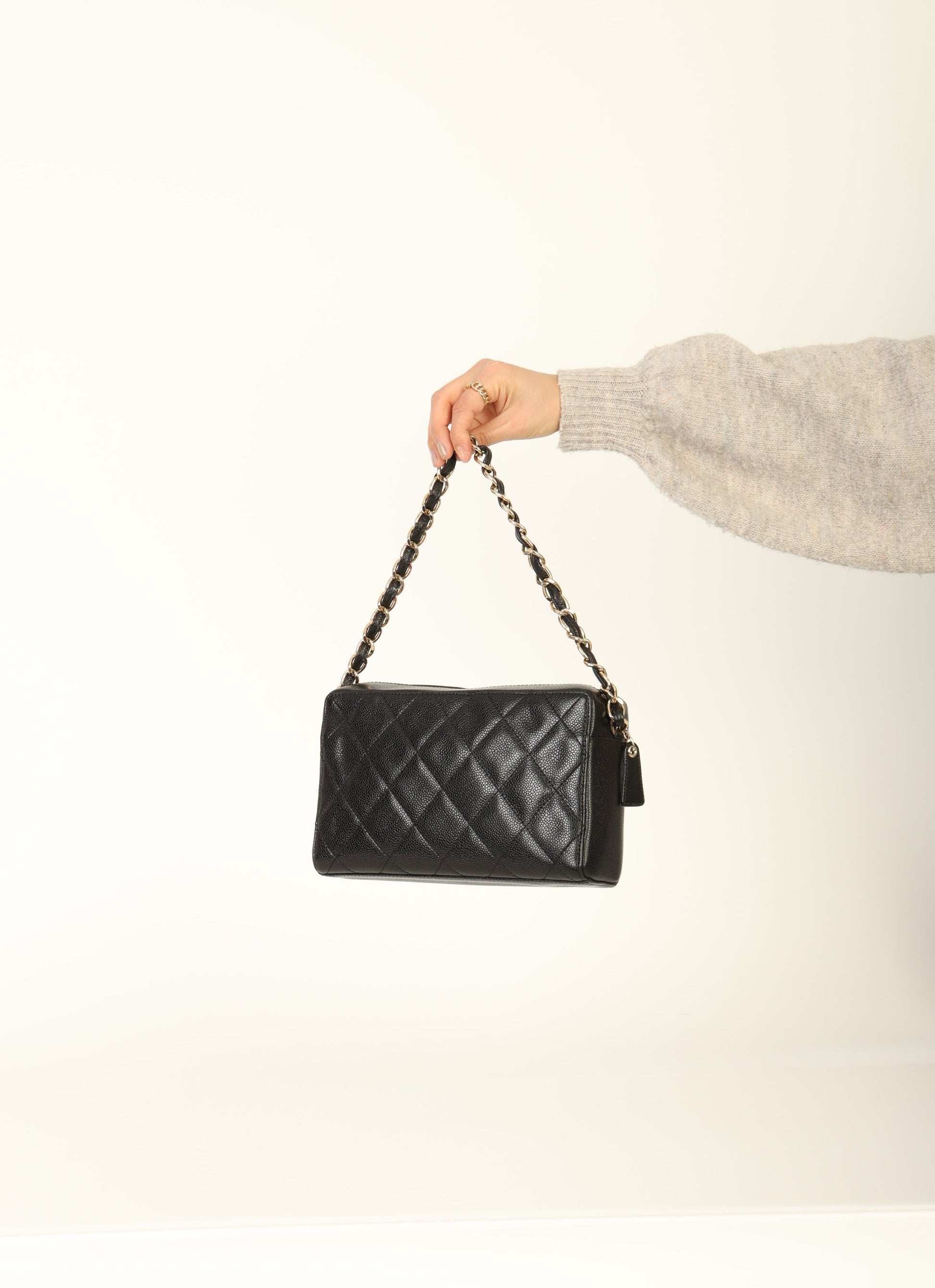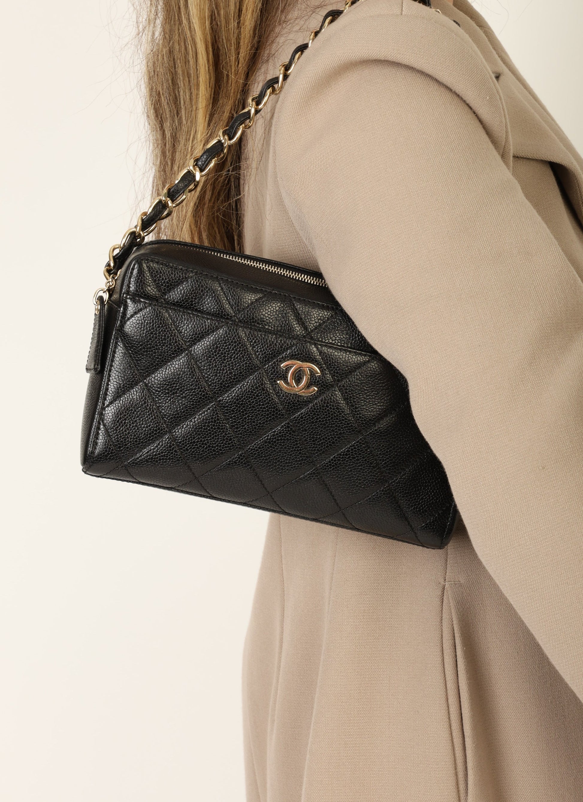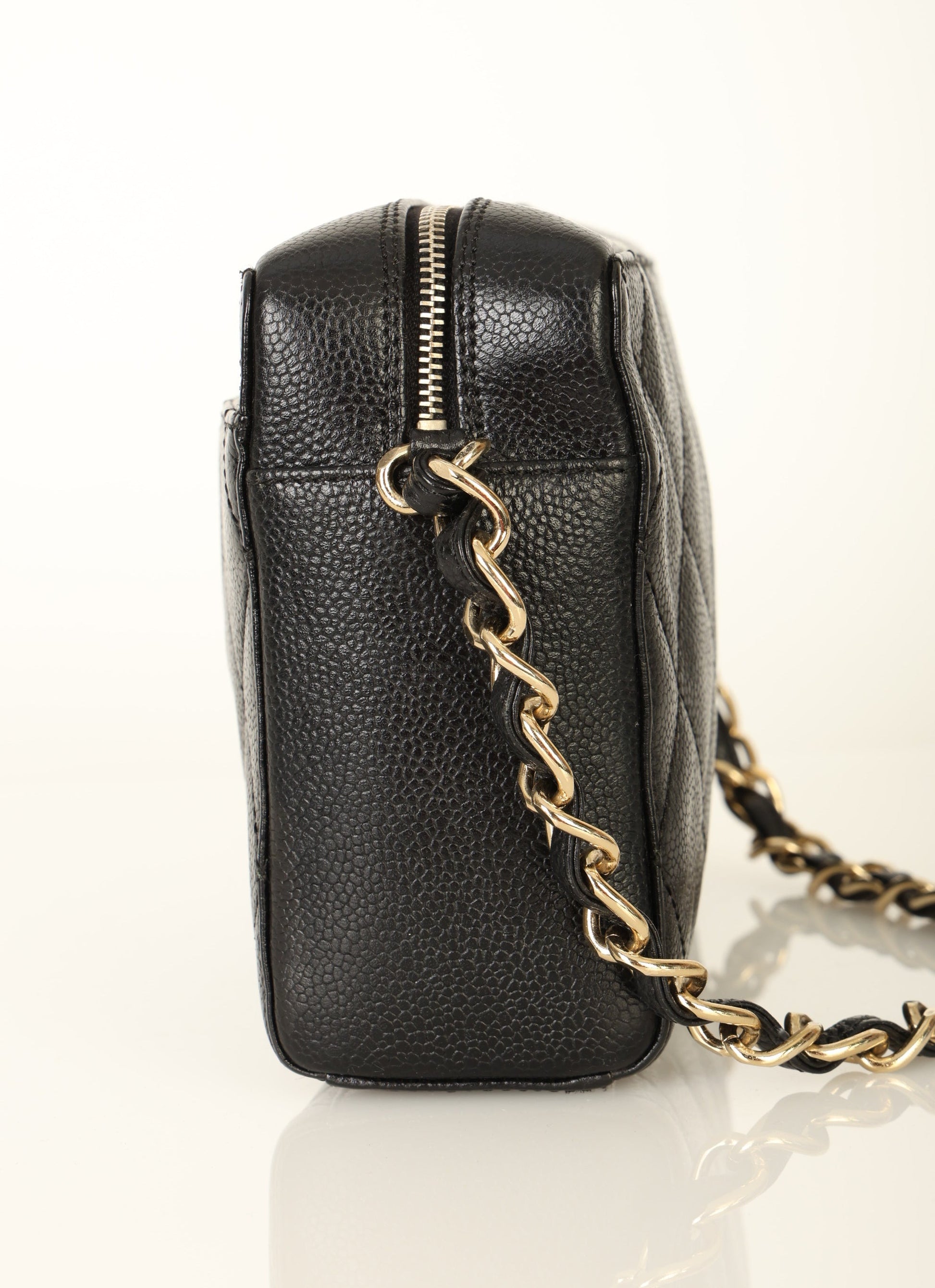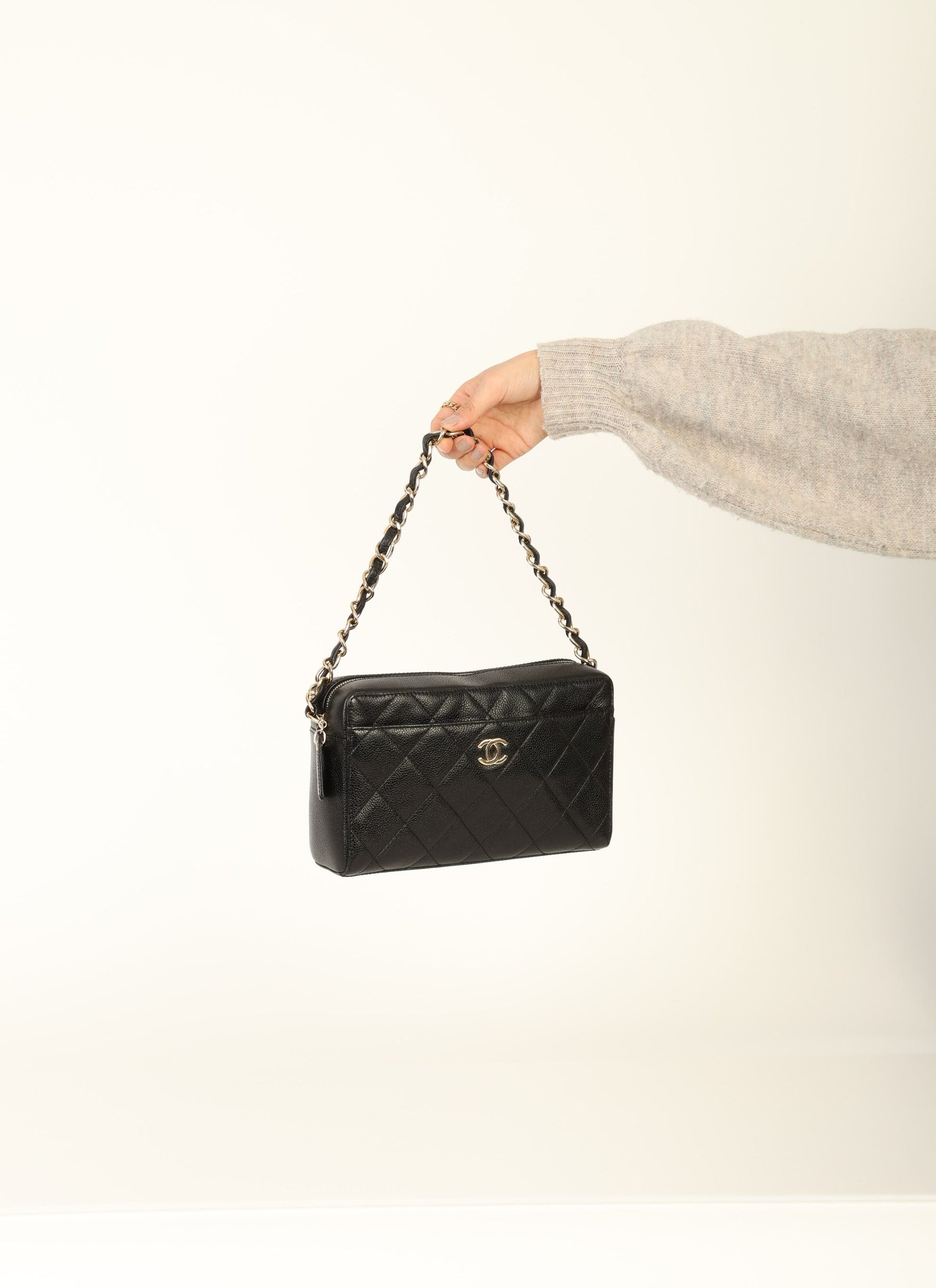 Dropping in the shop is a 2002?Chanel Caviar Chain Shoulder Bag in black with champagne gold hardware! This piece fits perfectly underneath the shoulder and is such a great everyday bag. The front features the iconic CC logo with a large front pocket. The interior features one large compartment, and two smaller compartments, one being zipped. Crafted from durable caviar, this will be your next go-to everyday bag! You can fit your iPad Mini/Kindle and the rest of your daily essentials.?