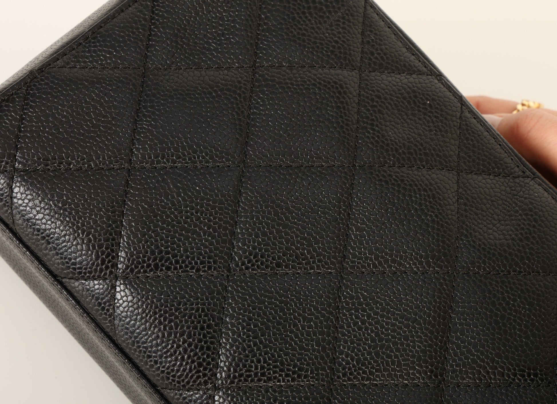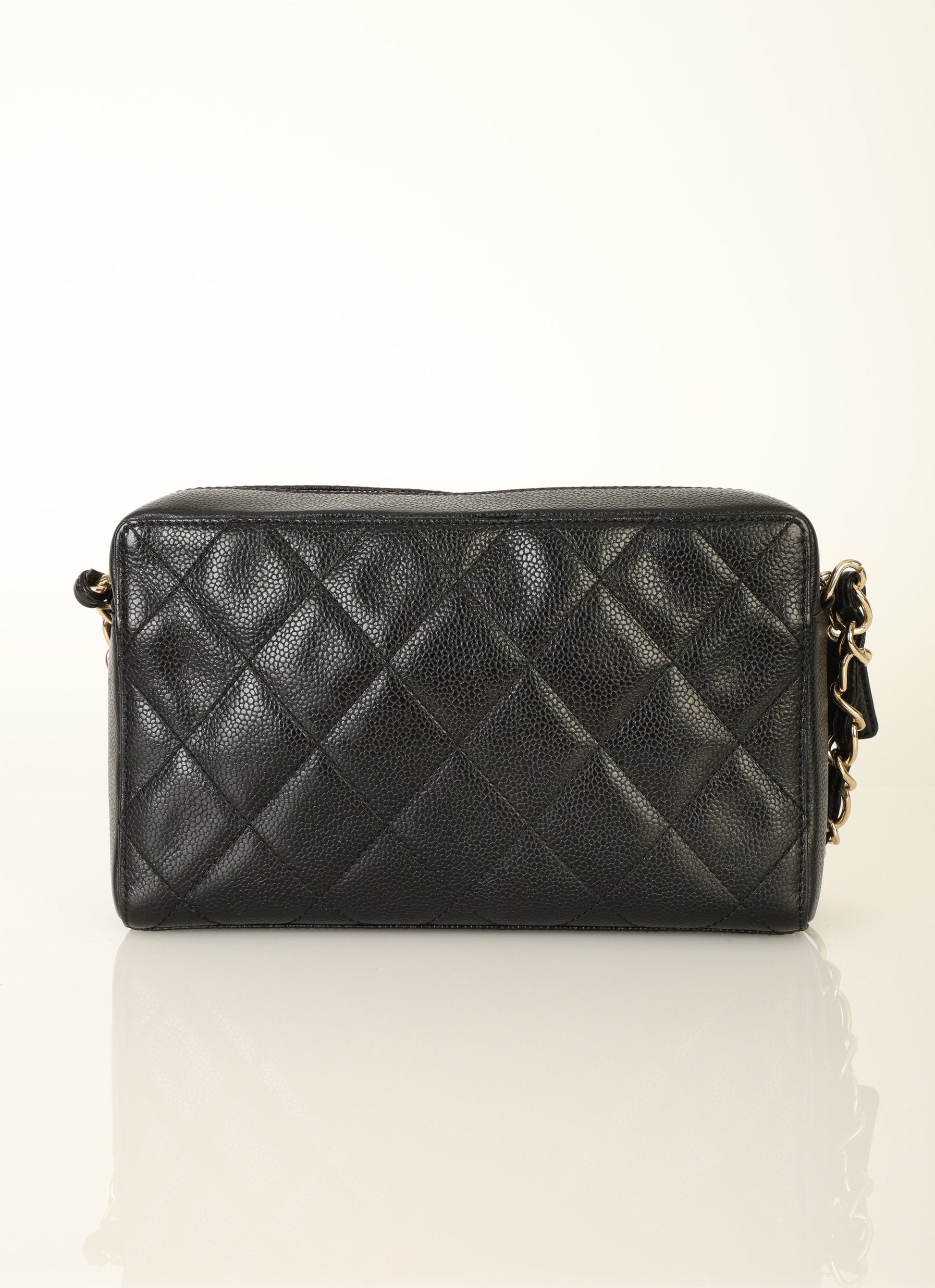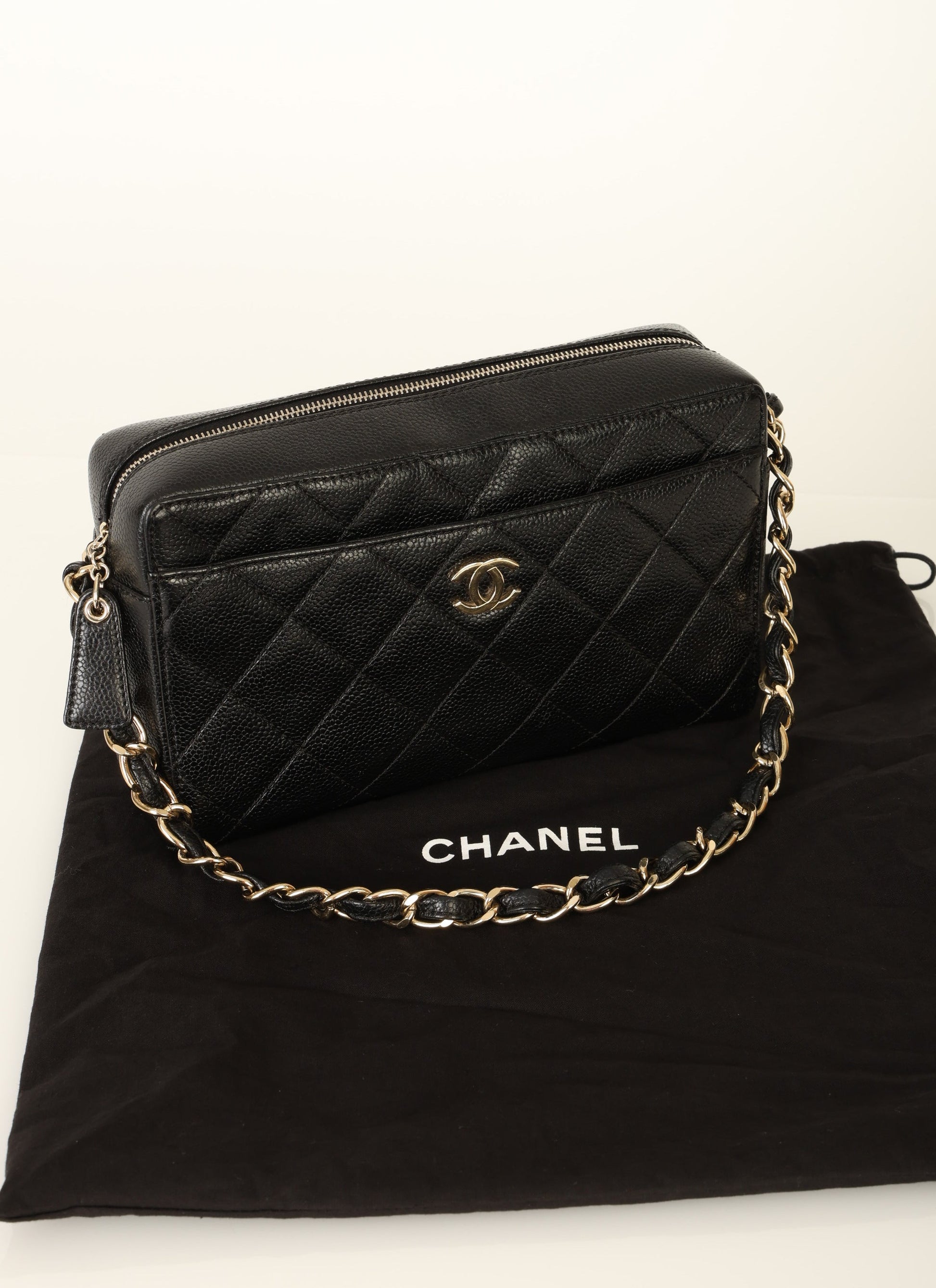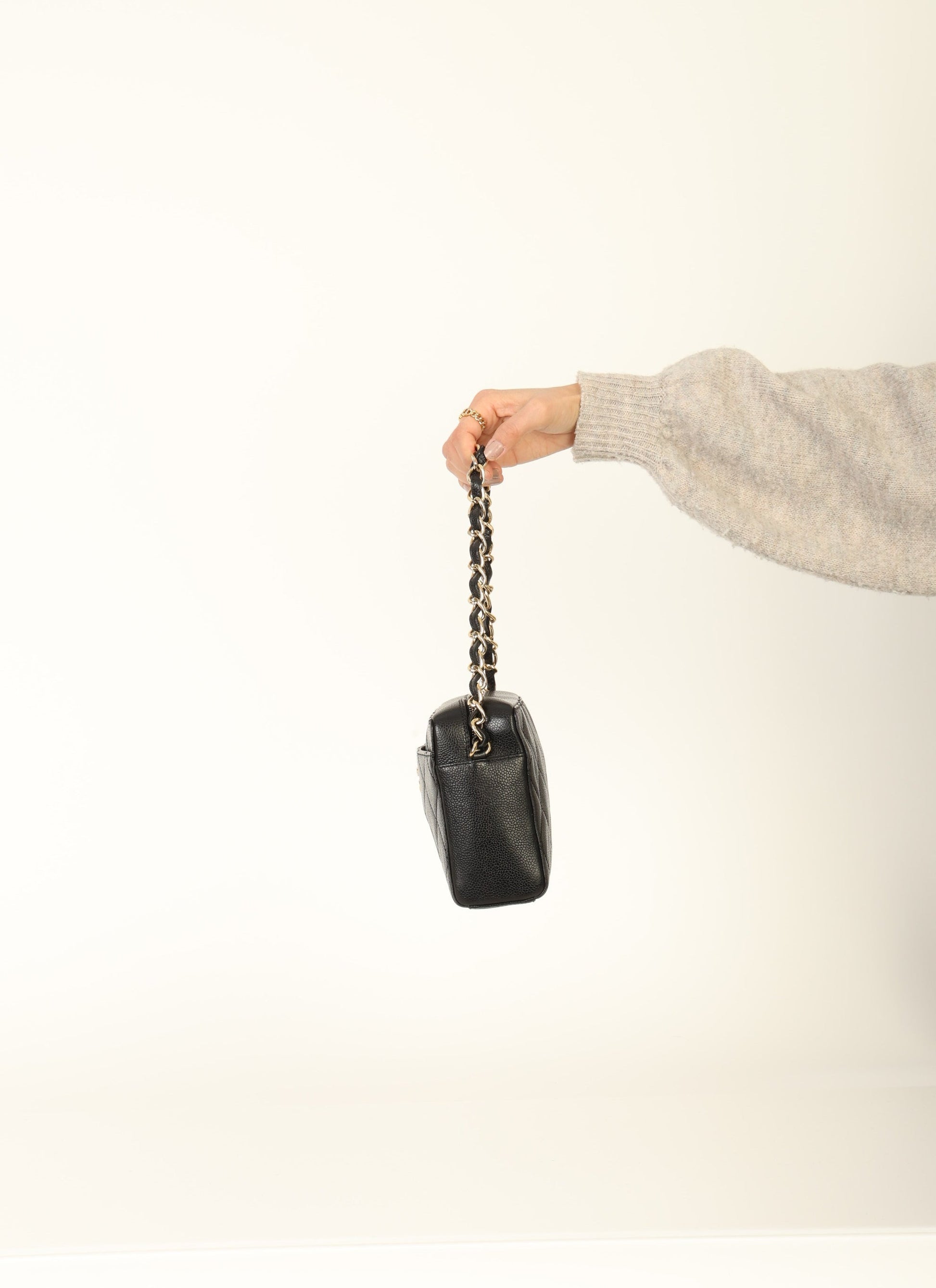 Dropping in the shop is a 2002?Chanel Caviar Chain Shoulder Bag in black with champagne gold hardware! This piece fits perfectly underneath the shoulder and is such a great everyday bag. The front features the iconic CC logo with a large front pocket. The interior features one large compartment, and two smaller compartments, one being zipped. Crafted from durable caviar, this will be your next go-to everyday bag! You can fit your iPad Mini/Kindle and the rest of your daily essentials.?