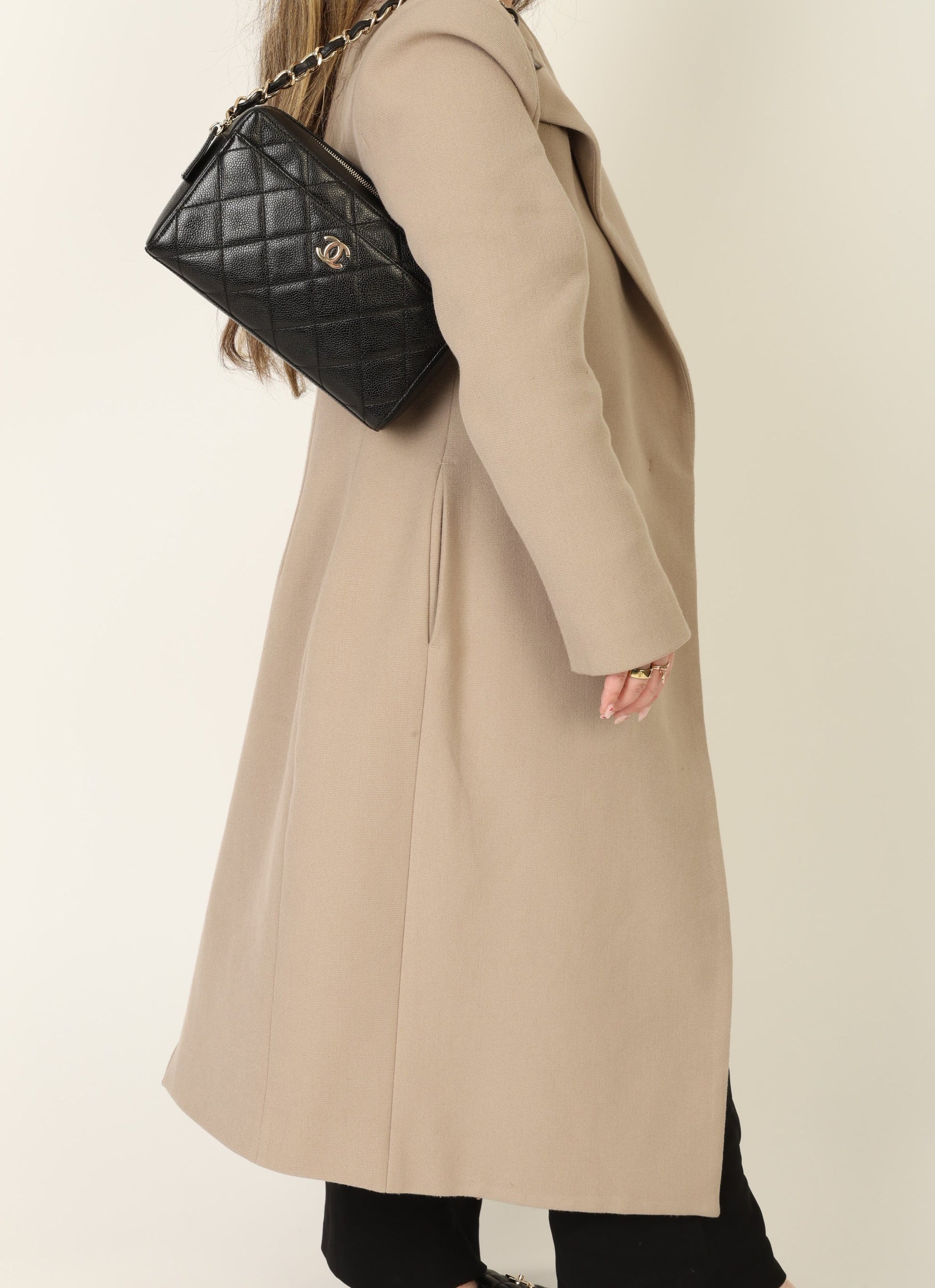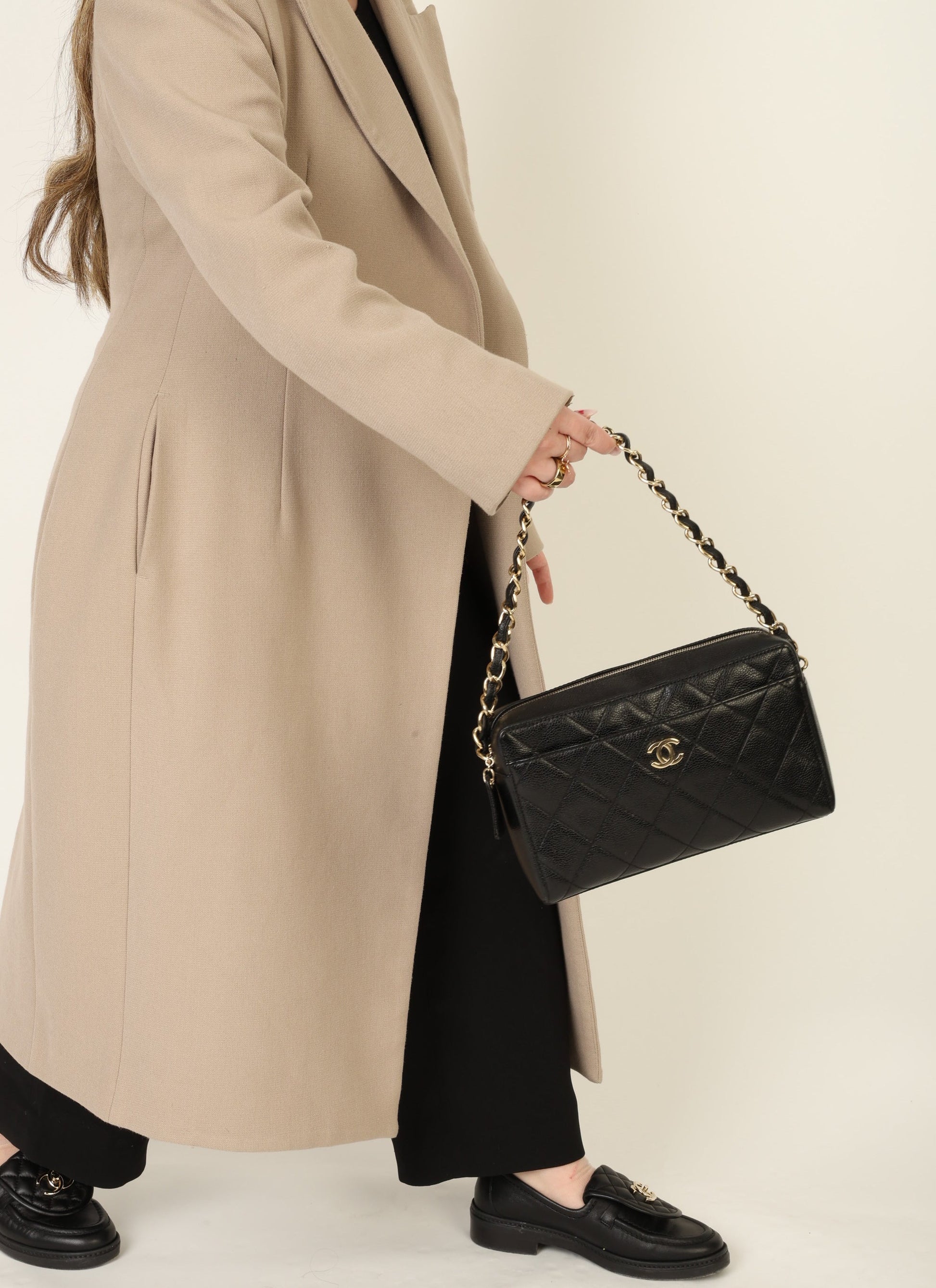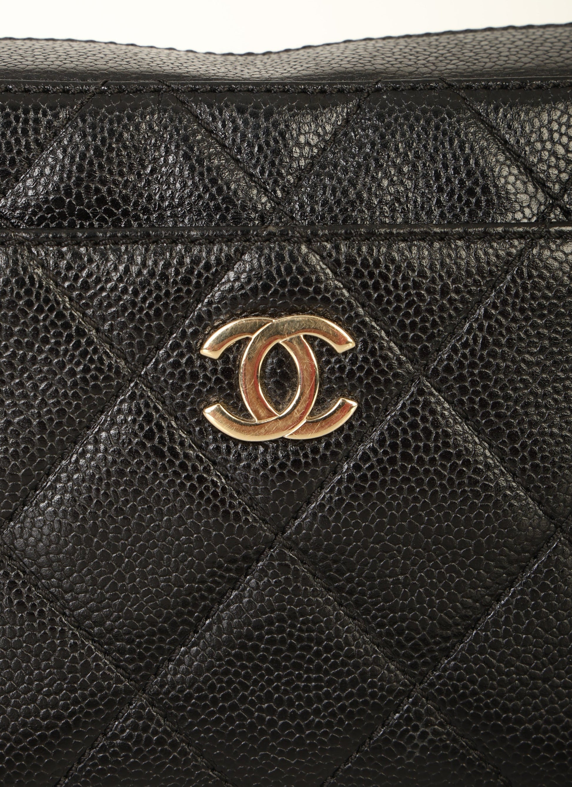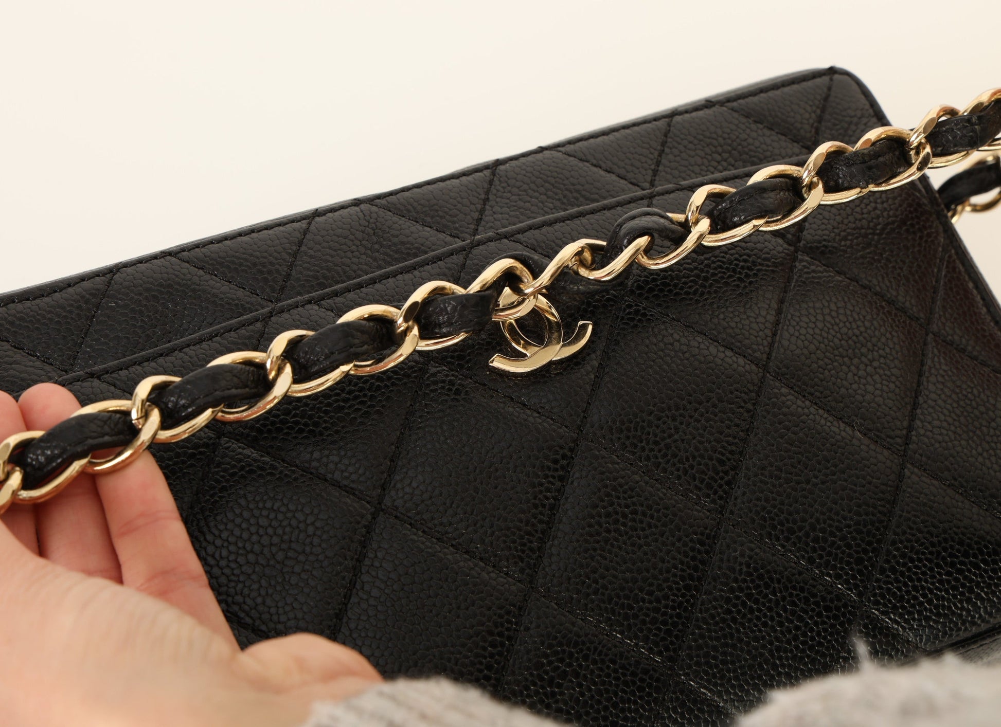 Dropping in the shop is a 2002?Chanel Caviar Chain Shoulder Bag in black with champagne gold hardware! This piece fits perfectly underneath the shoulder and is such a great everyday bag. The front features the iconic CC logo with a large front pocket. The interior features one large compartment, and two smaller compartments, one being zipped. Crafted from durable caviar, this will be your next go-to everyday bag! You can fit your iPad Mini/Kindle and the rest of your daily essentials.?