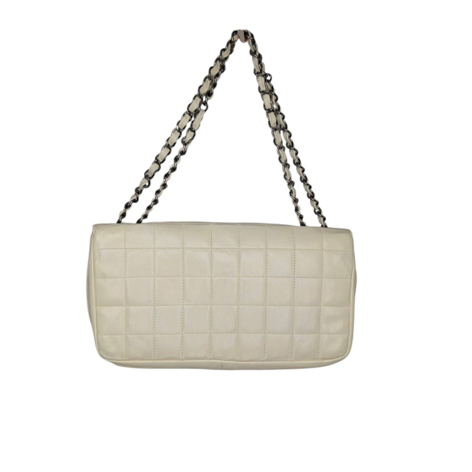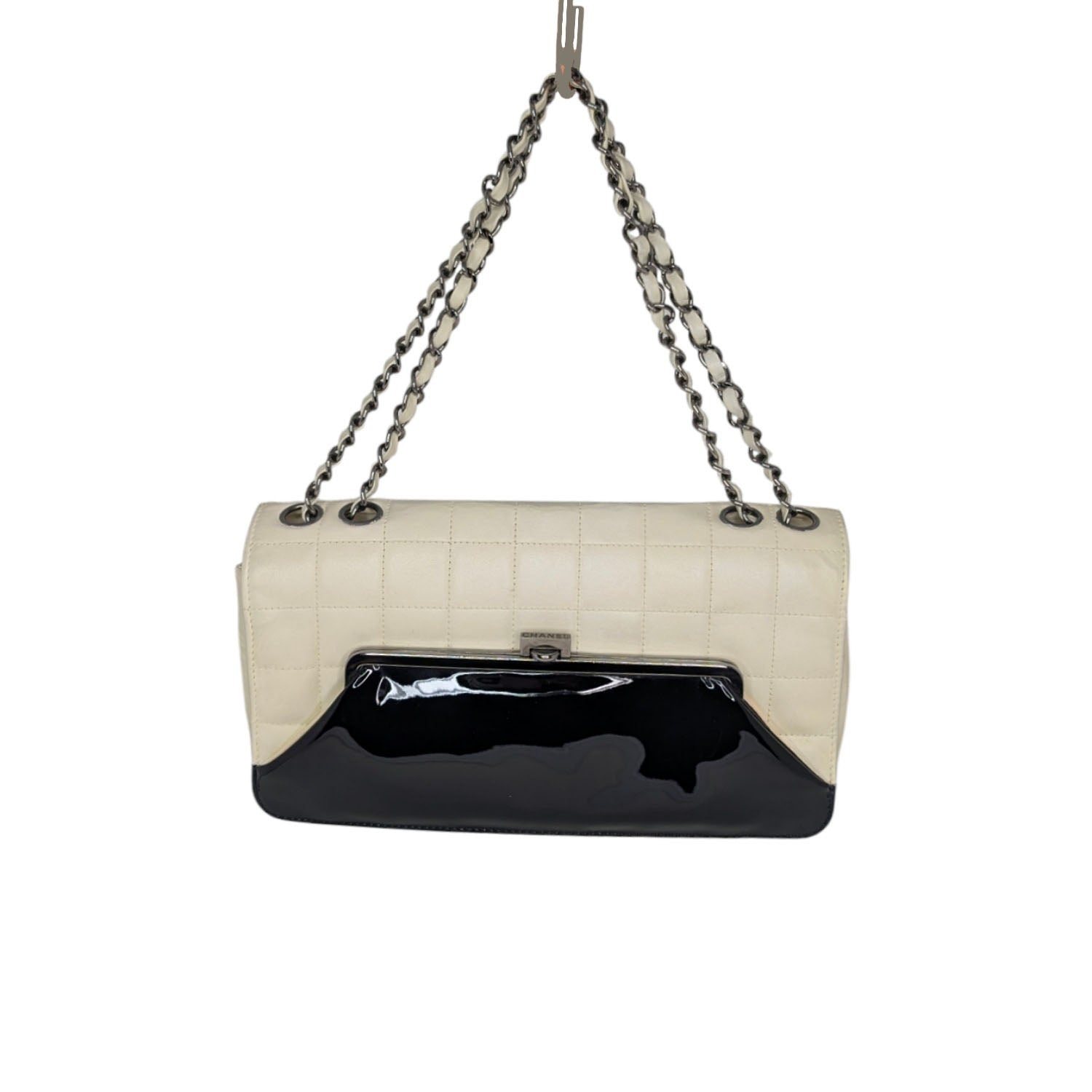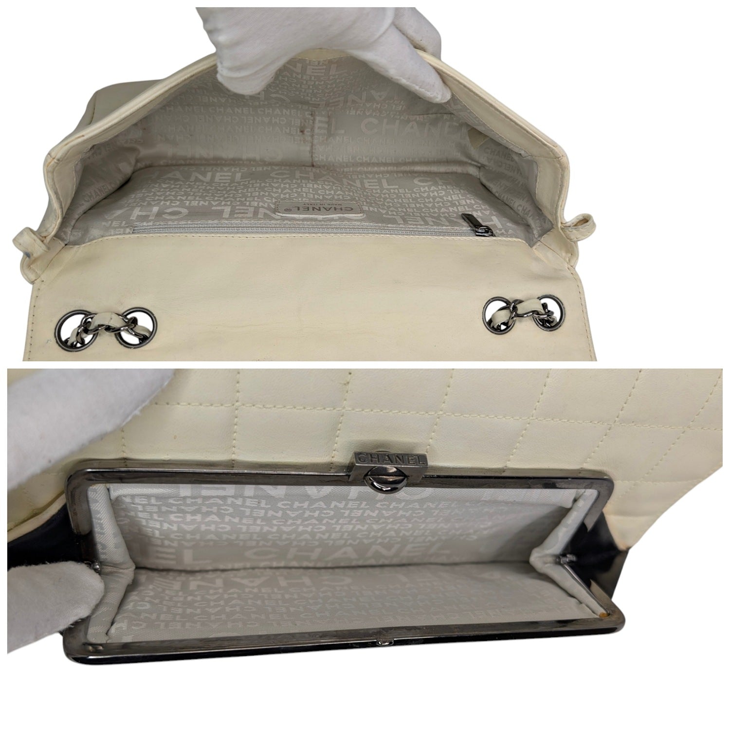 From the 2006 Cruise Collection; Chanel Chocolate Bar Quilted Lambskin Bicolor Kiss-Lock Flap. This stylish bag is crafted from quilted lambskin in cream with black patent leather trim. It features leather and chain entwined shoulder straps, a front patent leather kiss-lock pouch, flap top with magnetic snap closure, light grey logo jacquard lined interior compartment with a zip pocket, and ruthenium-tone hardware.