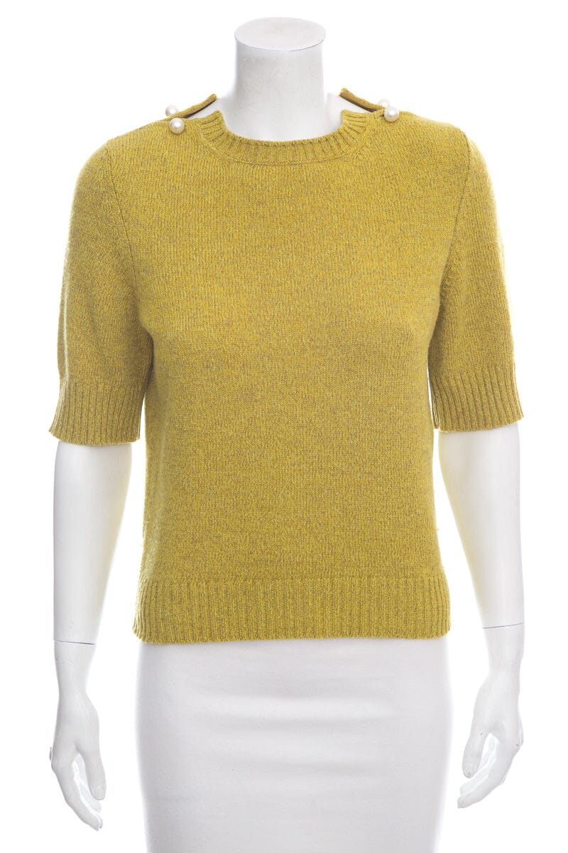 Chanel 2007 Chartreuse Short Sleeve Sweater with Pearl Shoulder Detail. This item is in New condition; some pilling.