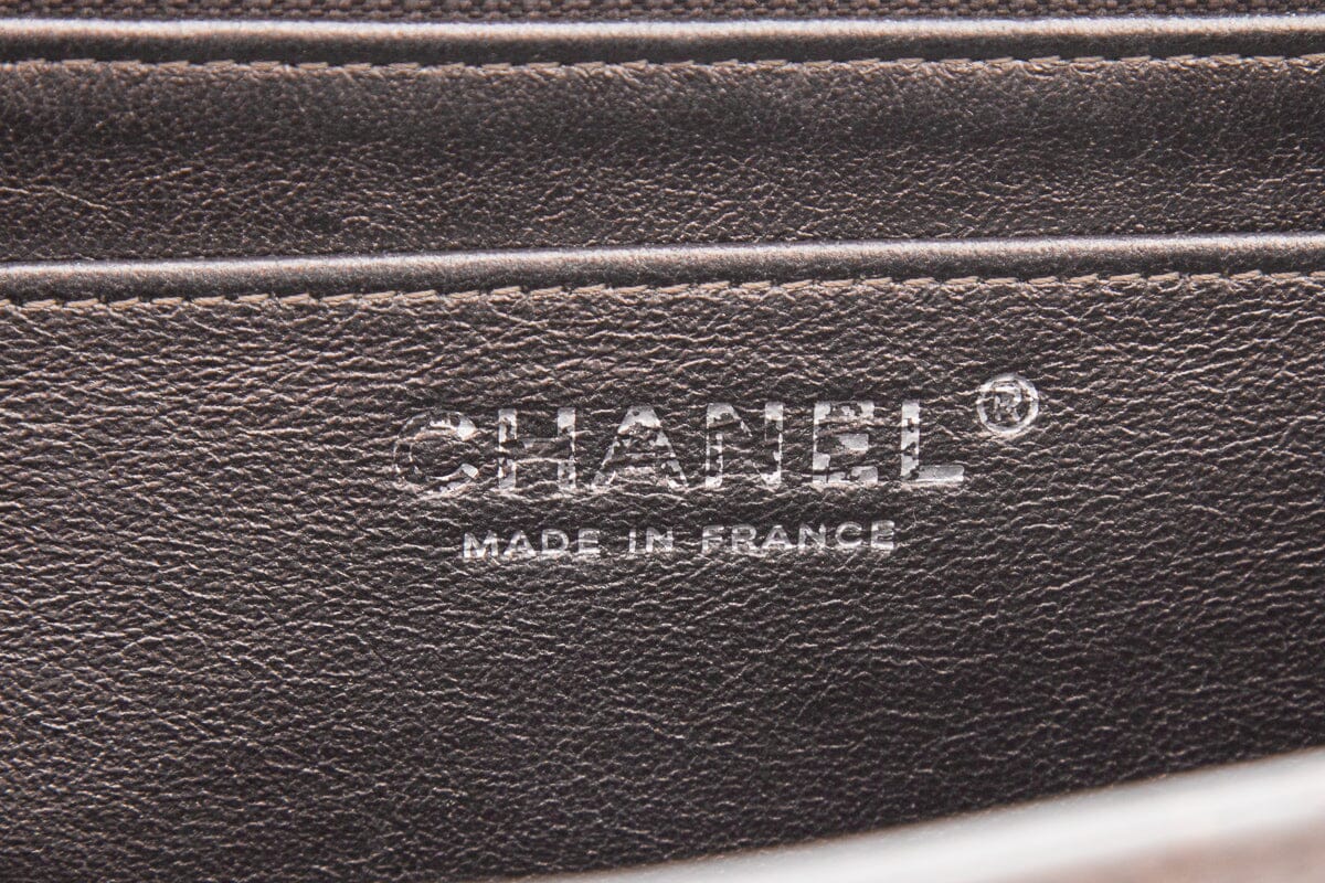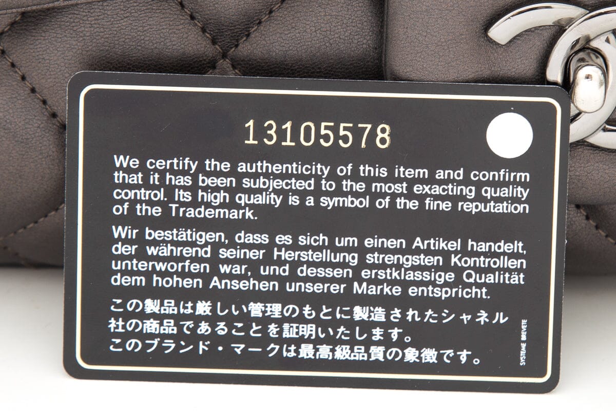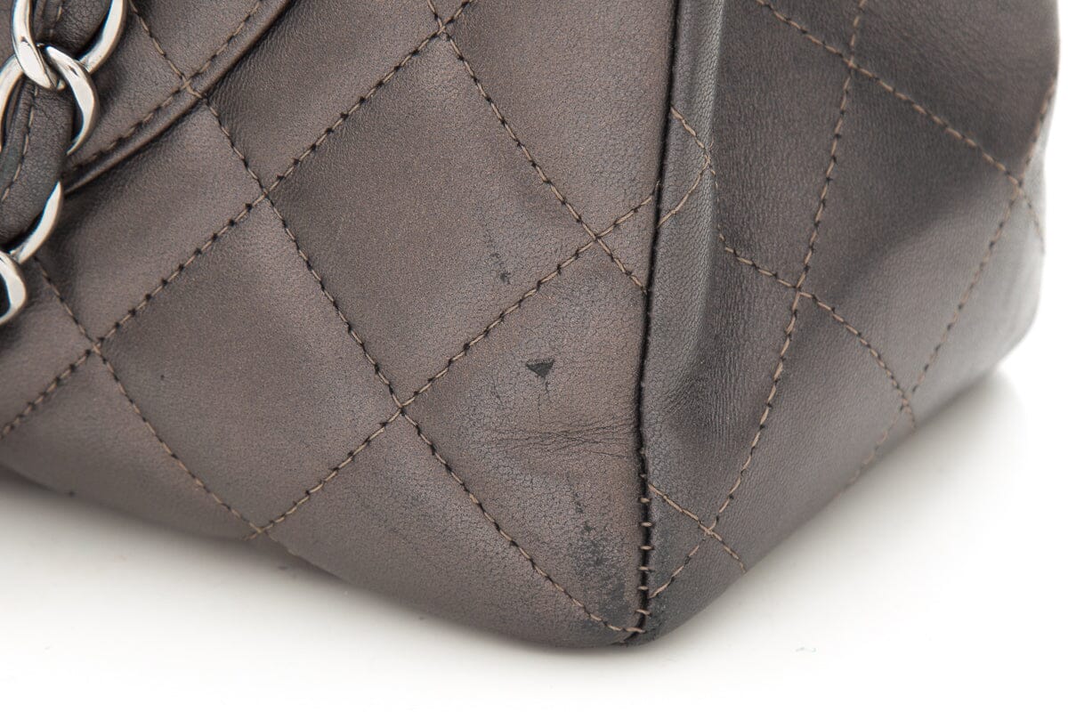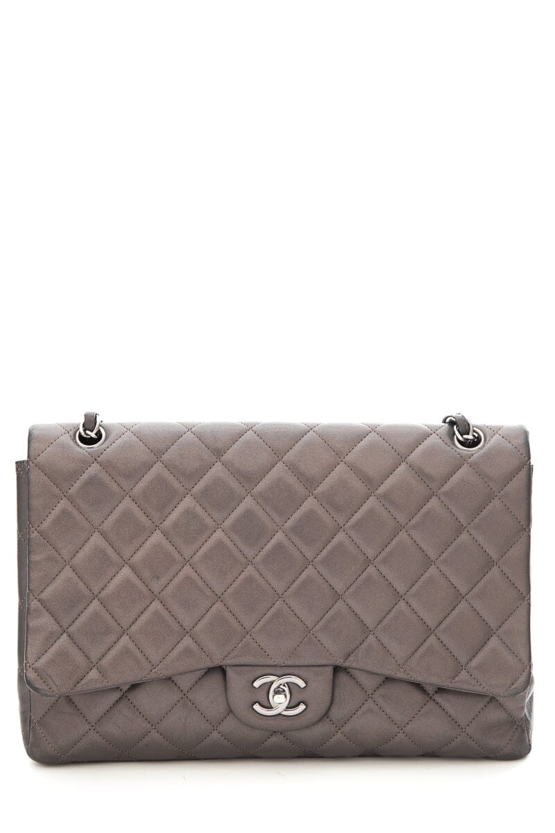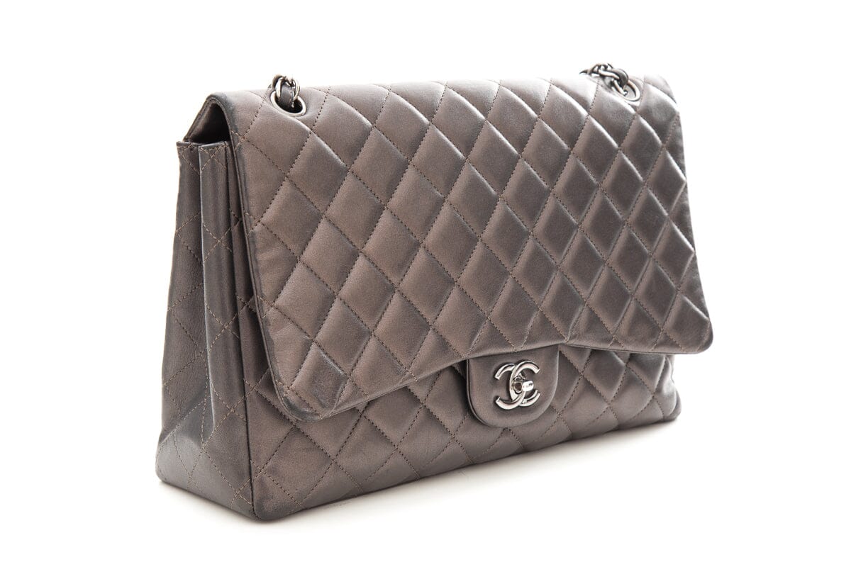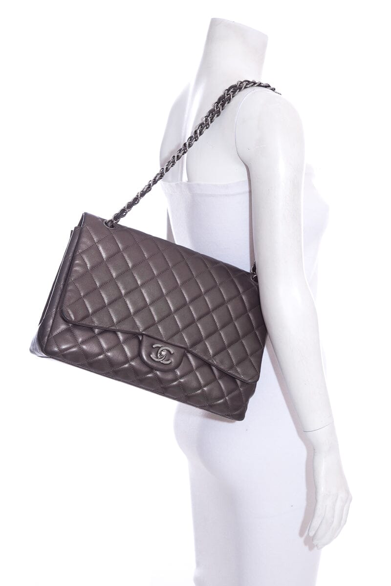 Chanel 2009-2010 Maxi Classic Flap Gunmetal Quilted Lambskin Handbag With Silver Hardware. This item is in New condition; some slight wear on corners and cosmetic scratching on exterior.