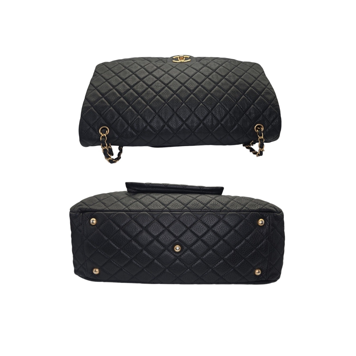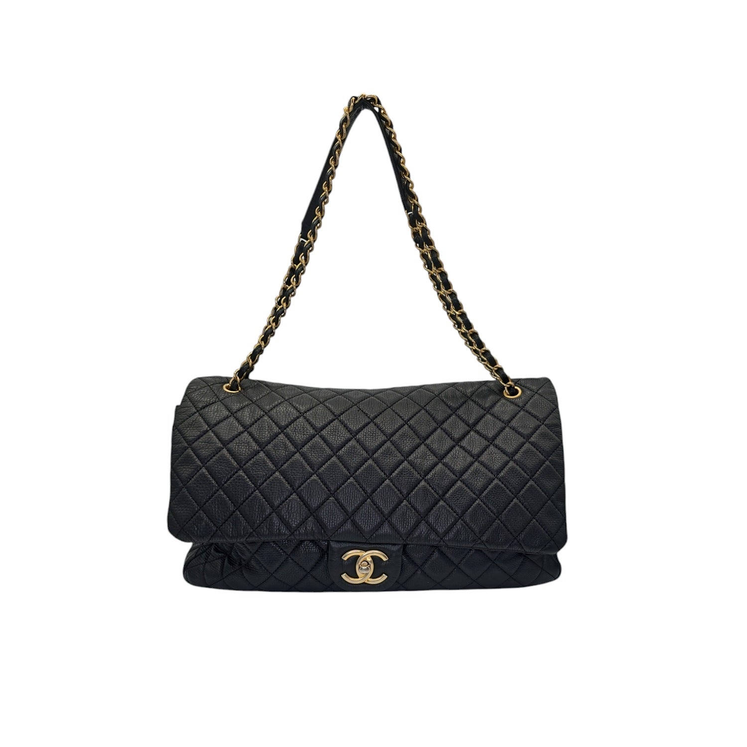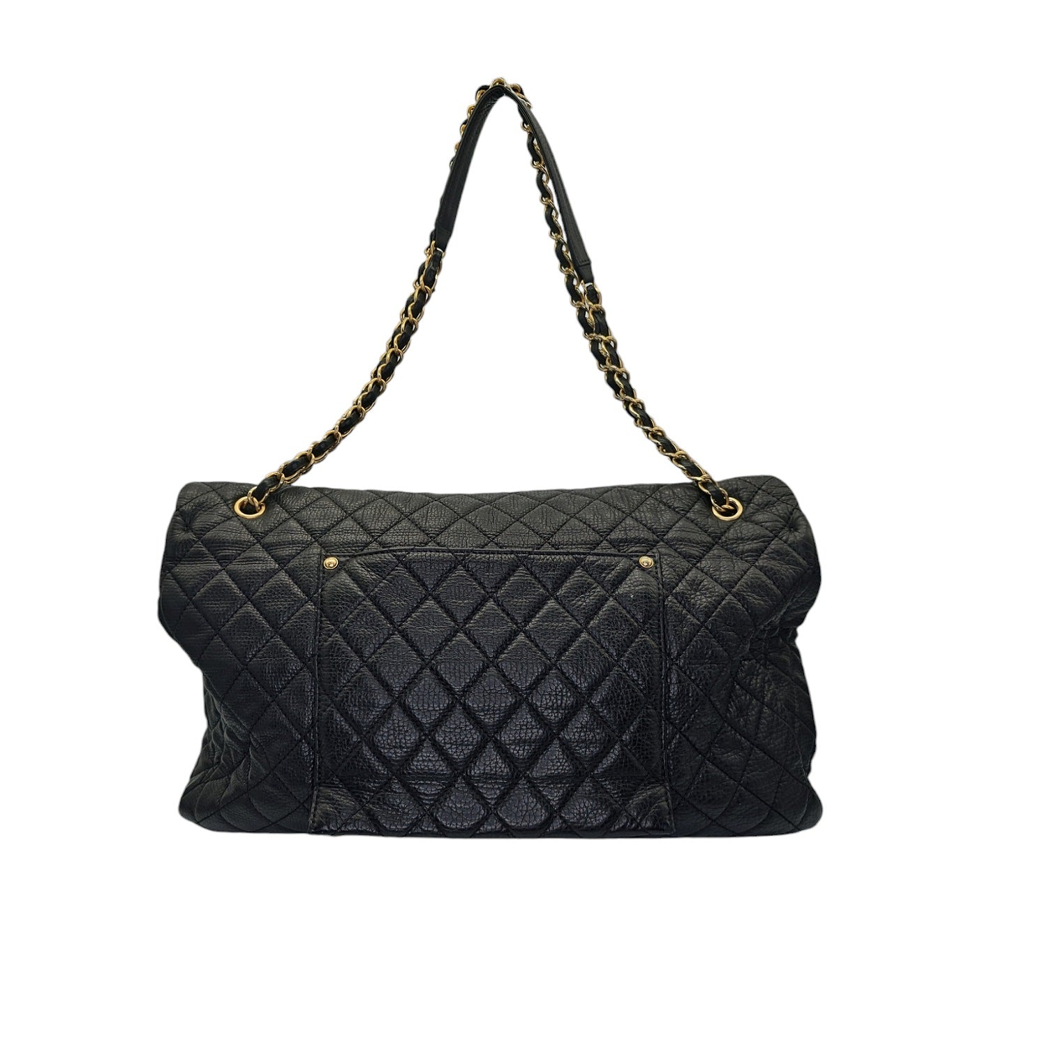 Unleash your inner chic with this Chanel 2018 Calfskin Quilted XXL Travel Flap Bag. The luxurious black calfskin leather is beautifully accentuated by the gold chain-link strap and gold-tone hardware. This spacious bag features multiple interior pockets for organization and a rear pocket for convenience. With its iconic CC turn-lock closure, this bag is both practical and sophisticated. Includes original accessories for a complete luxury experience.
