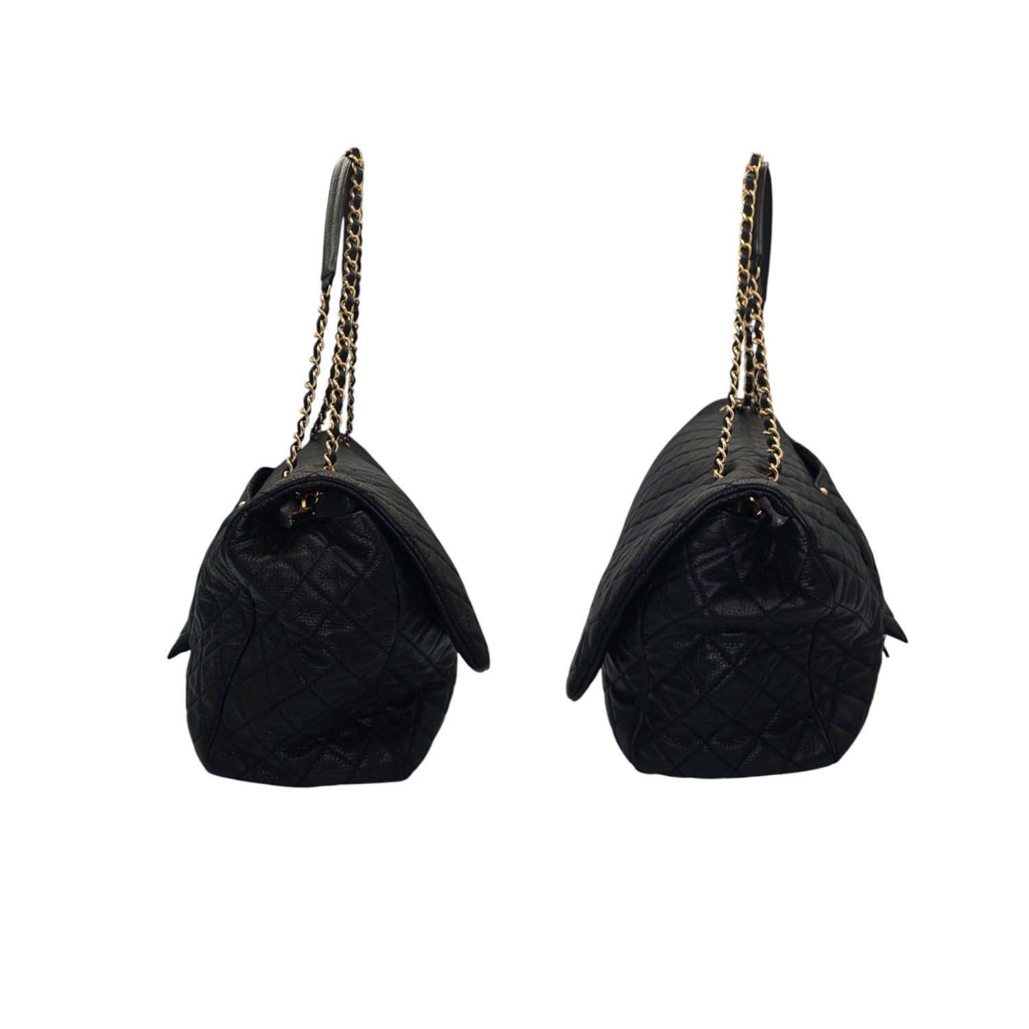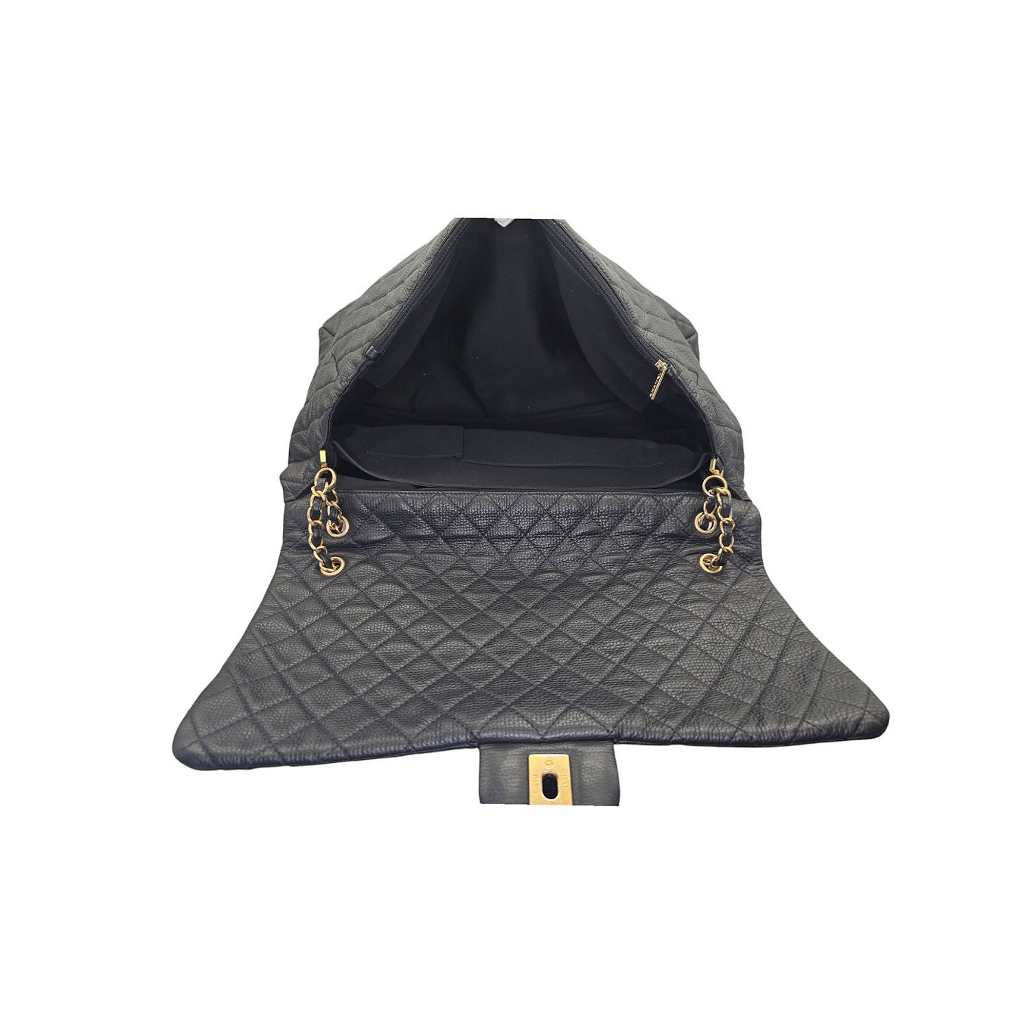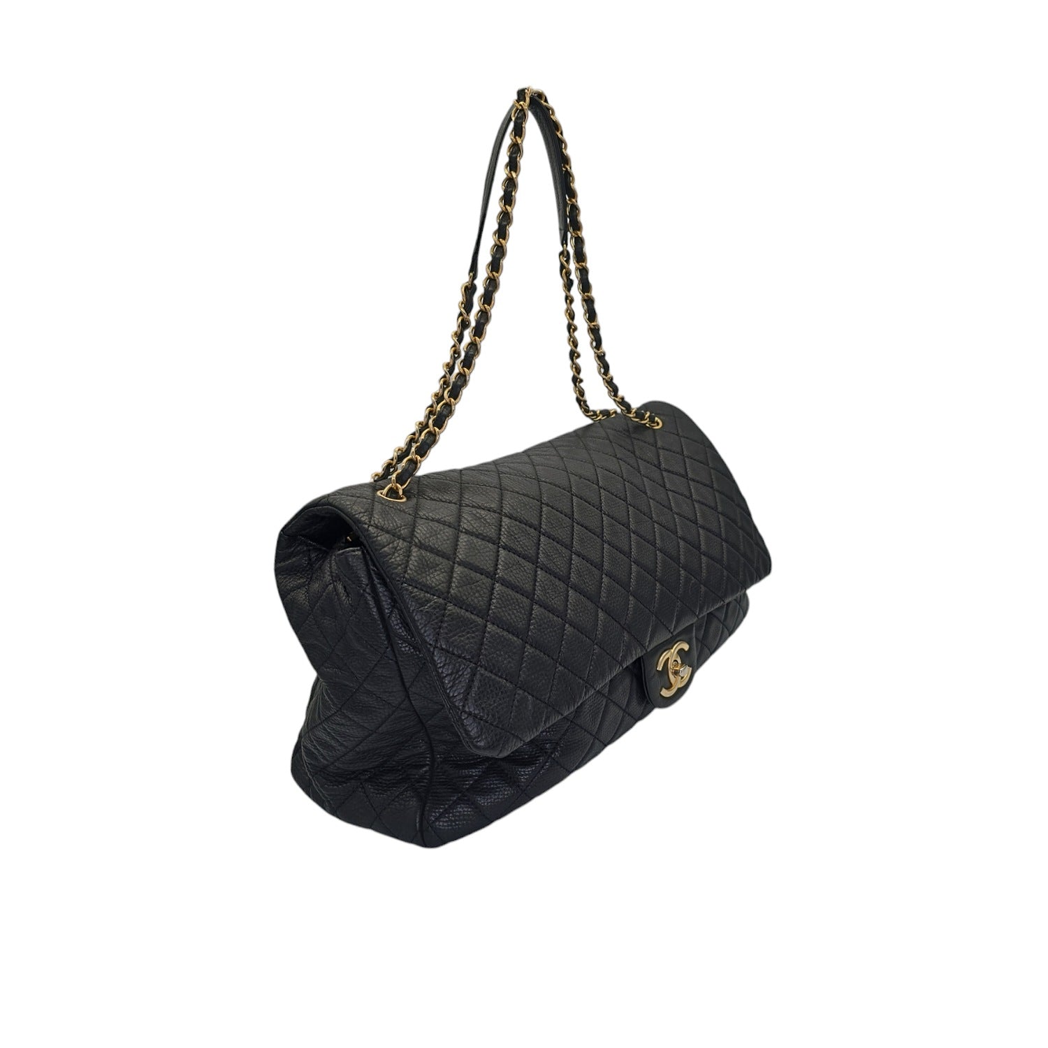Unleash your inner chic with this Chanel 2018 Calfskin Quilted XXL Travel Flap Bag. The luxurious black calfskin leather is beautifully accentuated by the gold chain-link strap and gold-tone hardware. This spacious bag features multiple interior pockets for organization and a rear pocket for convenience. With its iconic CC turn-lock closure, this bag is both practical and sophisticated. Includes original accessories for a complete luxury experience.