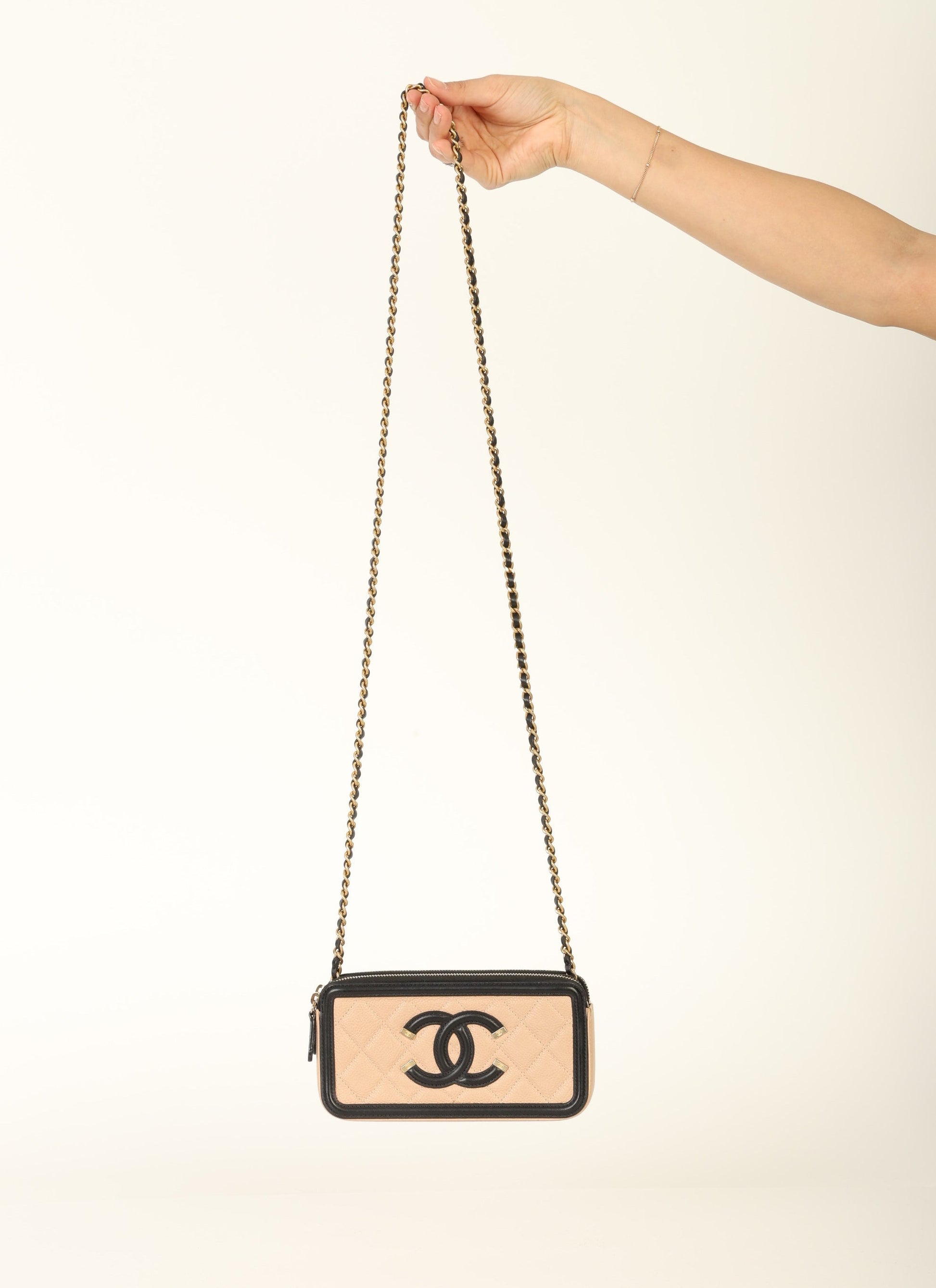 Dropping in the shop is a chic Chanel Caviar Filigree Wallet on Chain in with aged gold hardware.?The perfect bag for?a day-to-night transition!
