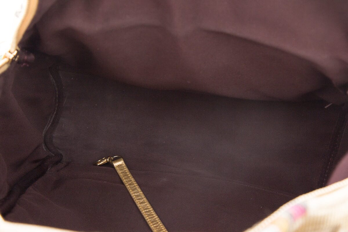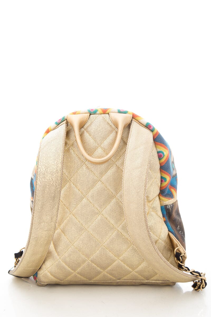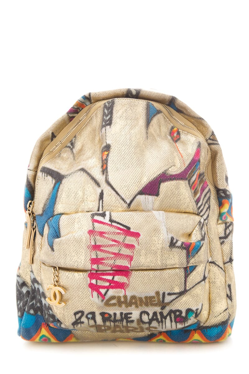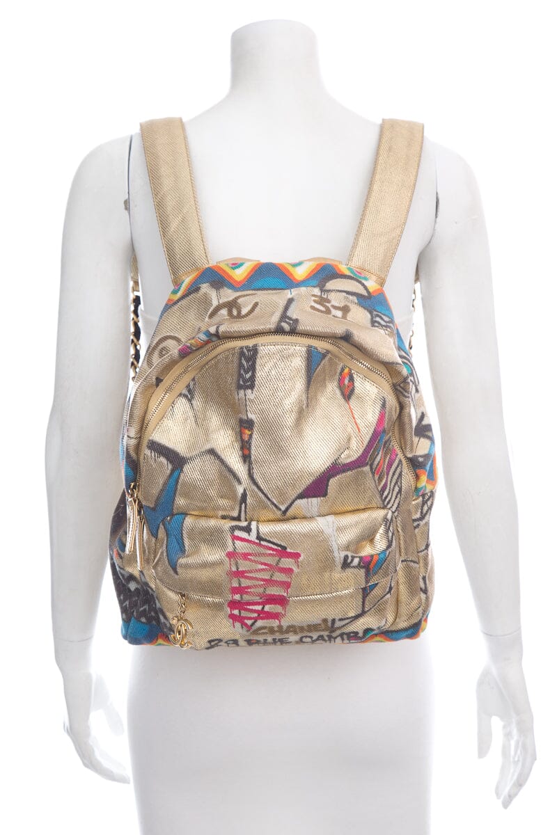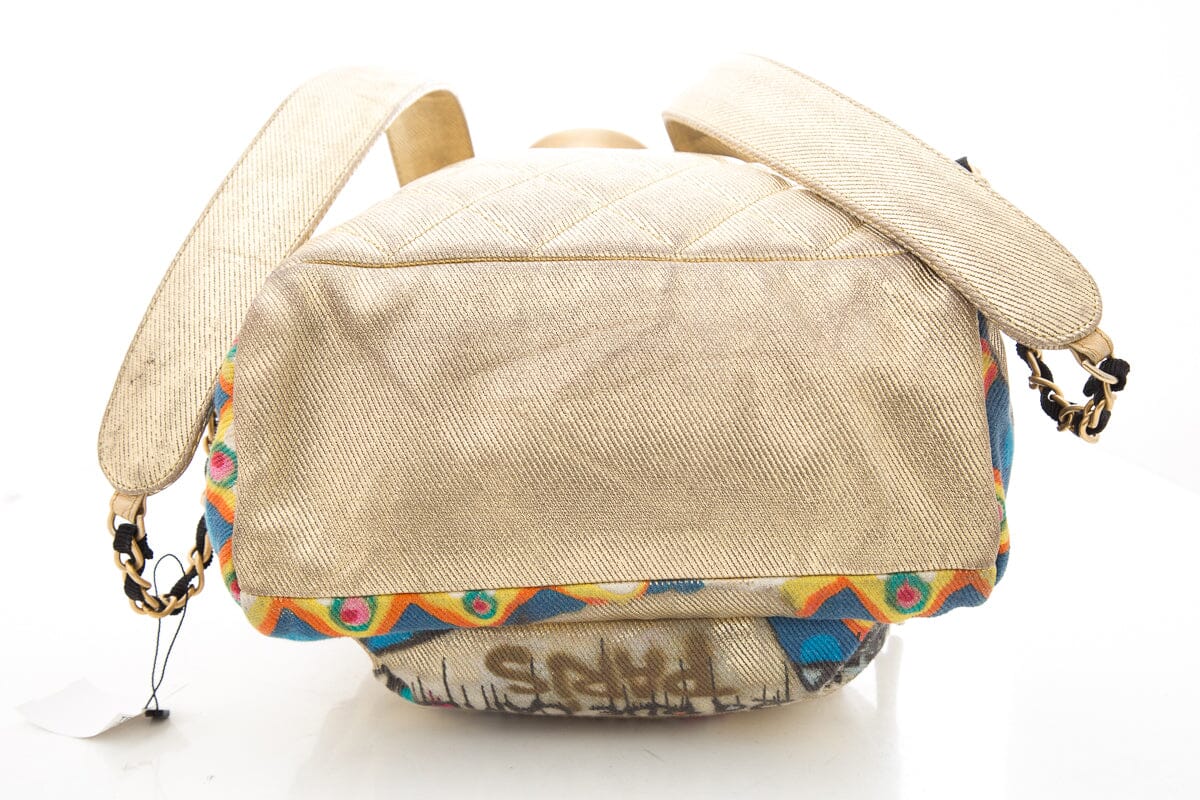 Chanel 2019 Gold Graffiti Paris-New York Street Spirit Backpack. This item is in New condition; some fading and discoloring on corners and along seams and some staining on lining.