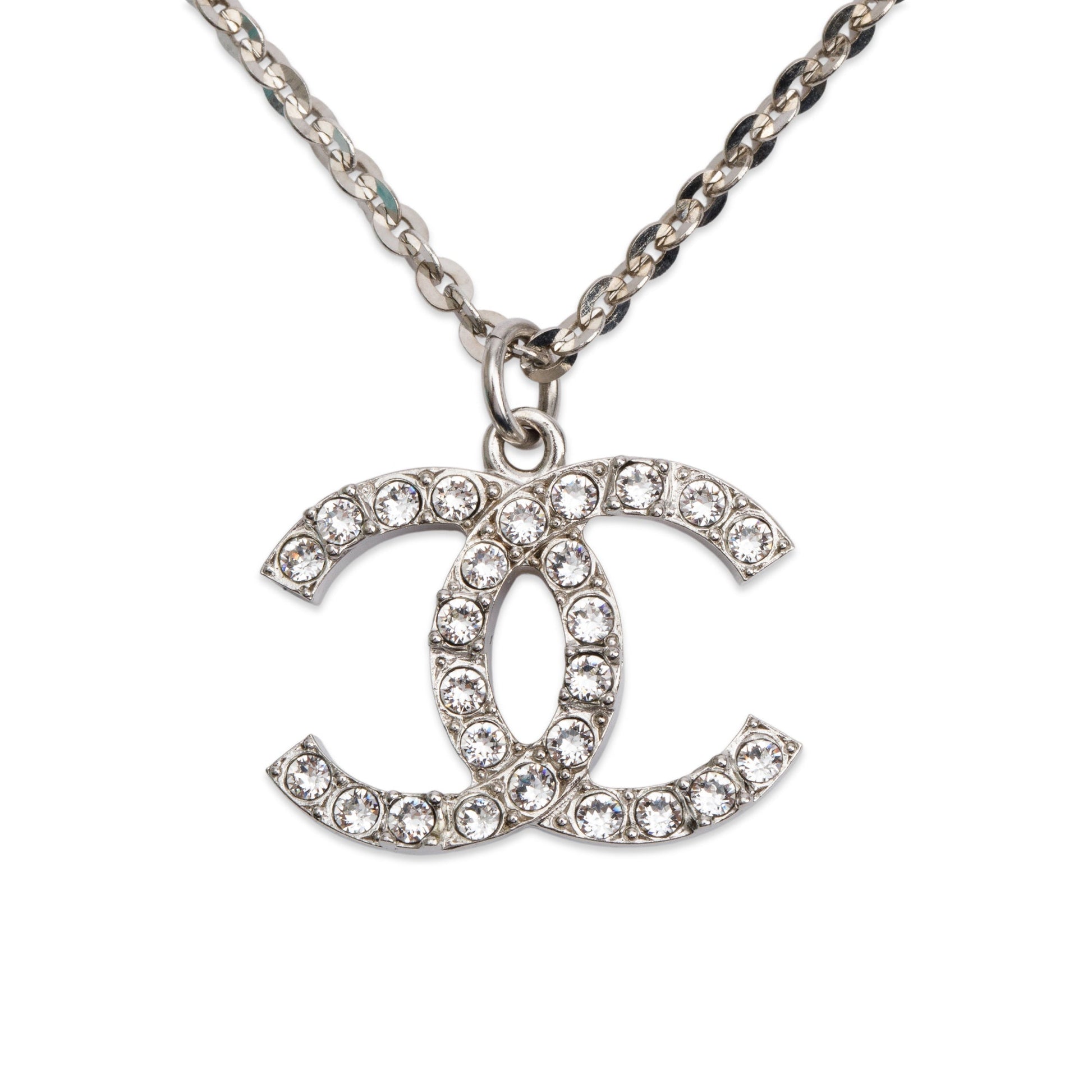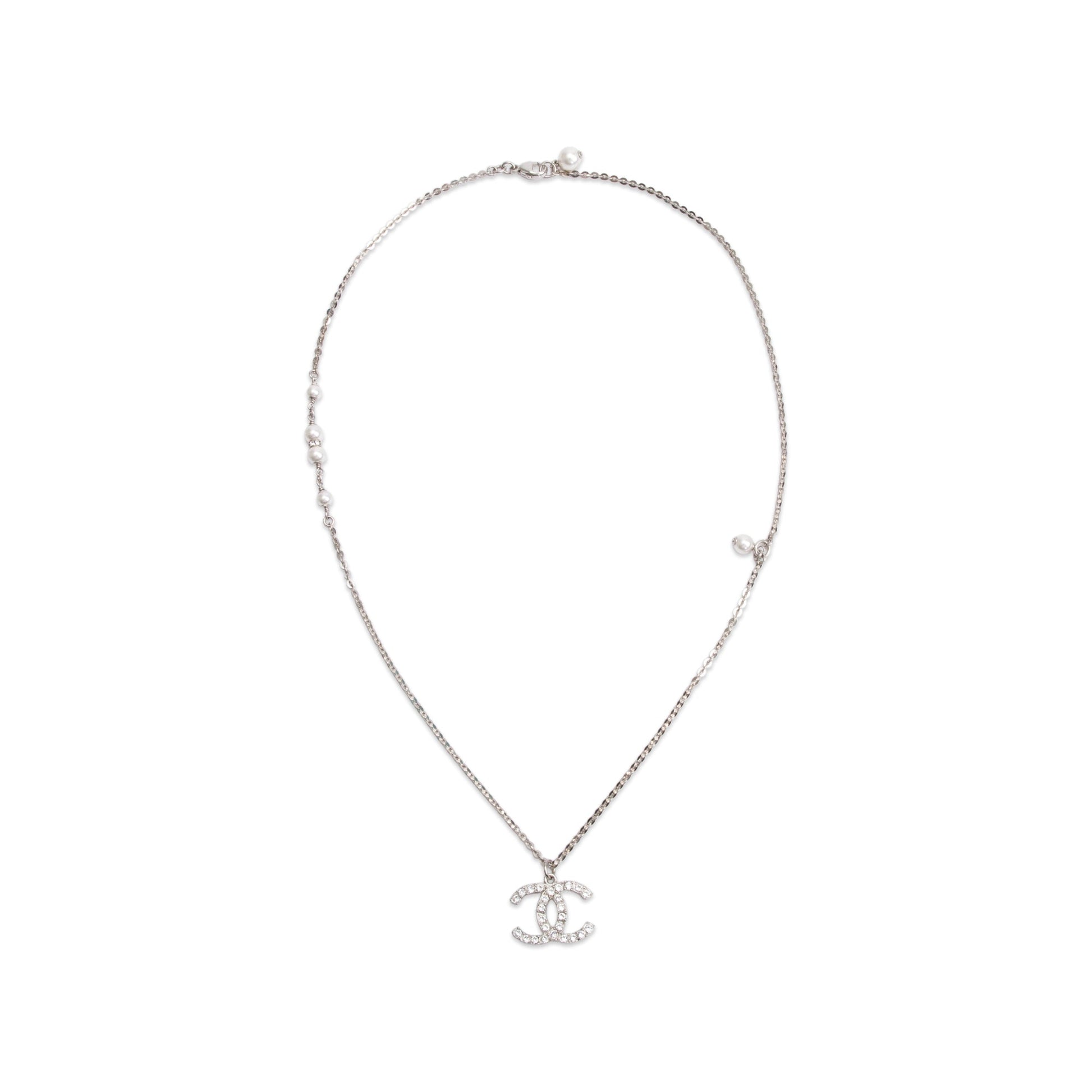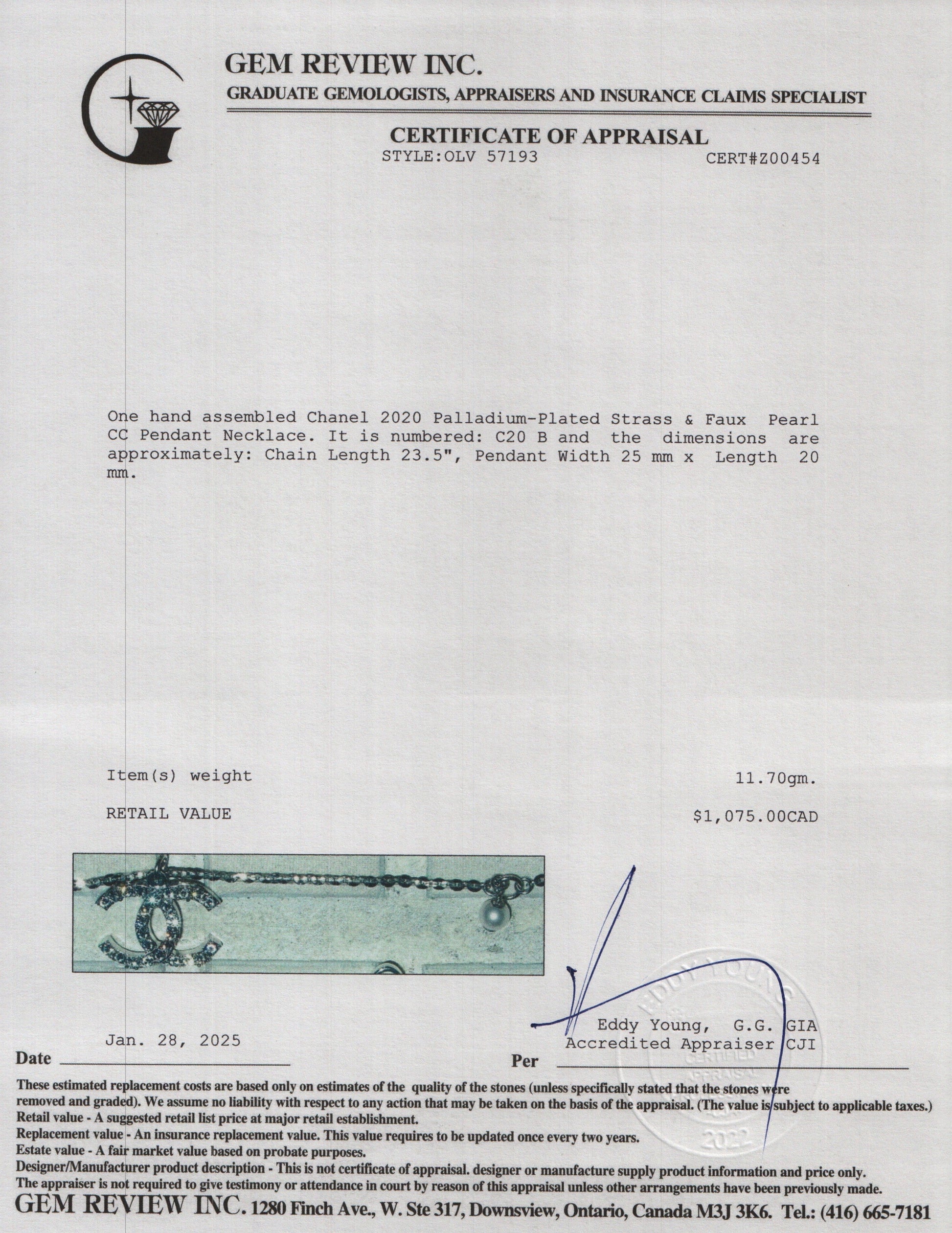 Chanel 2020 Palladium-Plated Strass & Faux Pearl CC Pendant Necklace w/ Box