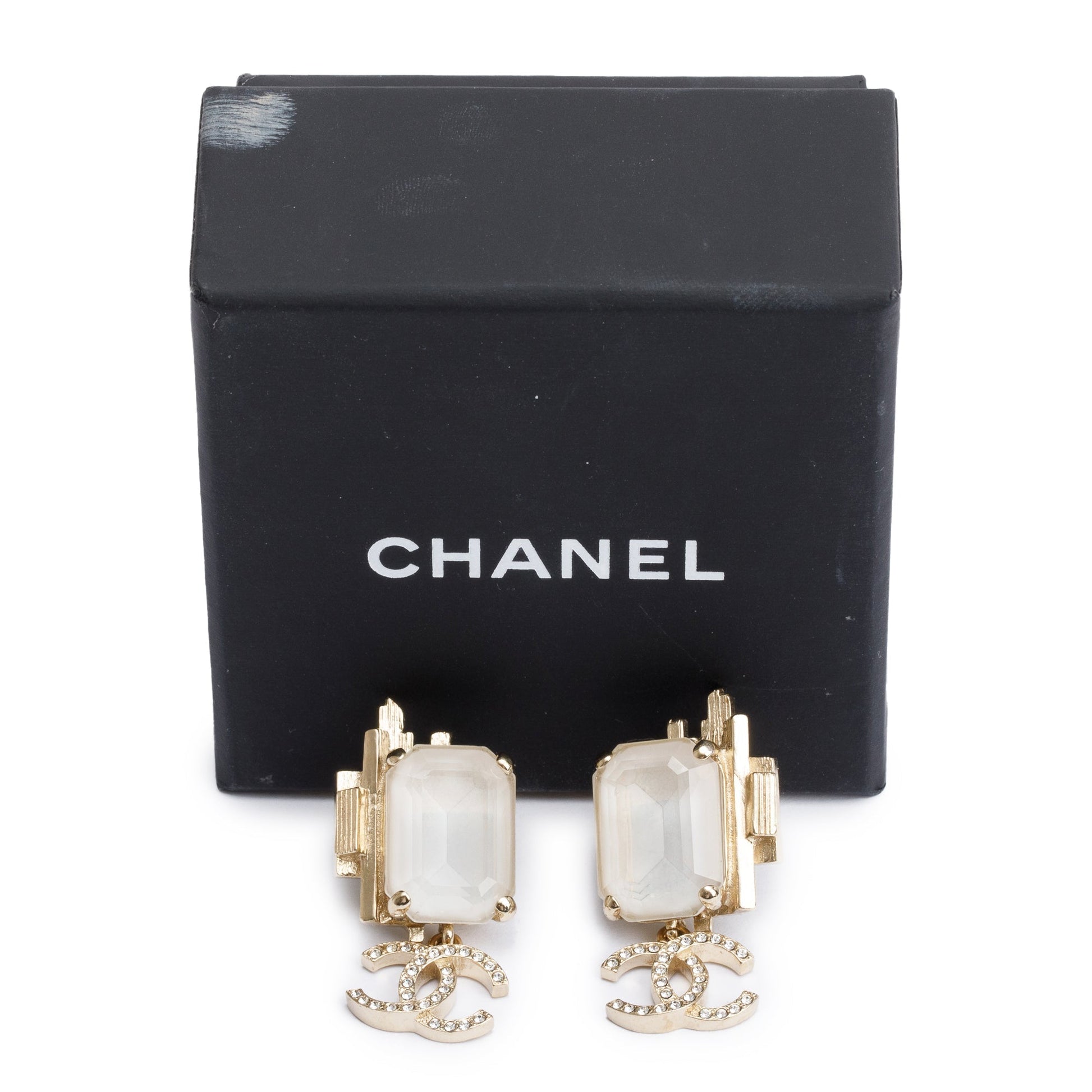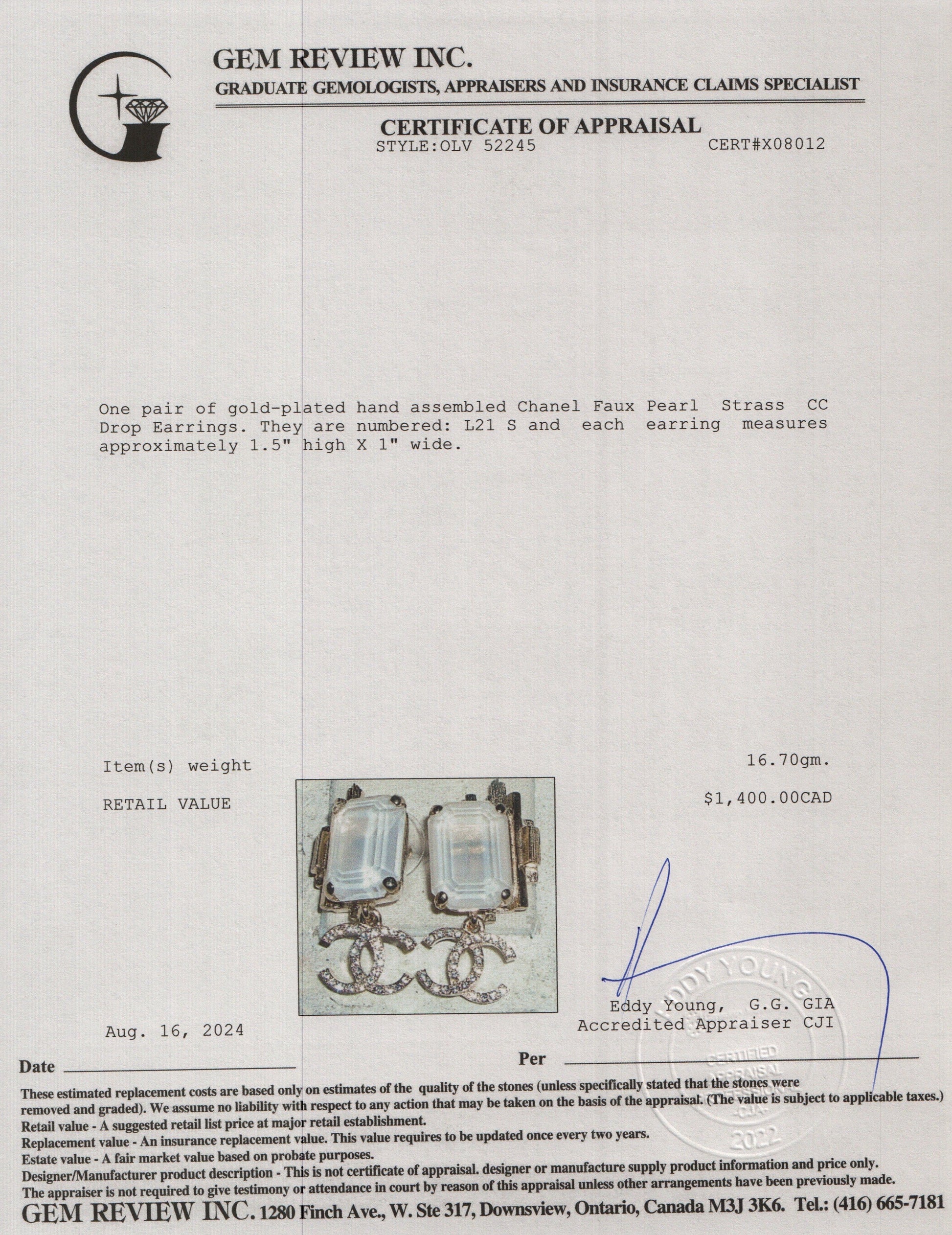 Chanel 2021 Gold Plated Faux Pearl Strass CC Drop Earrings w/ Box