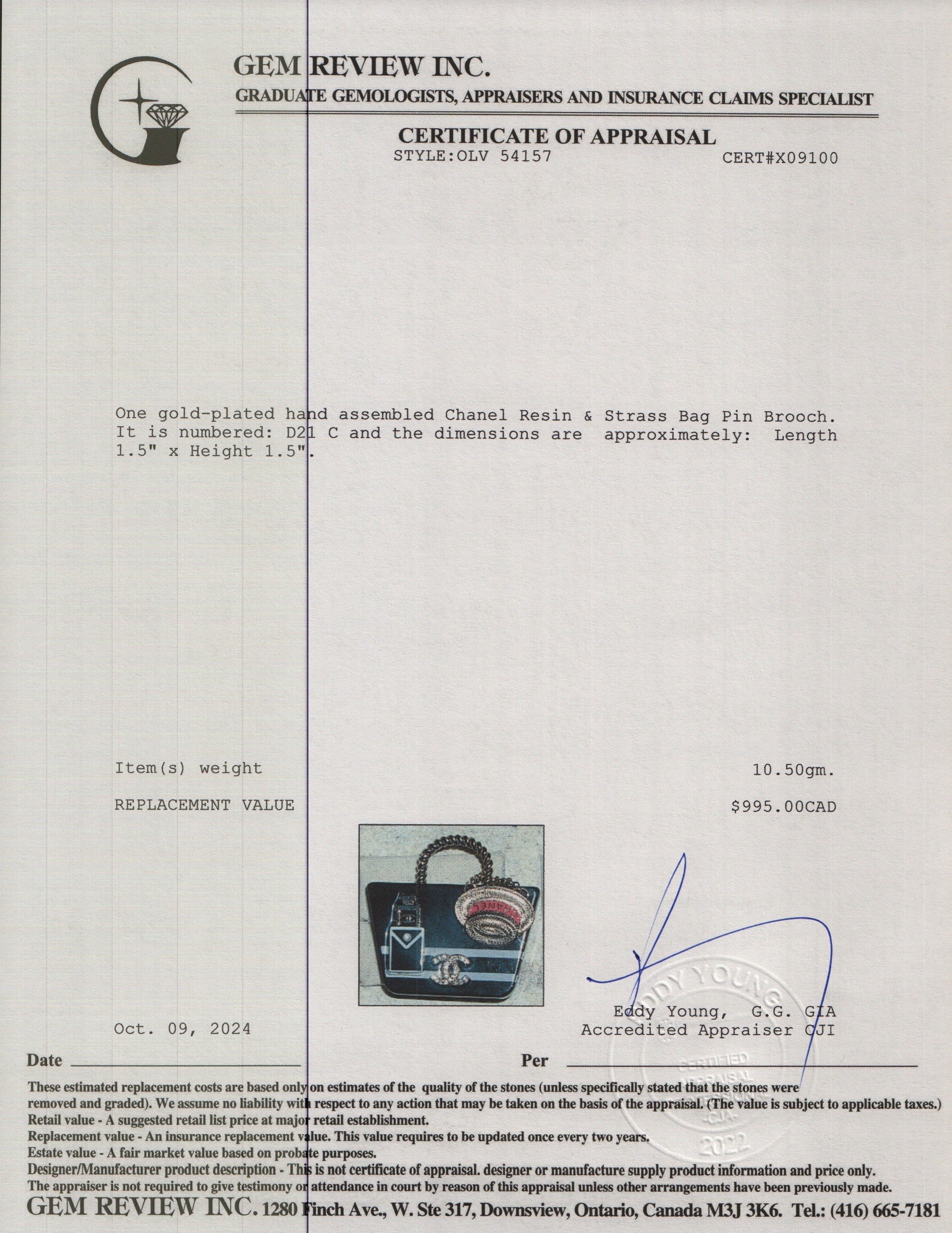 Chanel 2021 Gold Plated Resin & Strass Bag Pin Brooch