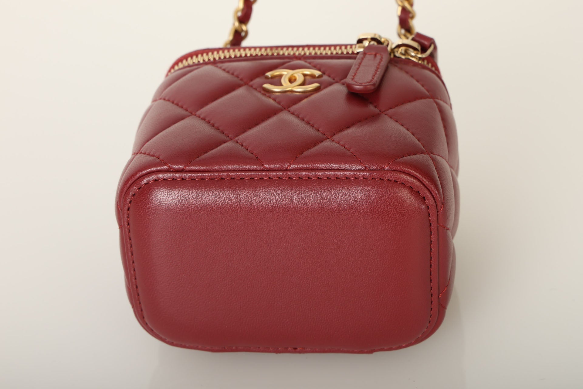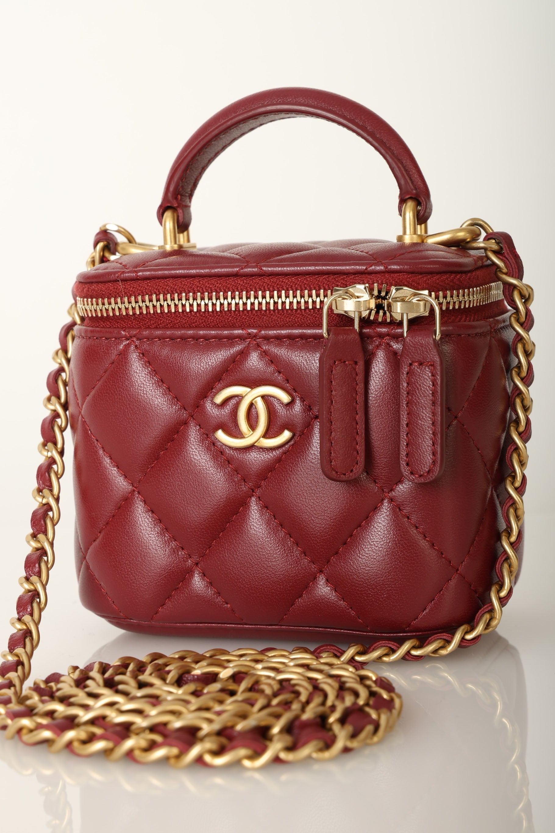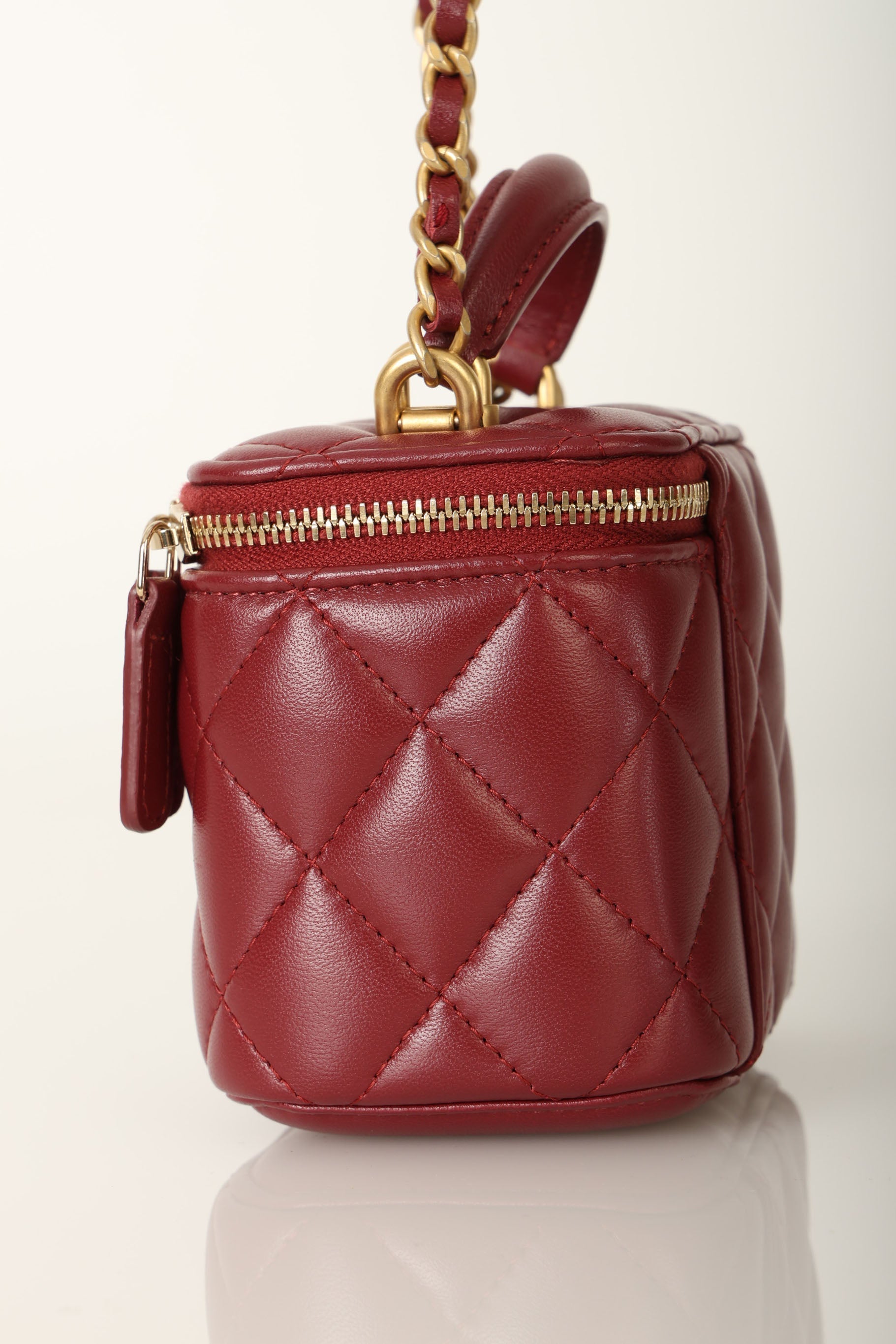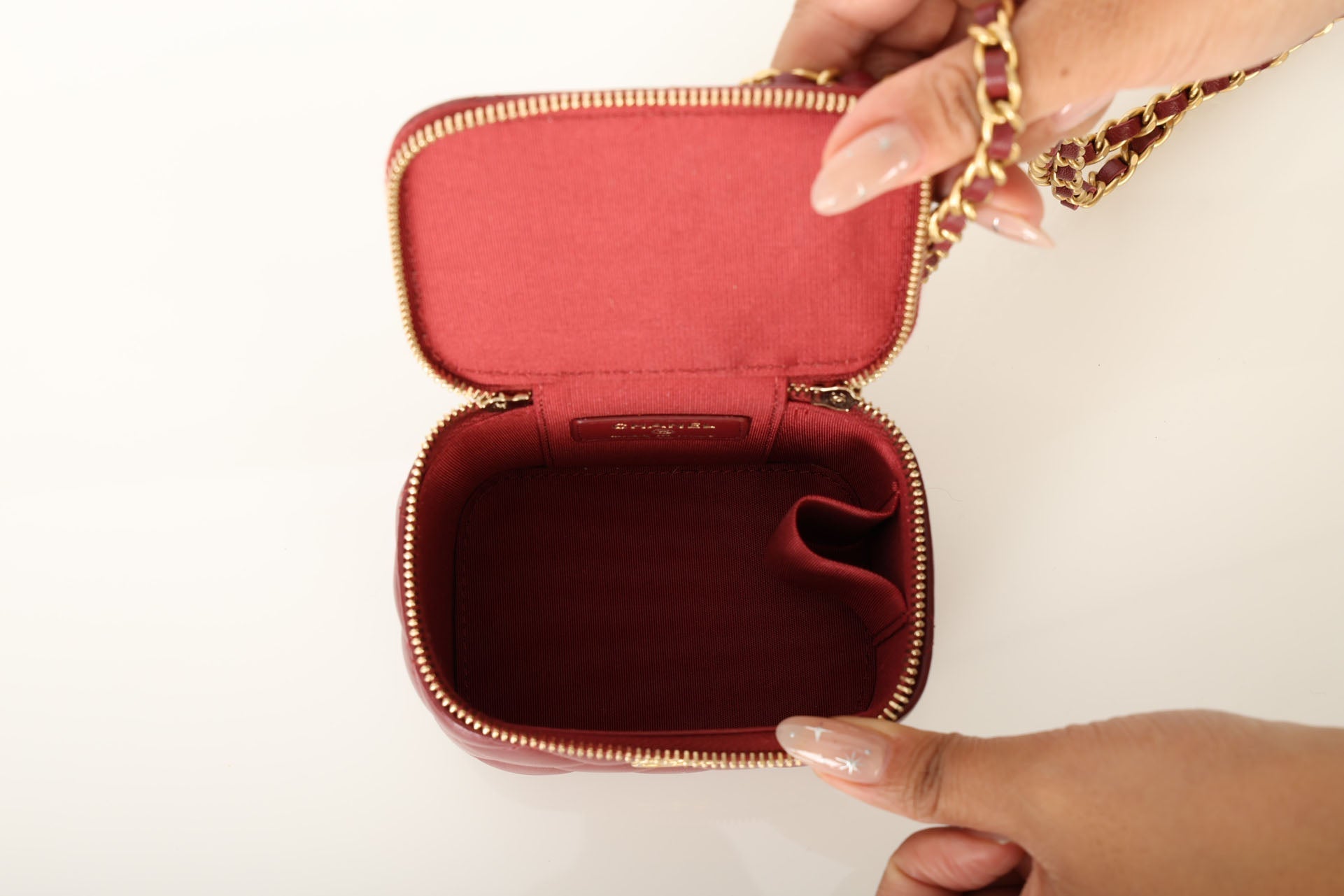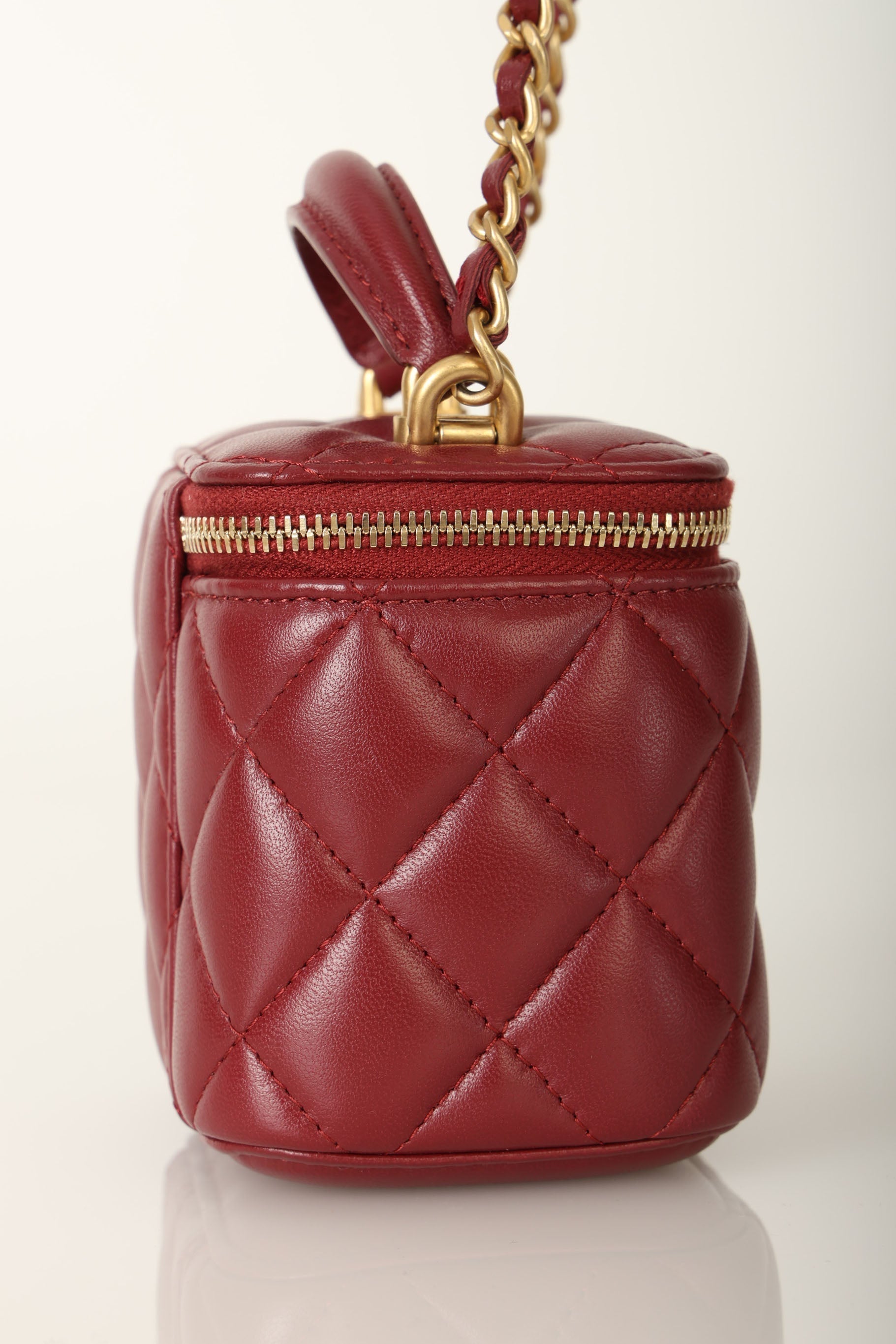Presenting the cutest Chanel Lambskin mini vanity! It's the classic lambskin Chanel look, but in the gorgeous oxblood/bordeaux color. So on trend, and can definitely be used for any season!