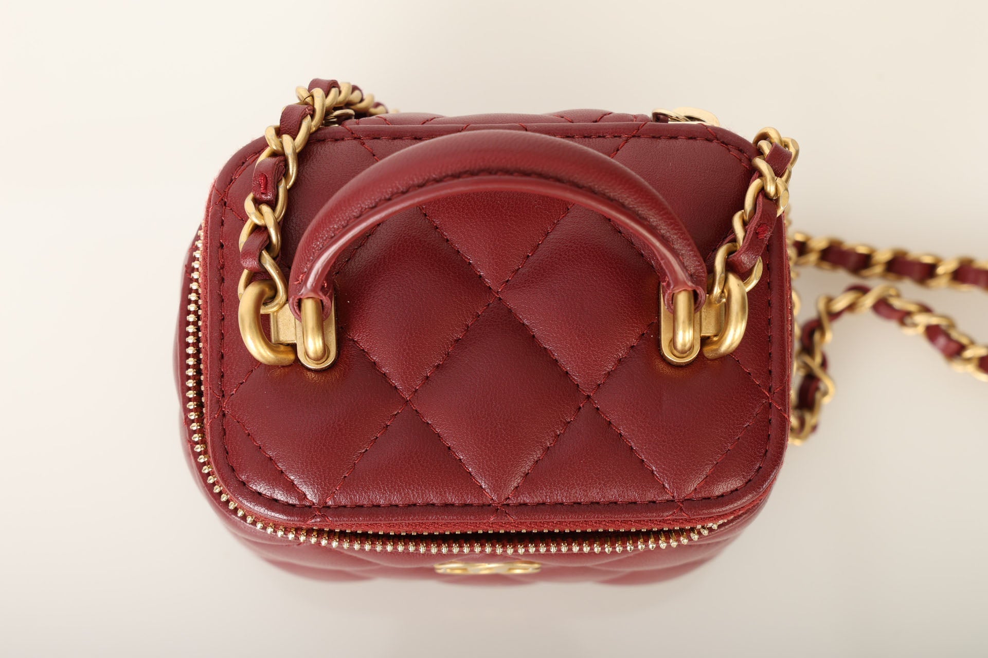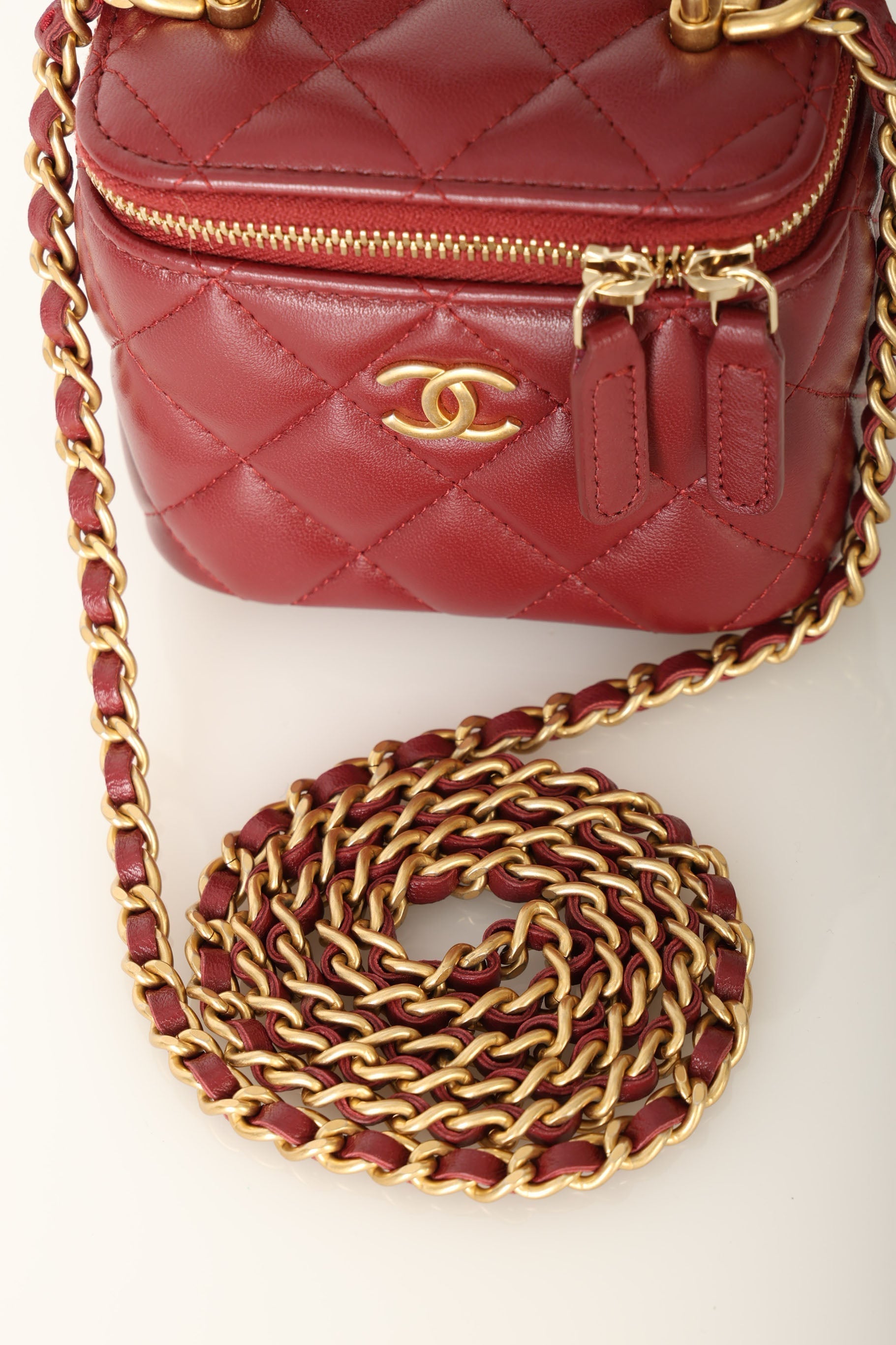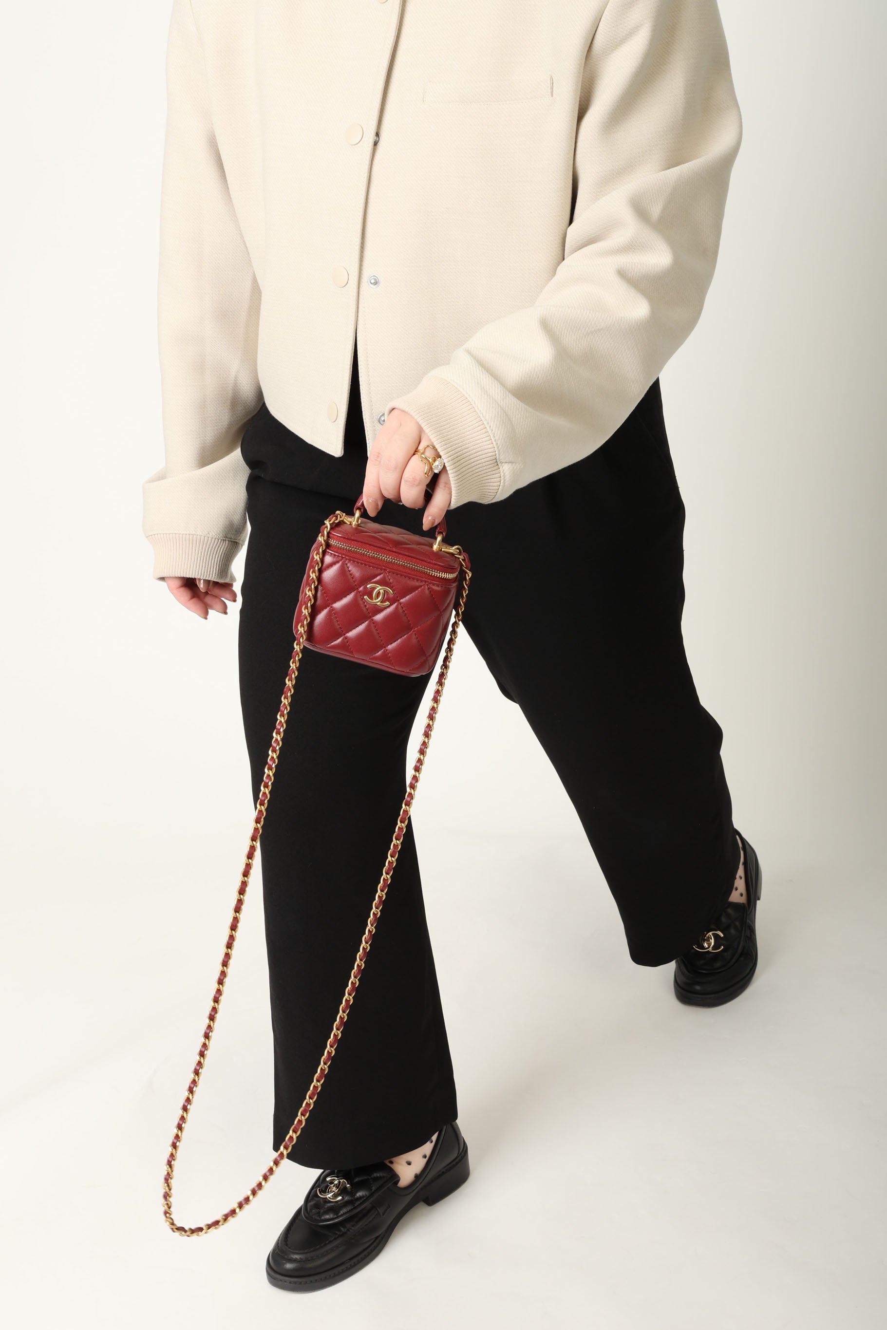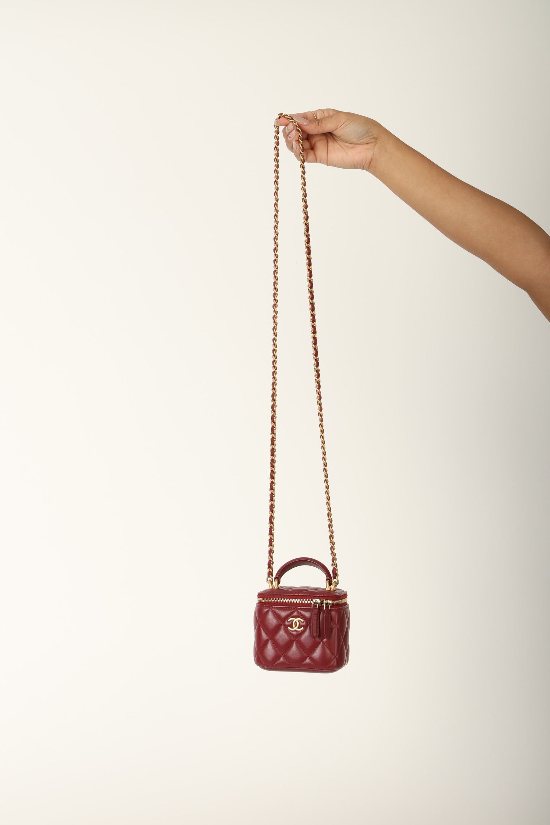 Presenting the cutest Chanel Lambskin mini vanity! It's the classic lambskin Chanel look, but in the gorgeous oxblood/bordeaux color. So on trend, and can definitely be used for any season!