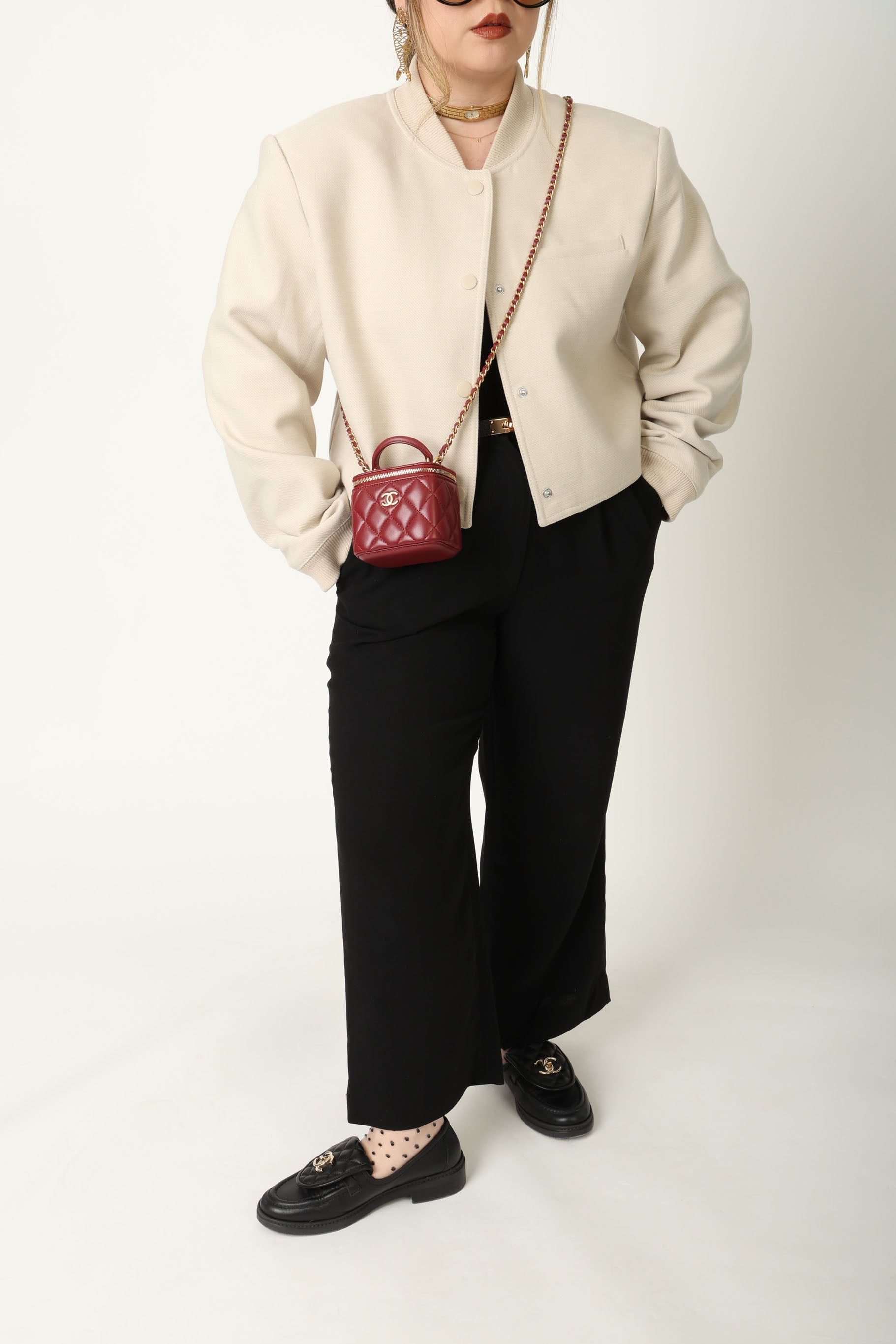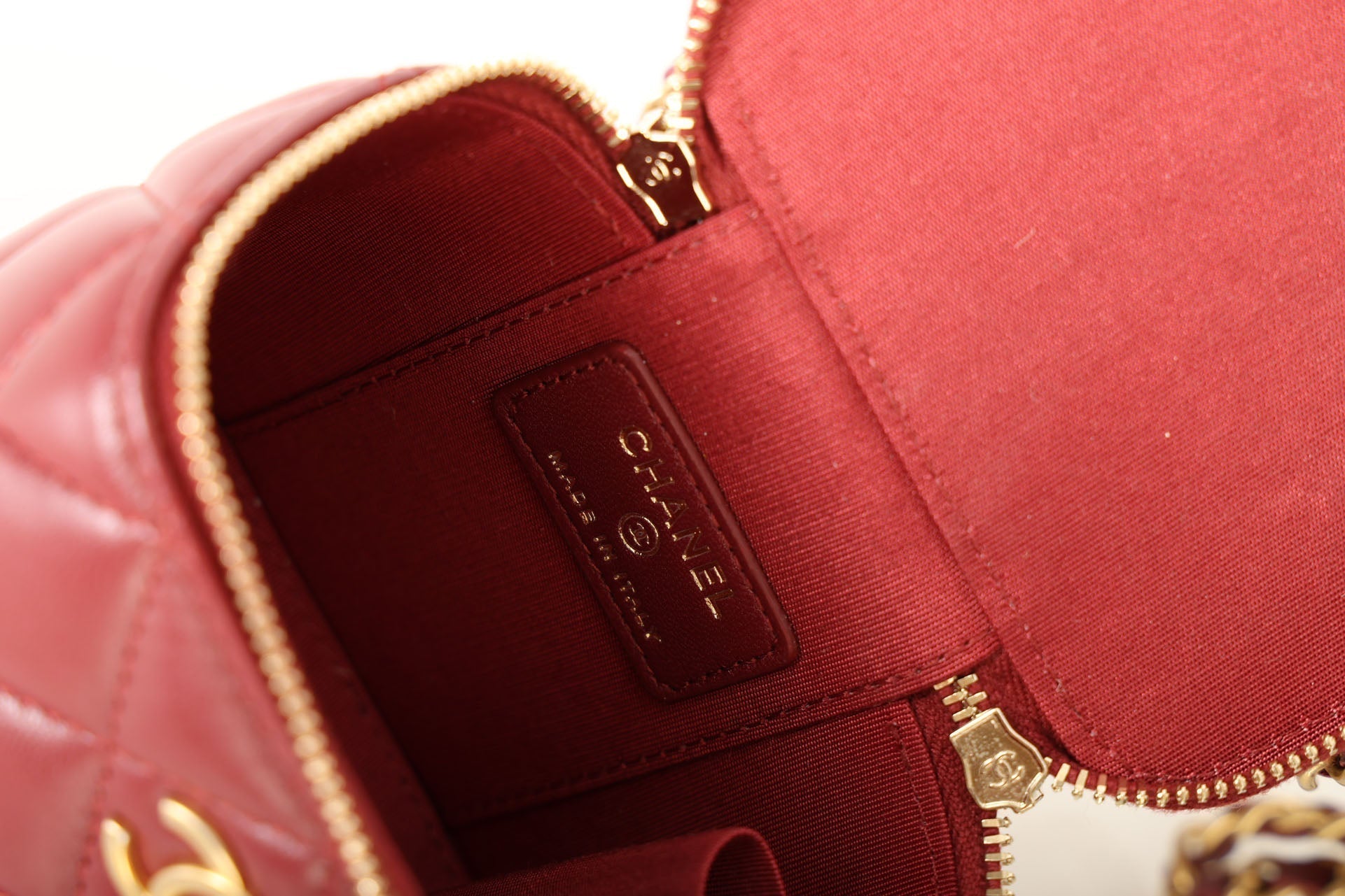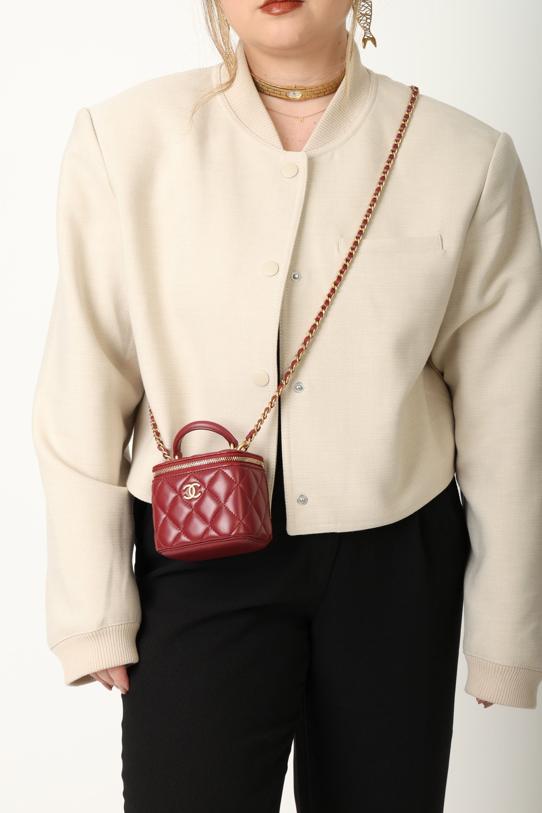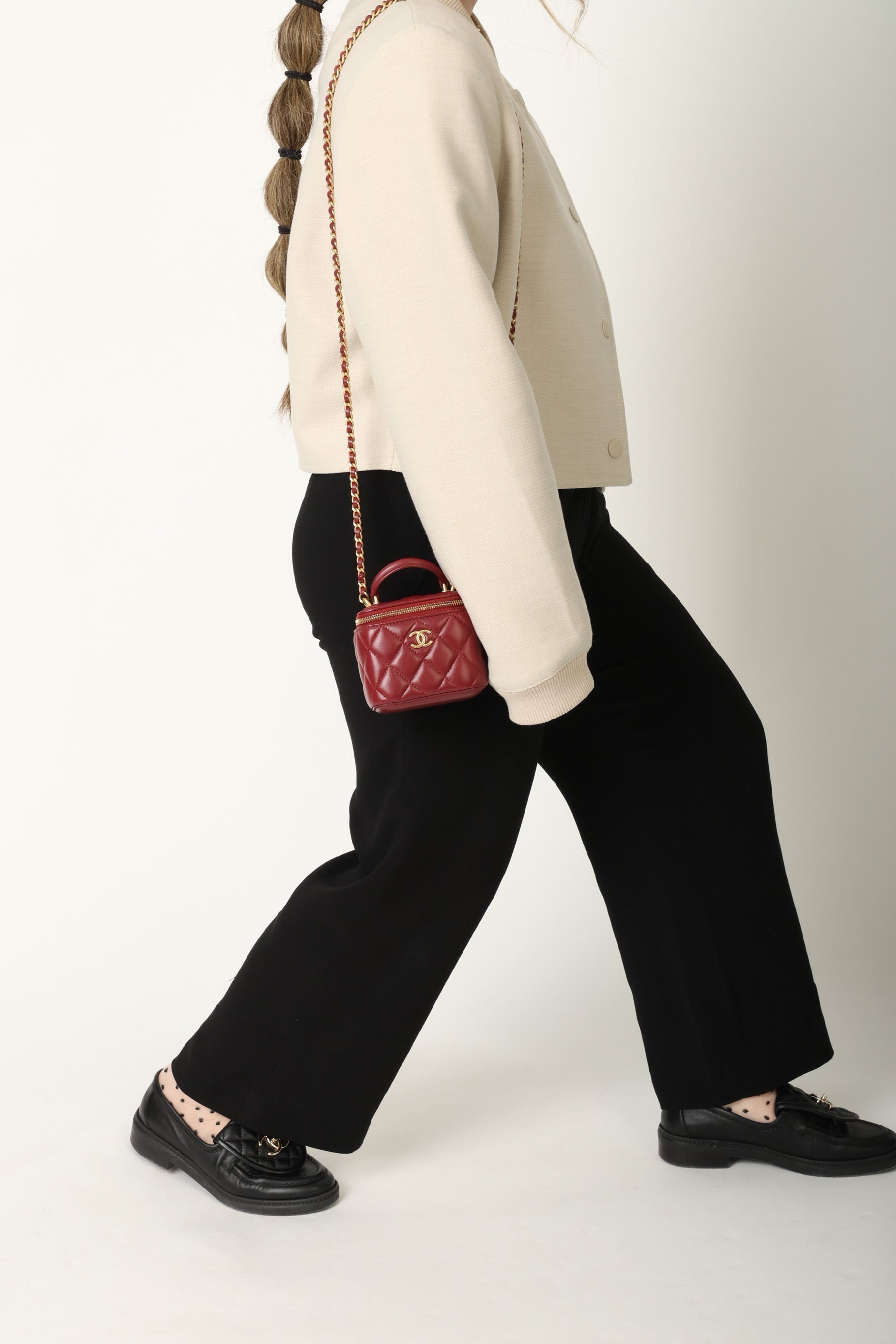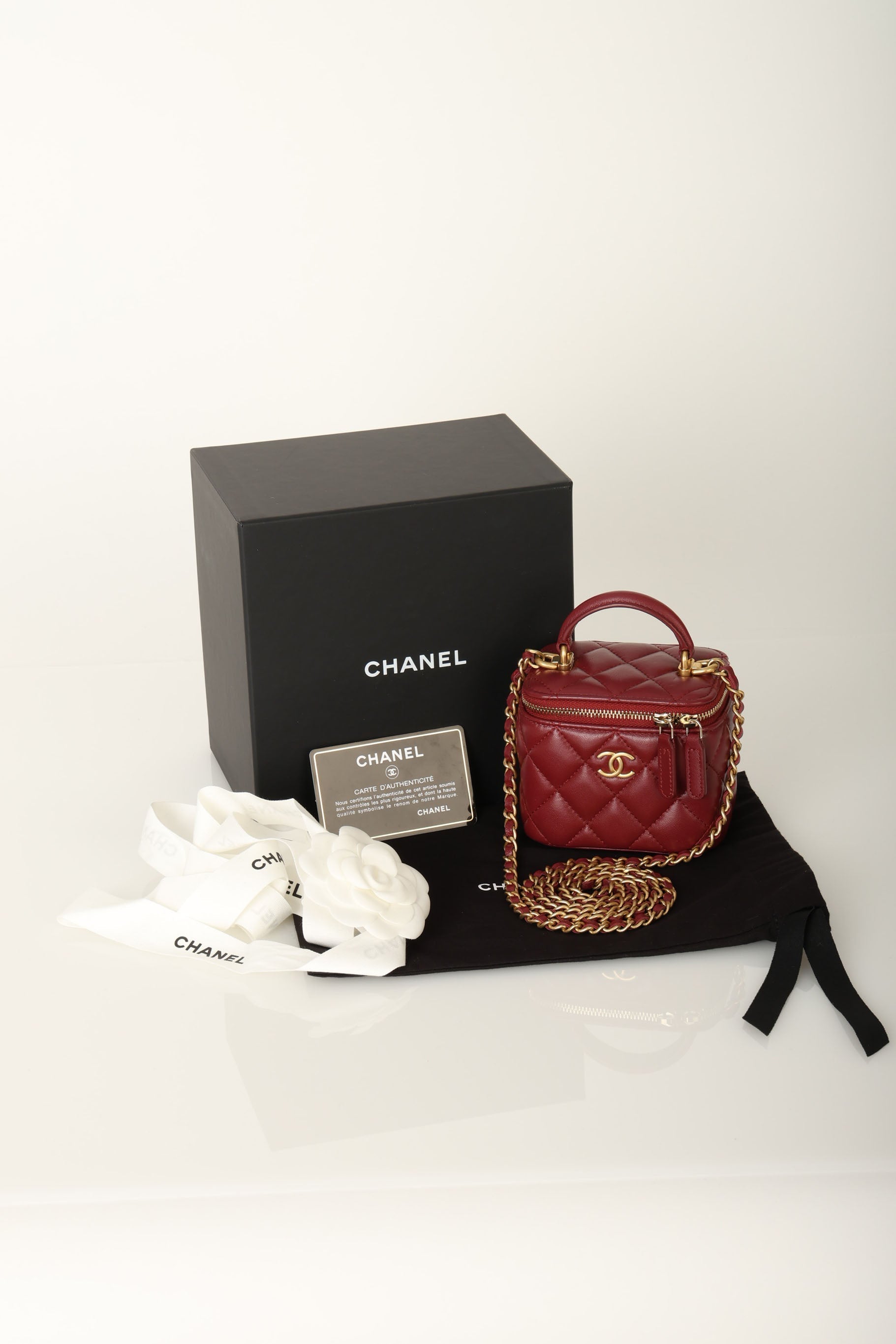 Presenting the cutest Chanel Lambskin mini vanity! It's the classic lambskin Chanel look, but in the gorgeous oxblood/bordeaux color. So on trend, and can definitely be used for any season!