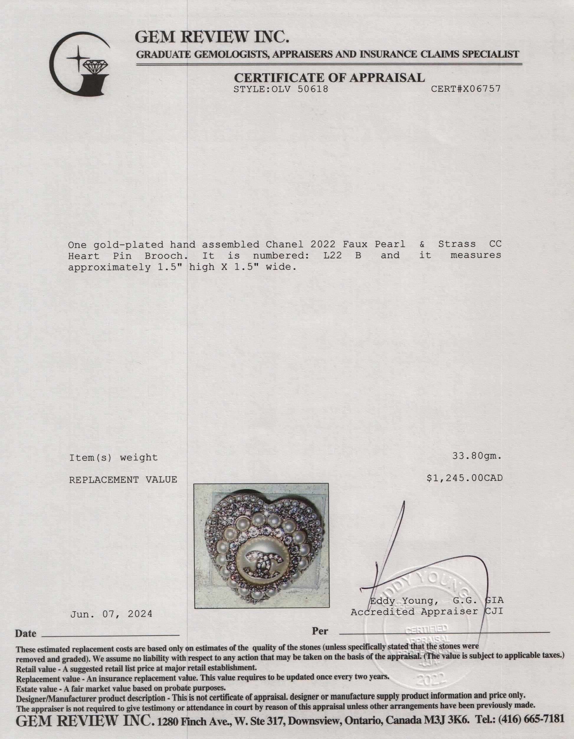 Chanel 2022 Gold Plated Faux Pearl & Strass CC Heart Pin Brooch