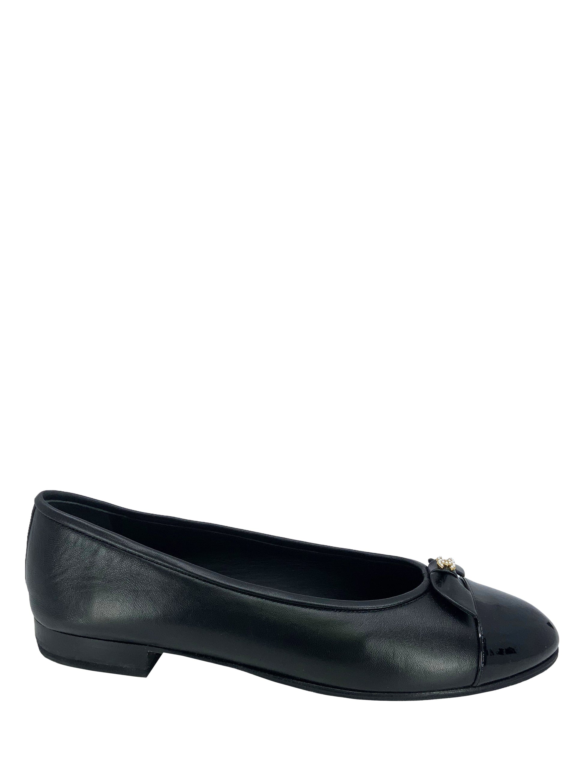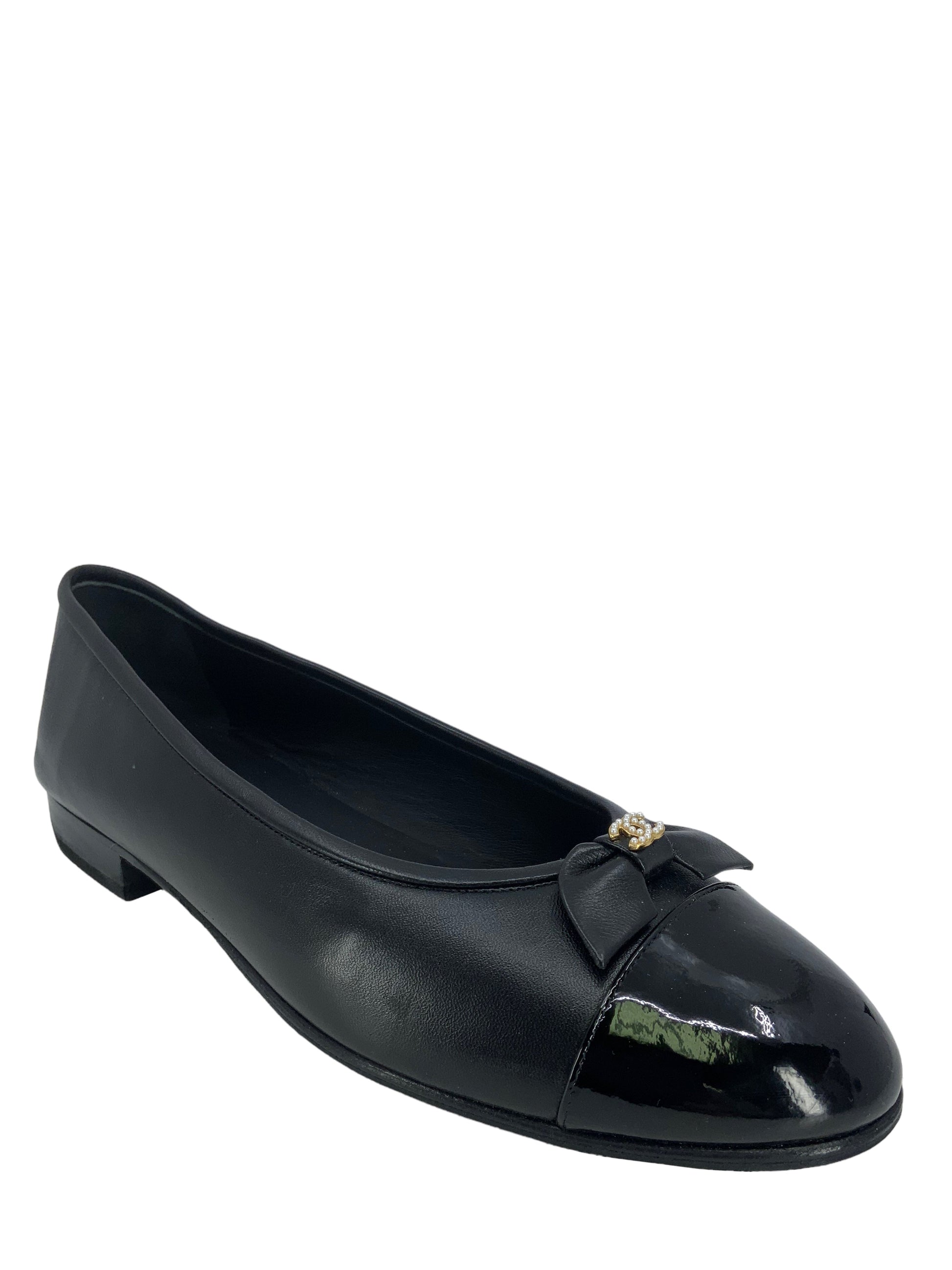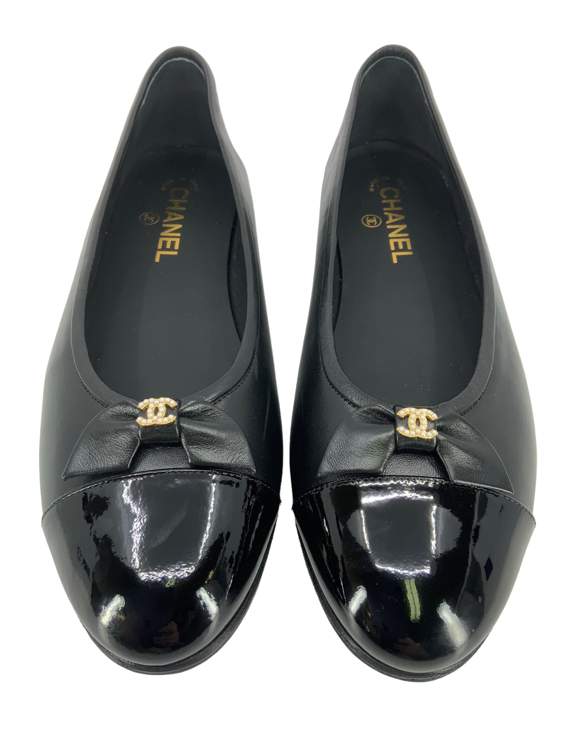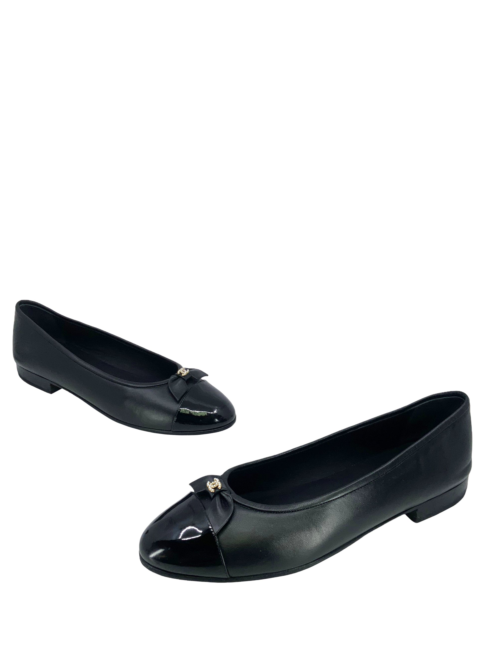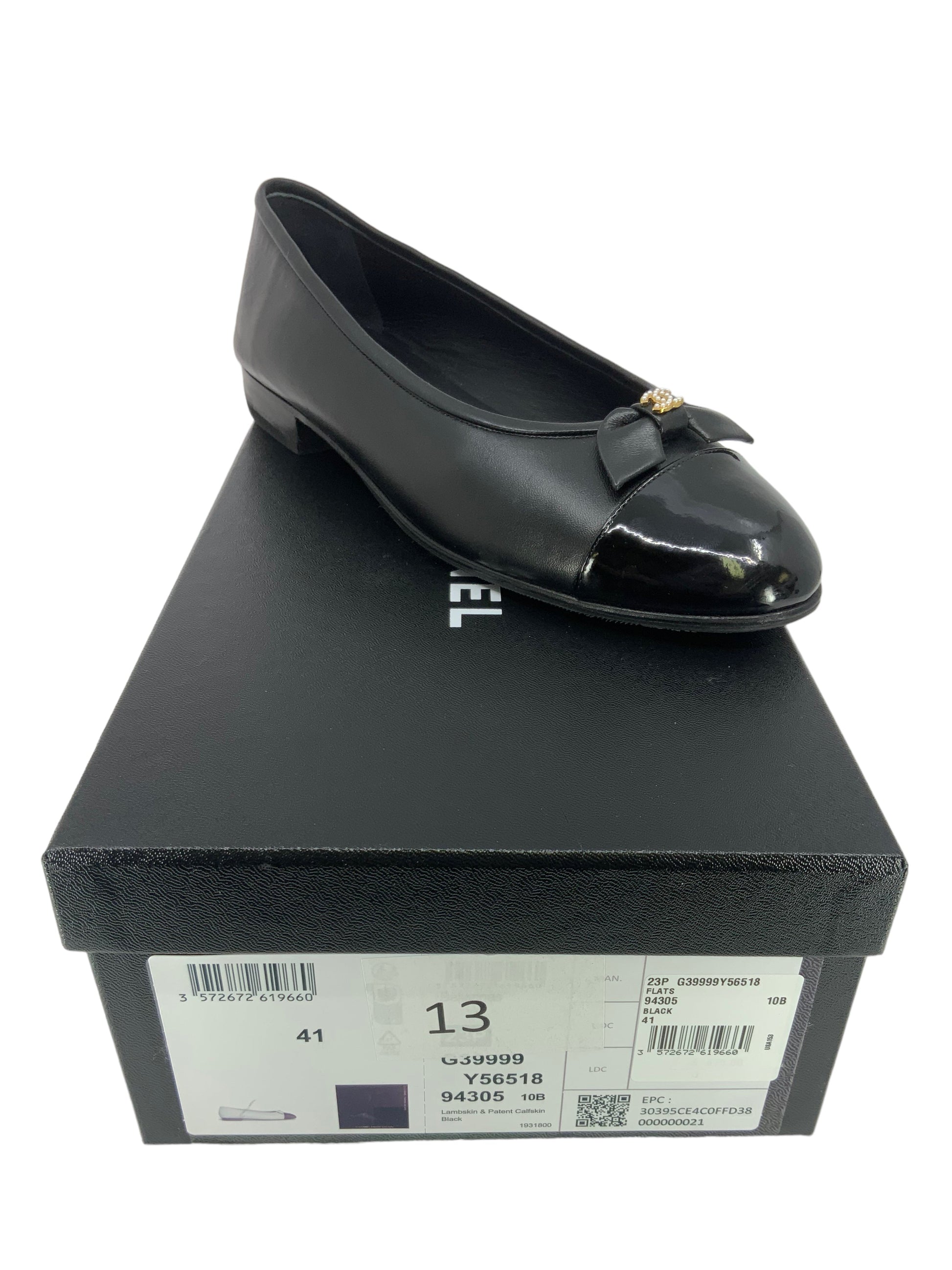 Step out in style with these classic?CHANEL 23P CC Cap Toe Lambskin Leather Ballet Flats Size 11 (IT 41) crafted from?supple?black lambskin.?Featuring a black patent leather cap-toe?with a signature CC logo bow tie accent?on the vamp.