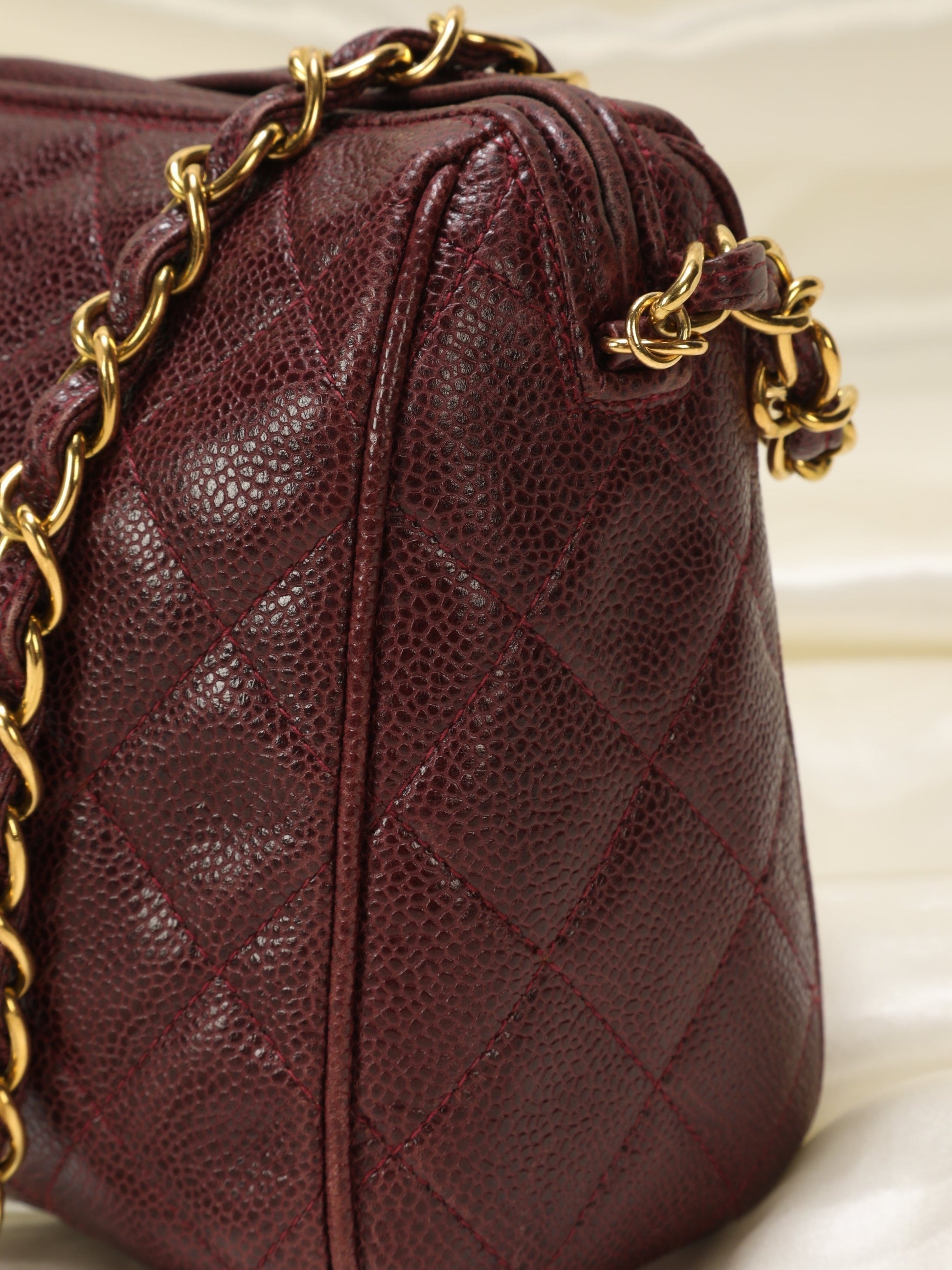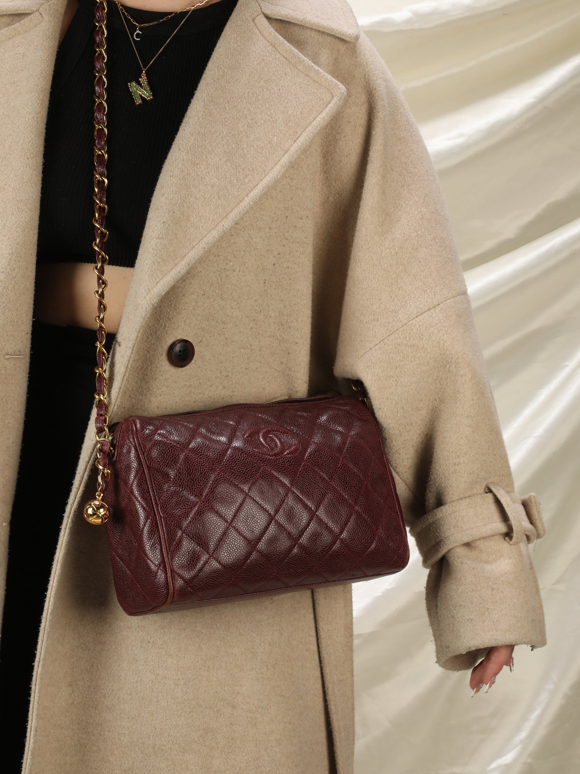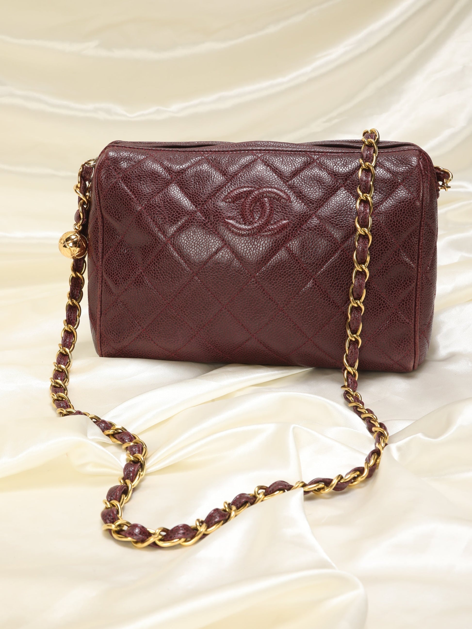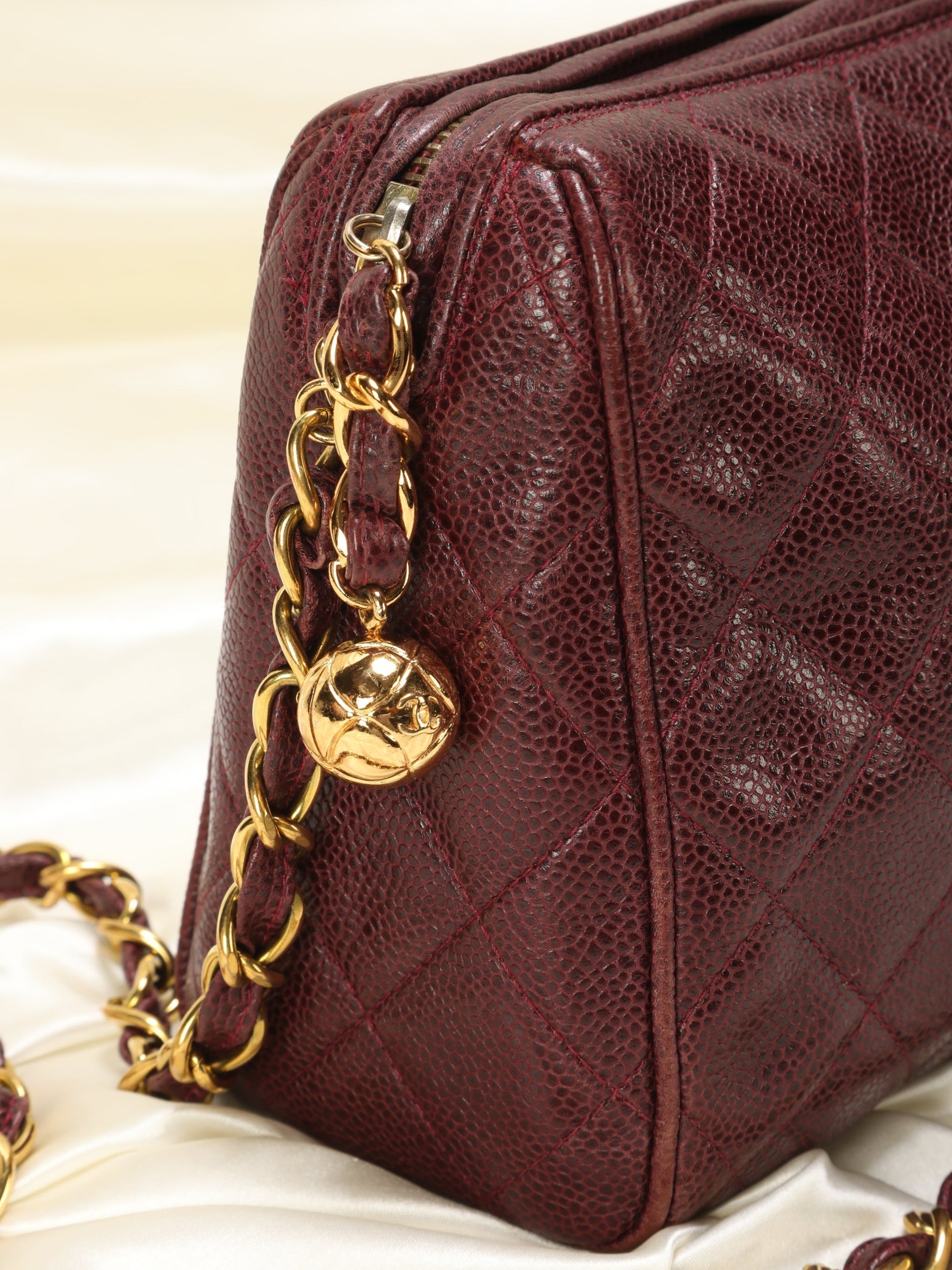 Chanel caviar bag in a gorgeous??wine-colored??hue combined with 24kt gold plated hardware. Classic Chanel chain. Crafted in the durable caviar material.??Chanel logo ball charm attached on zipper for added flare! 24kt gold plated hardware.